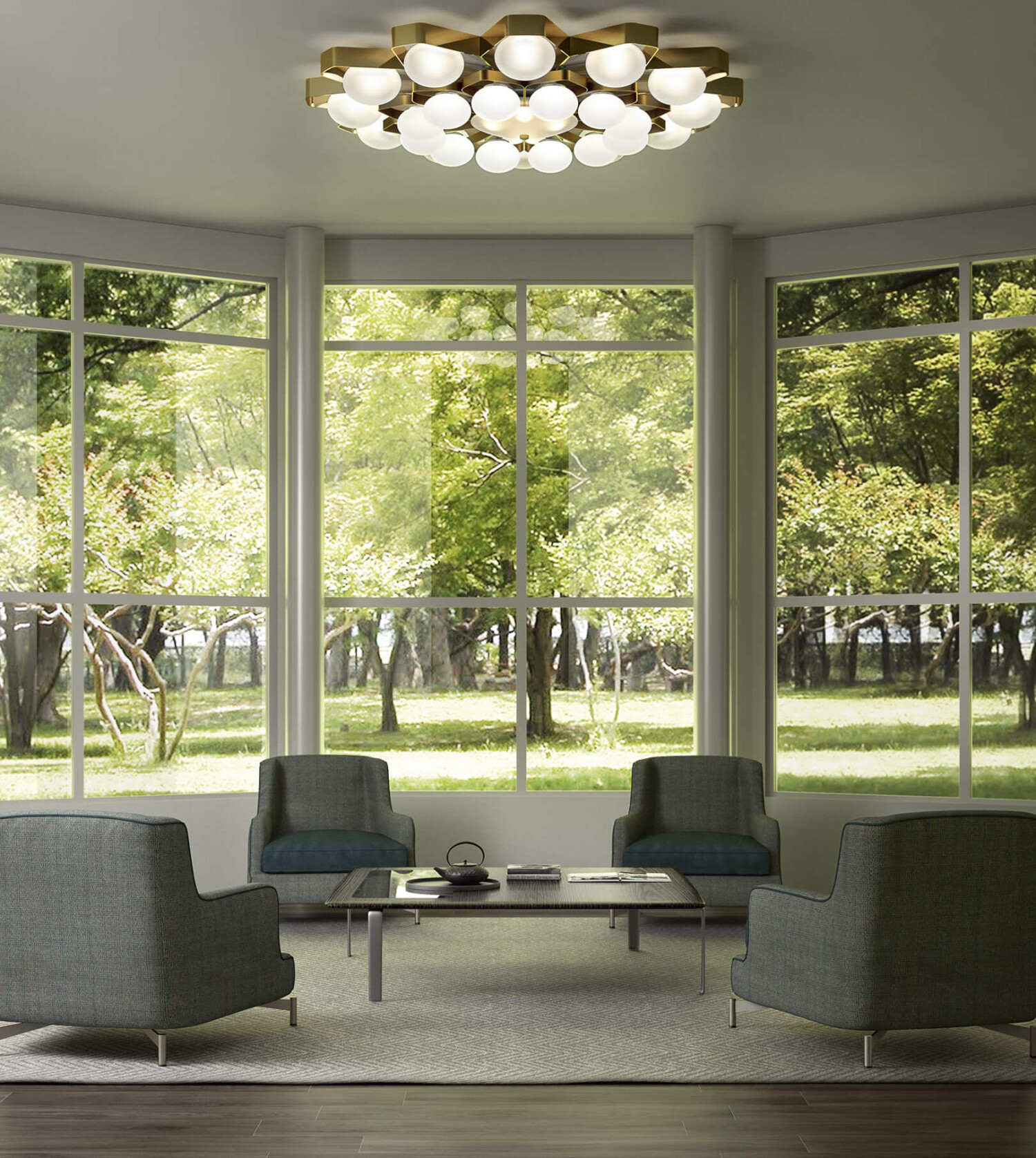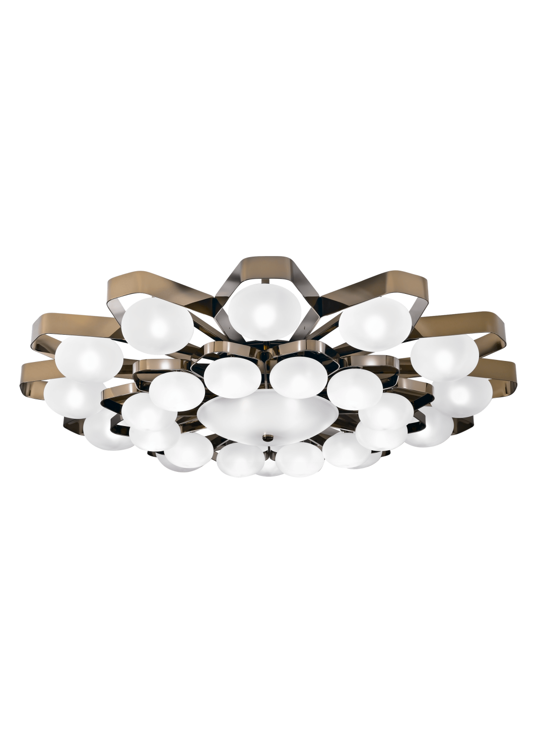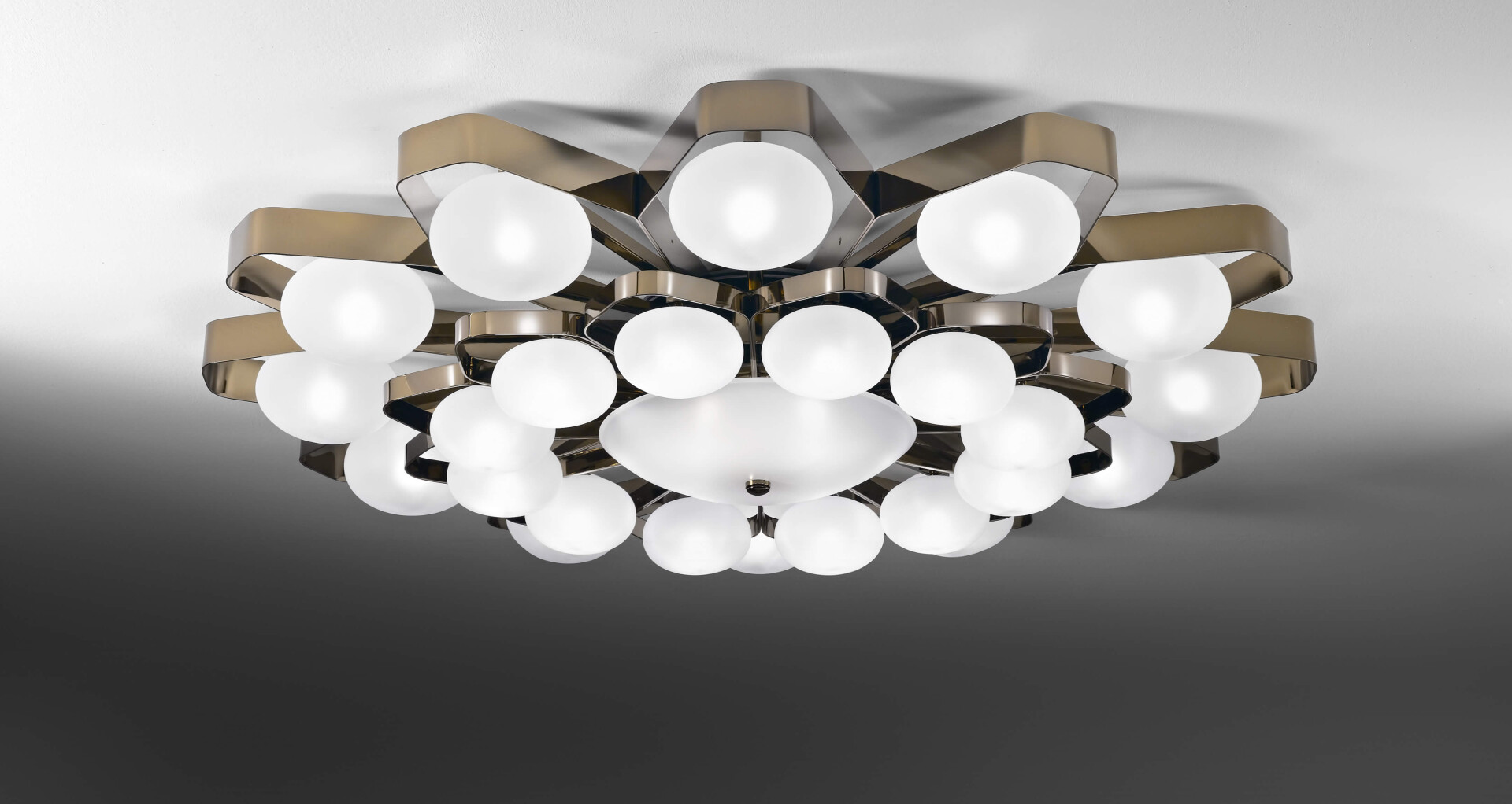 Потолочный светильник с отделкой из золота или никеля с рассеивателями из выдувного сатинированного стекла.