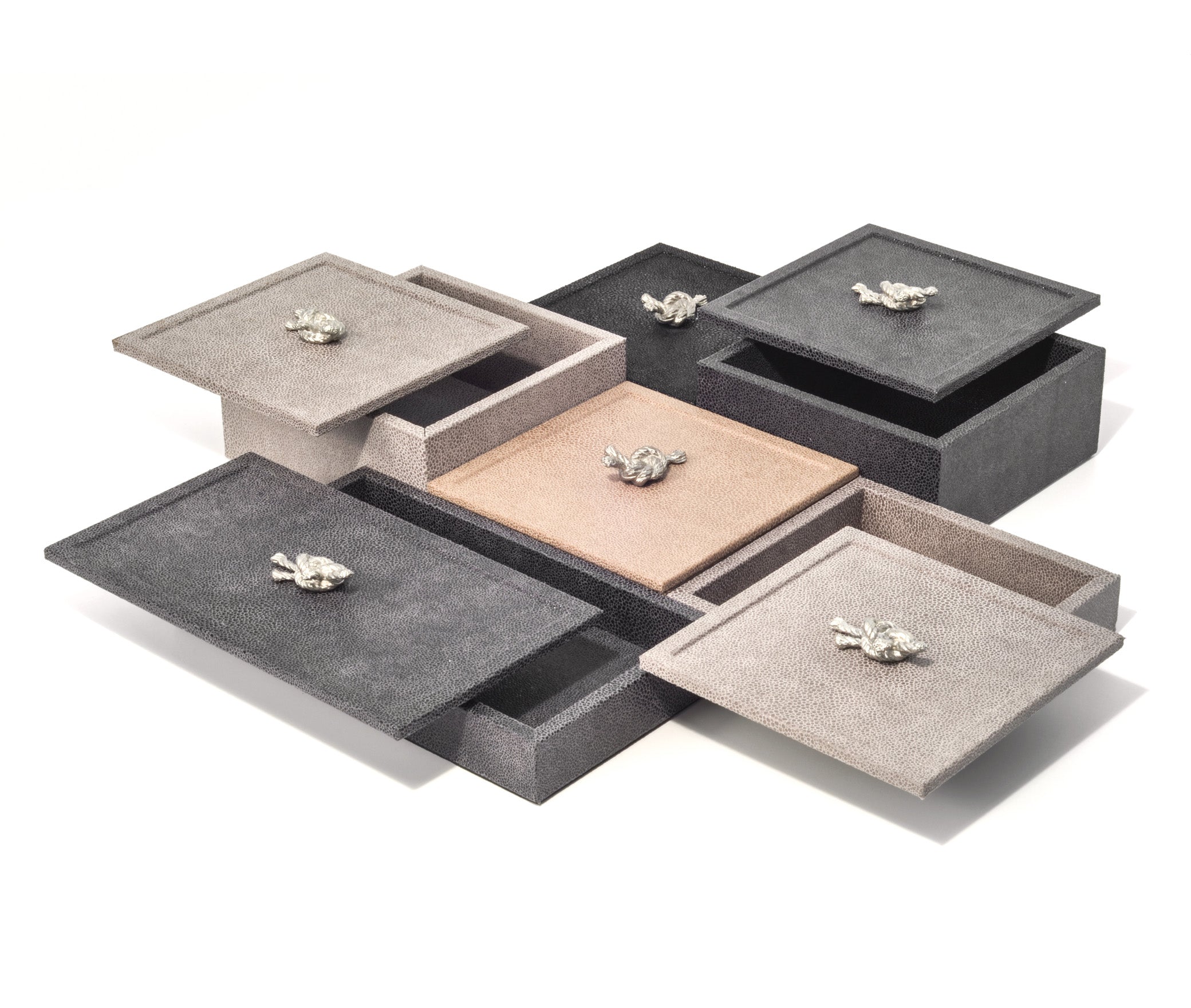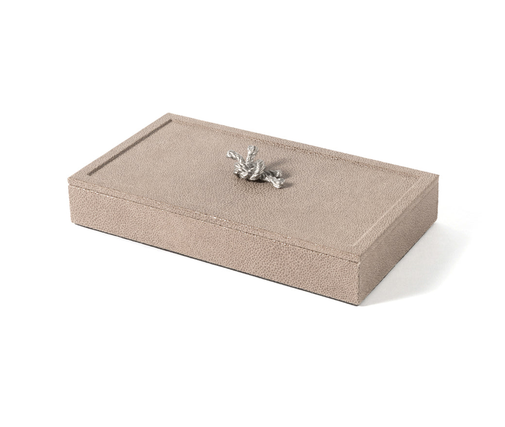 Изготовлена на прочной деревянной основе, полностью покрытой натуральной кожей, шкатулка Thalia украшена изящным металлическим узлом. Декоративные элементы доступны с позолотой 24 карата или полированной серебряной отделкой, что придаёт изделию дополнительную элегантность.