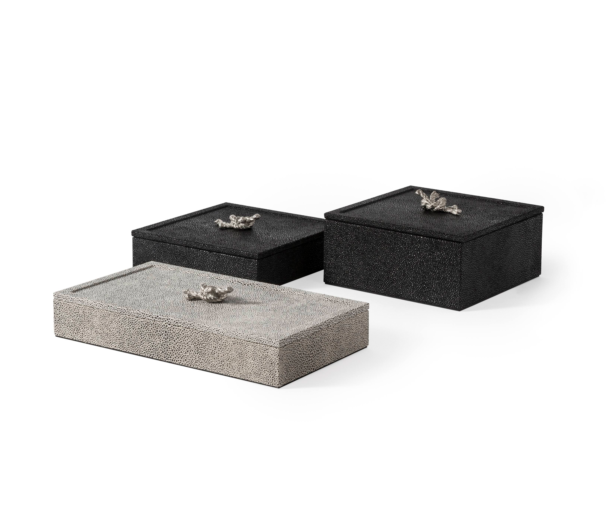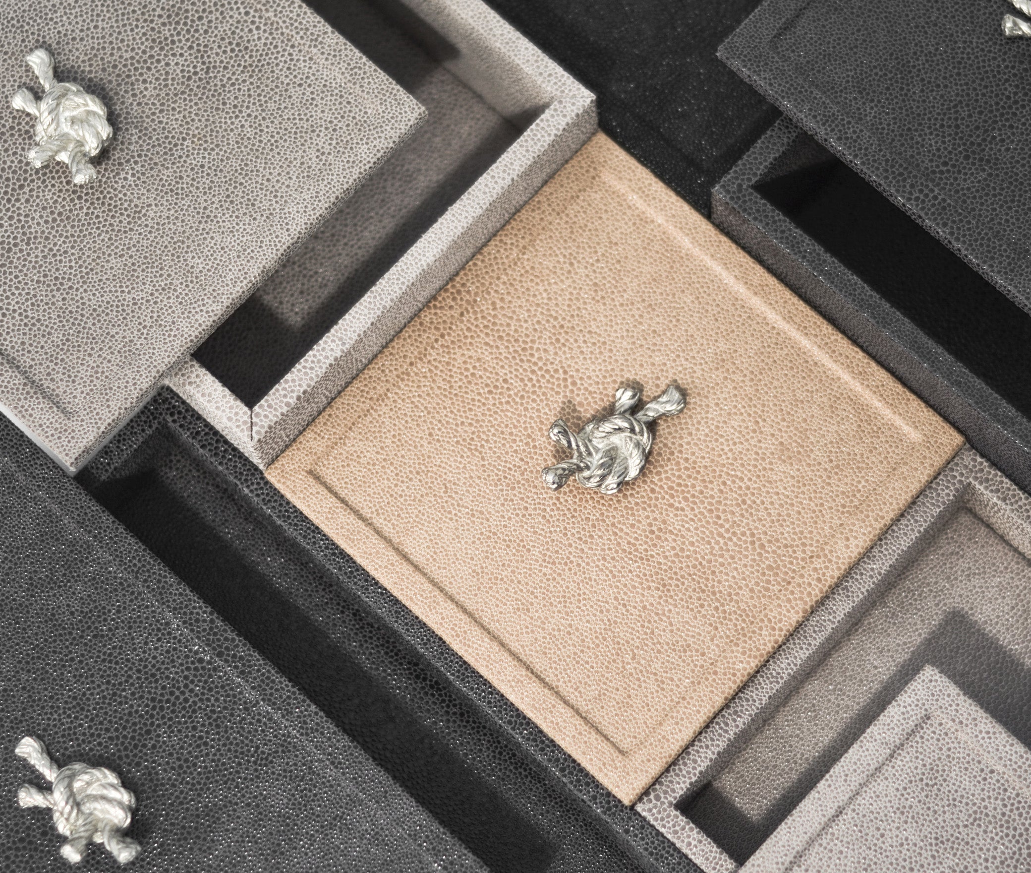 Квадратные шкатулки Thalia выполнены из дерева и полностью обтянуты натуральной кожей. Элегантный металлический узел служит изысканным декоративным элементом, доступным с покрытием из 24-каратного золота или отполированного серебра.