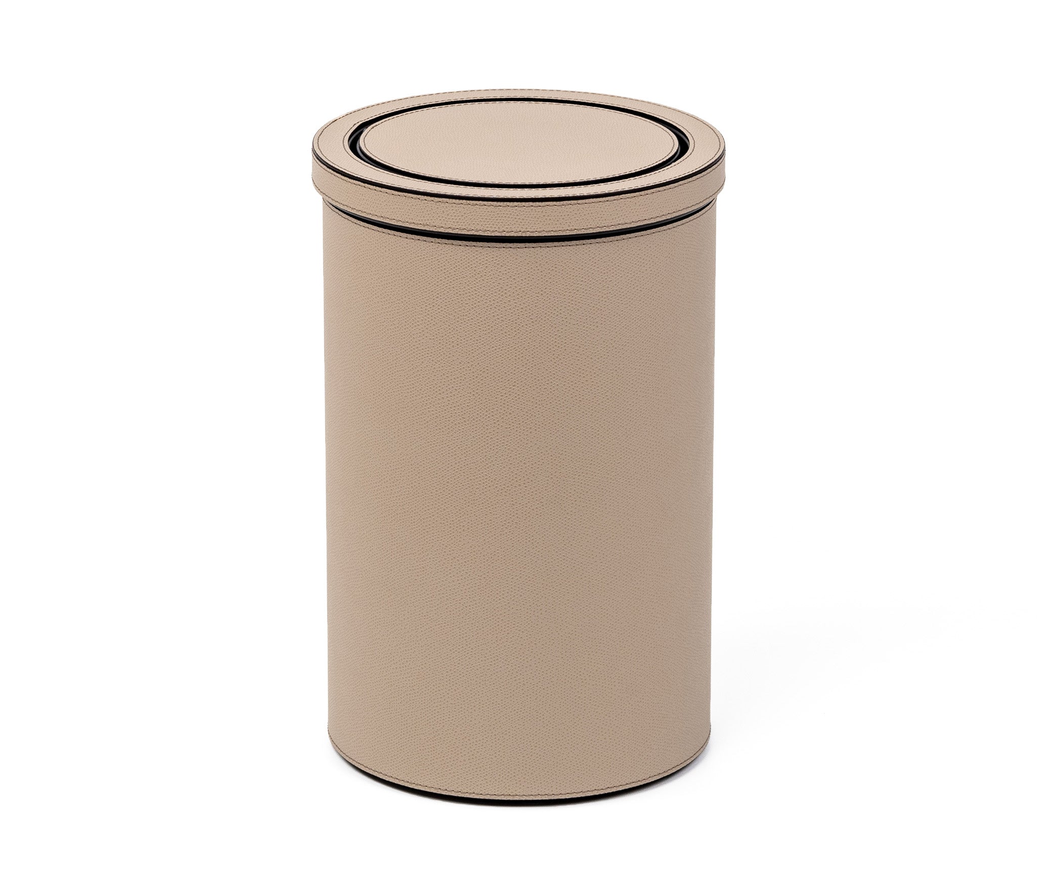 Цилиндрическая и современная форма с тонкими деталями. Круглая металлическая урна с откидной крышкой идеально подходит для использования в ванной комнате.