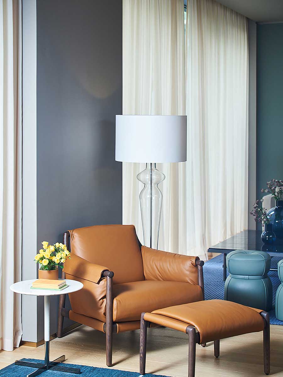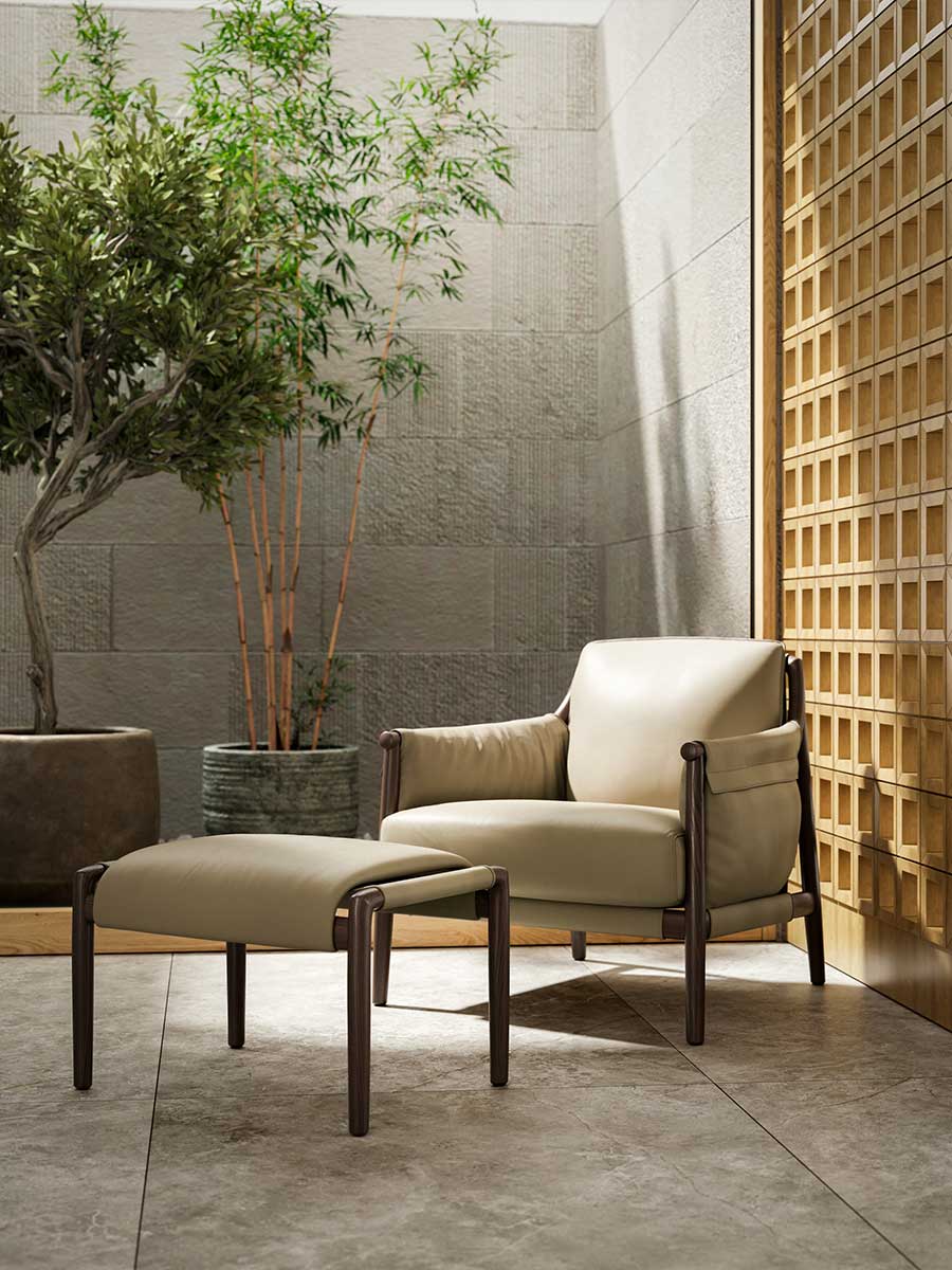 Каркас пуфа Times Lounge выполнен из массива ясеня и отличается двумя круглыми ножками по бокам, соединенными двумя овальными перекладинами, которые перекликаются с дизайном кресла. Пуф доступен в отделке цвета мокко или венге. Полоса из кожи Pelle Frau® образует упругую поверхность, на которую натянут второй мягкий чехол из пенополиуретана и полиэстеровой ваты. Обивка доступна из кожи Pelle Frau® или ткани. В обоих случаях верхний мягкий чехол можно снять.