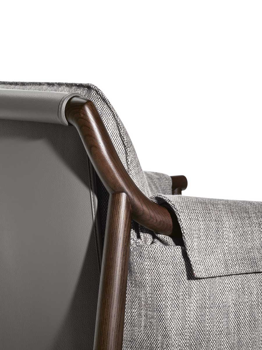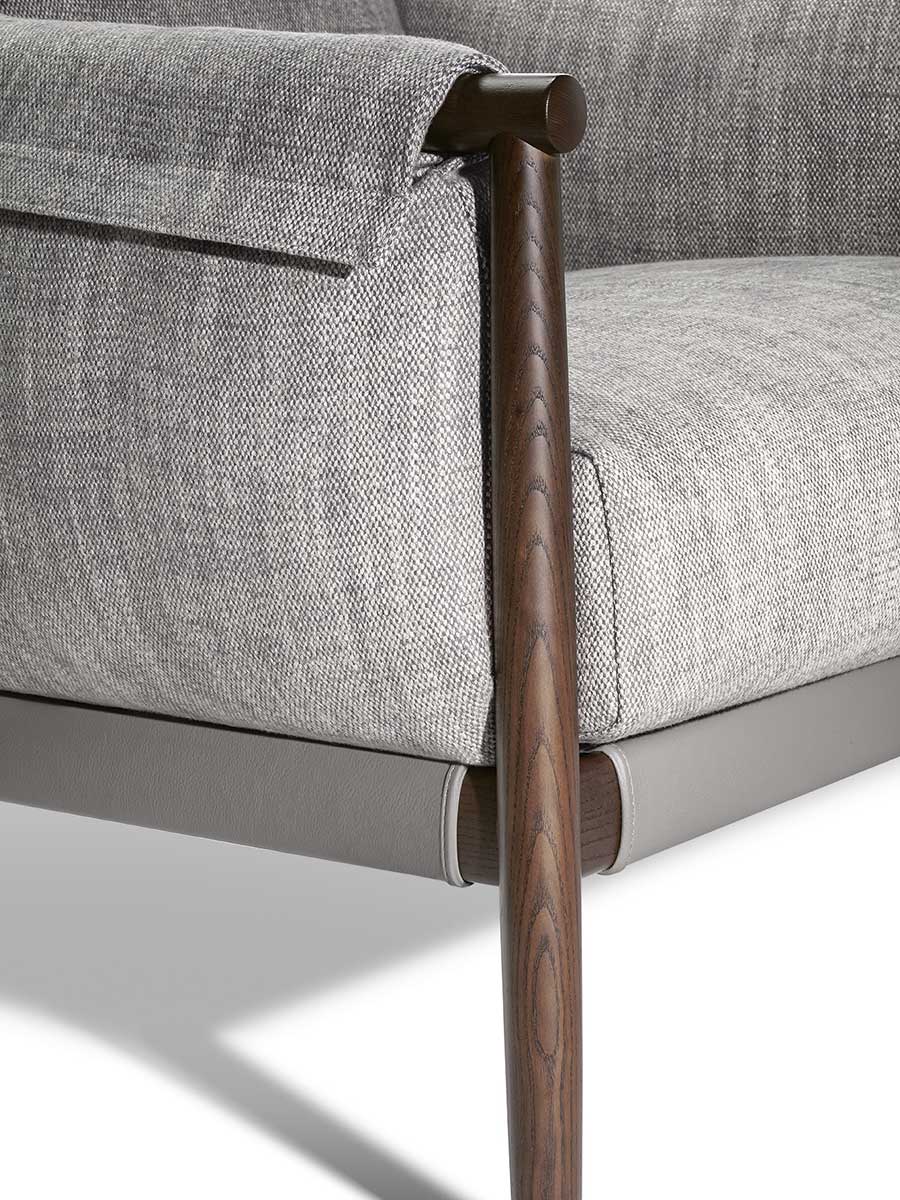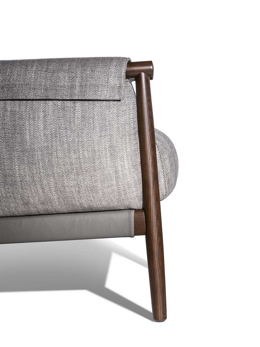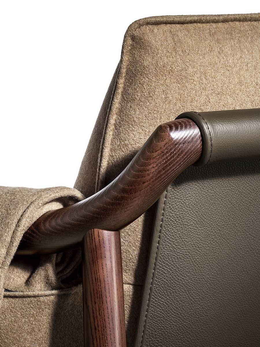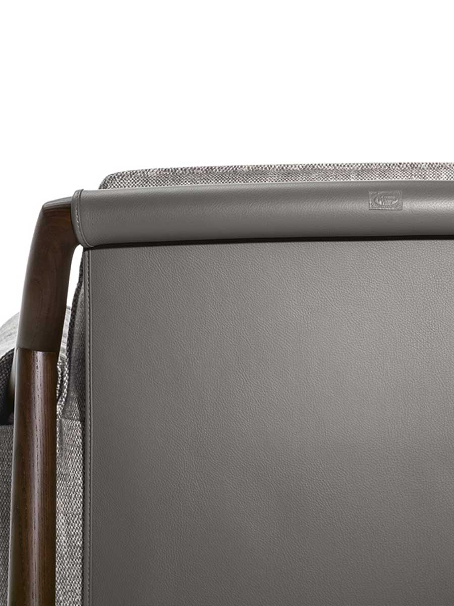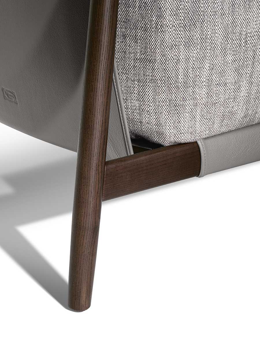 Каркас кресла Times Lounge изготовлен из массива ясеня, окрашенного в цвет мокко или венге. Древесина имеет круглое сечение и овальное сечение для нижних соединительных балок. Опора подушки кресла охватывает деревянную конструкцию и выполнена из кожи Pelle Frau®. Под сиденьем расположен поддерживающий технический текстиль, который выполняет функцию пружины. Подушки сиденья и спинки наполнены пенополиуретаном и полиэстерным ватом, а подлокотники – полиэстерным ватом. Обивка подушек спинки и подлокотников сшита как единое целое, обивка подушки сиденья – отдельная и крепится к остальной обивке. Подушки крепятся к каркасу с помощью потайных молний и кнопок. Подушки также могут быть обтянуты кожей Pelle Frau® или тканью. В обоих случаях чехол можно снять. Дополнительный чехол можно приобрести отдельно.
