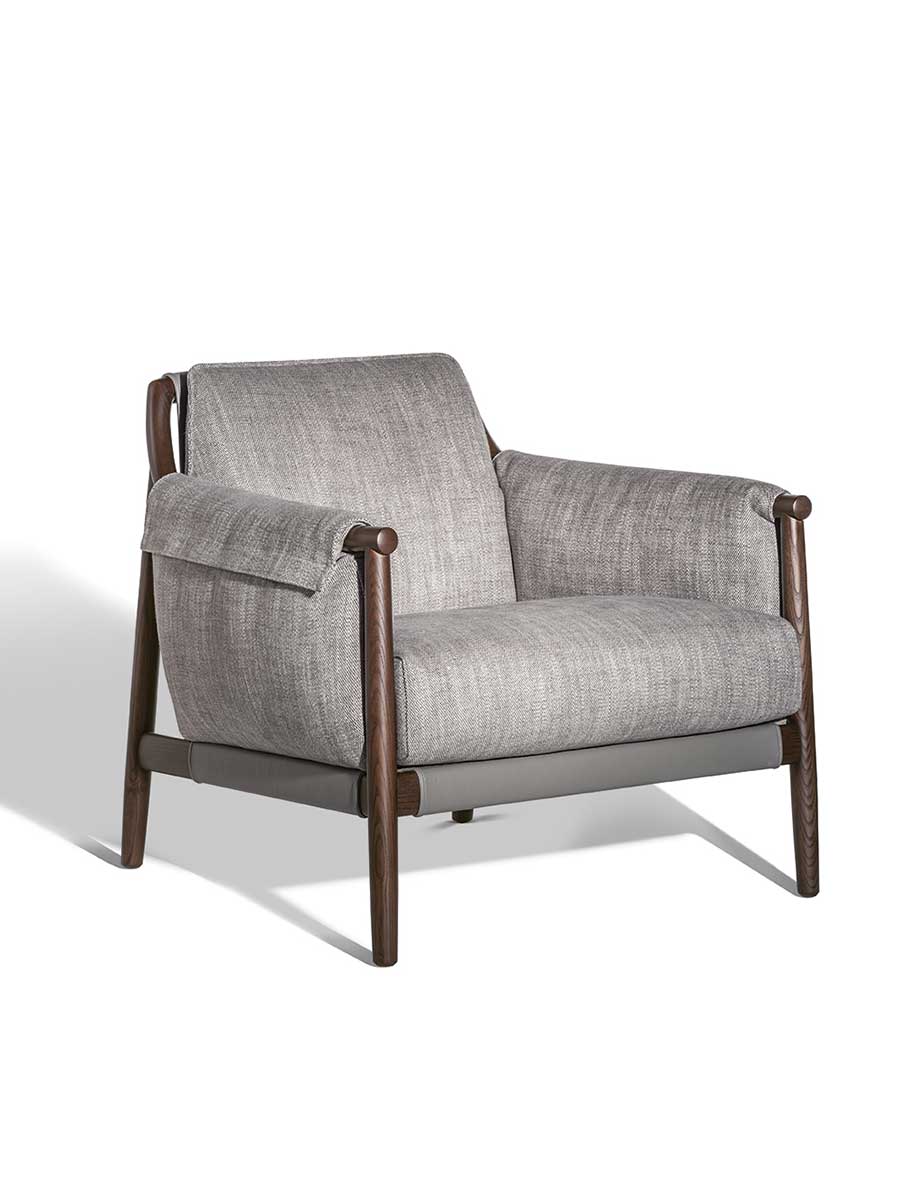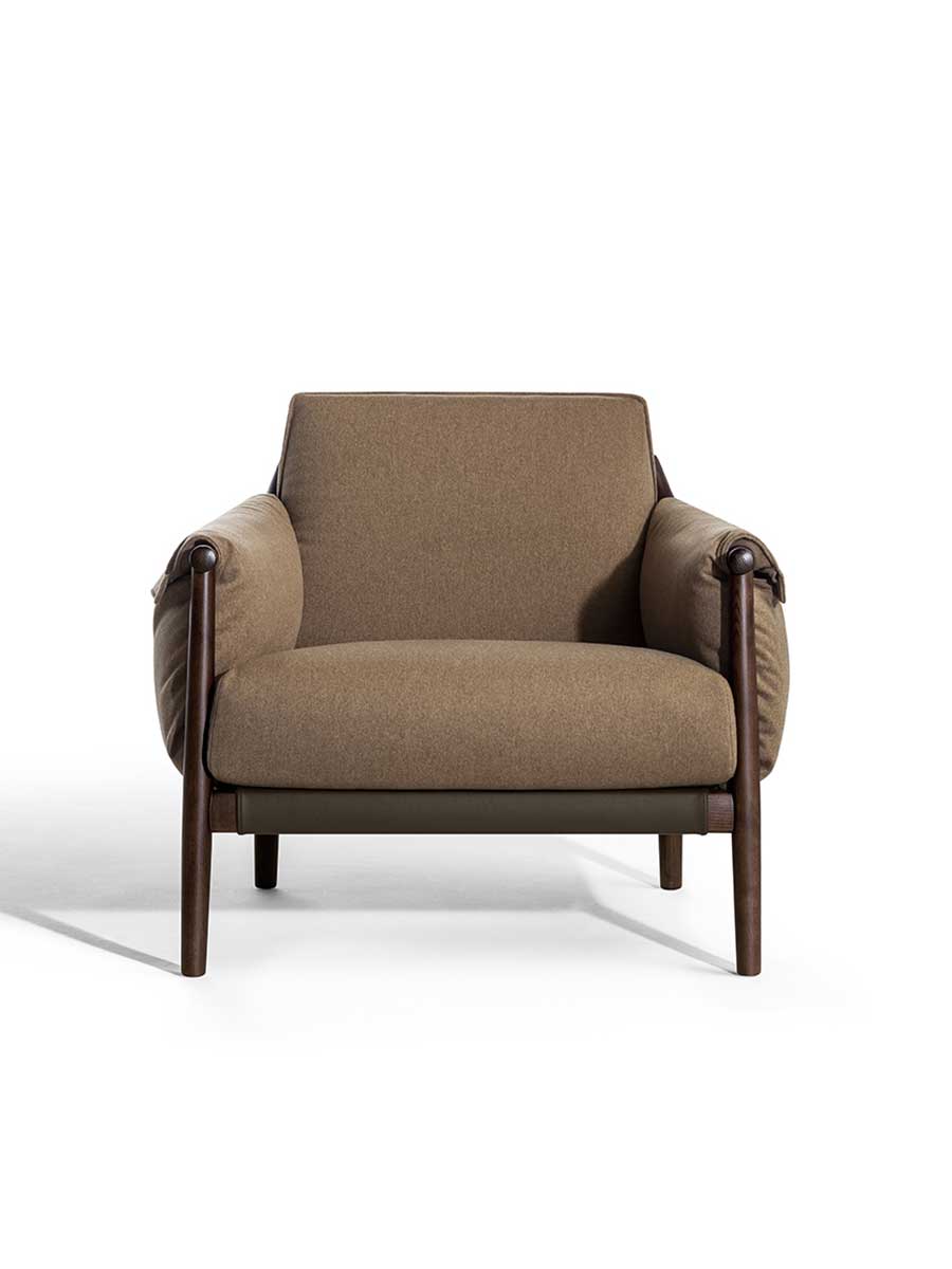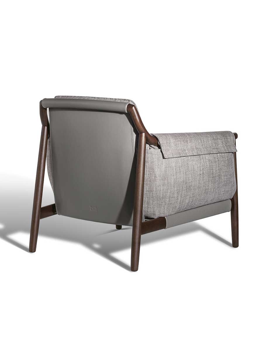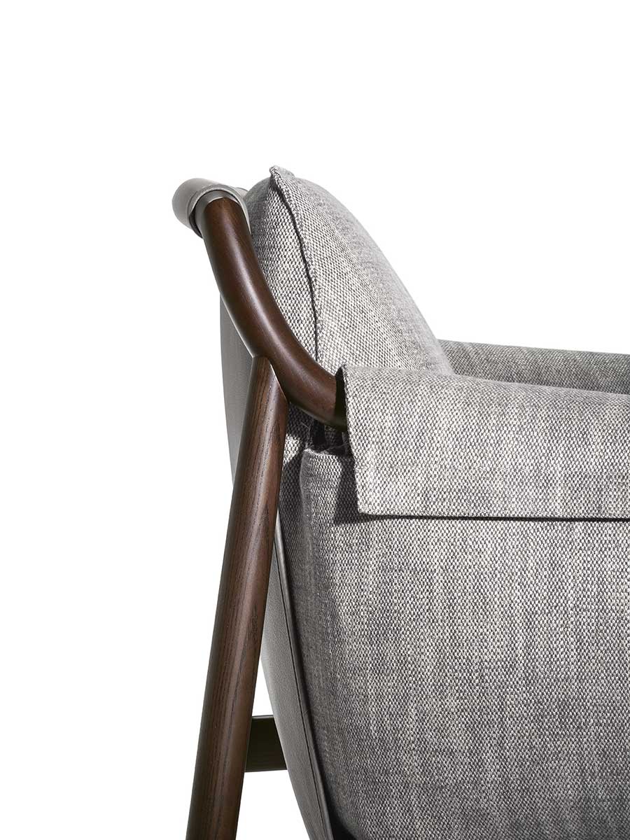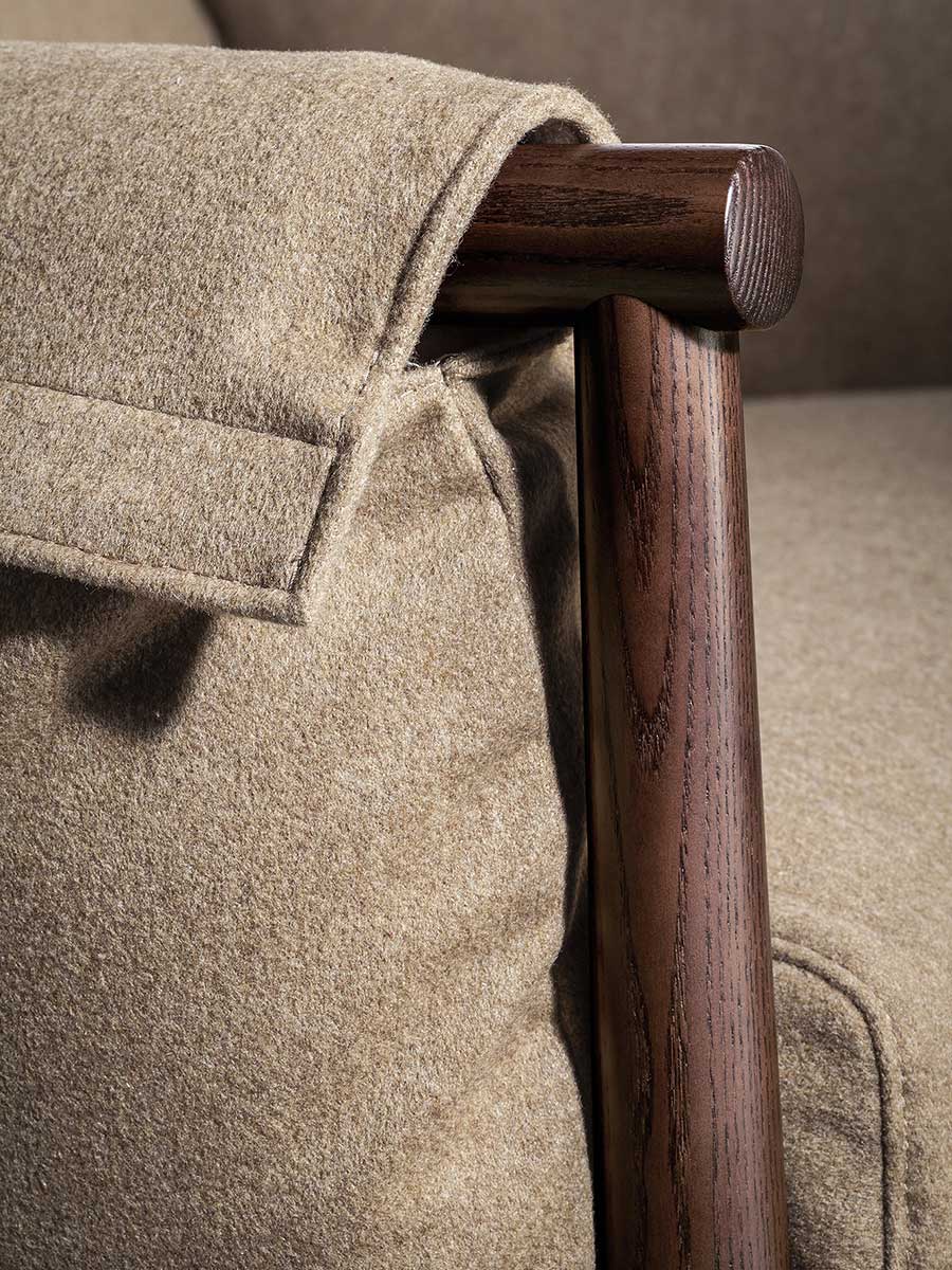 Каркас кресла Times Lounge изготовлен из массива ясеня, окрашенного в цвет мокко или венге. Древесина имеет круглое сечение и овальное сечение для нижних соединительных балок. Опора подушки кресла охватывает деревянную конструкцию и выполнена из кожи Pelle Frau®. Под сиденьем расположен поддерживающий технический текстиль, который выполняет функцию пружины. Подушки сиденья и спинки наполнены пенополиуретаном и полиэстерным ватом, а подлокотники – полиэстерным ватом. Обивка подушек спинки и подлокотников сшита как единое целое, обивка подушки сиденья – отдельная и крепится к остальной обивке. Подушки крепятся к каркасу с помощью потайных молний и кнопок. Подушки также могут быть обтянуты кожей Pelle Frau® или тканью. В обоих случаях чехол можно снять. Дополнительный чехол можно приобрести отдельно.