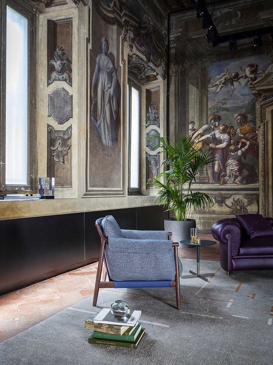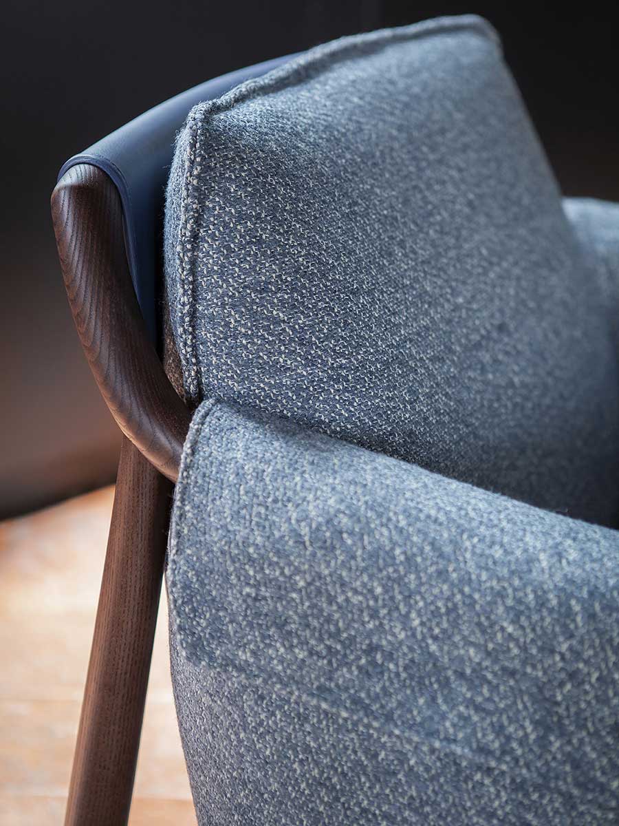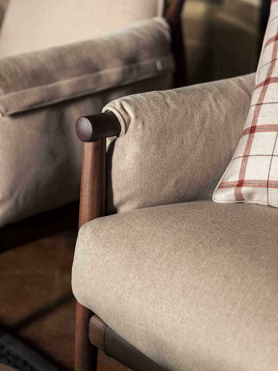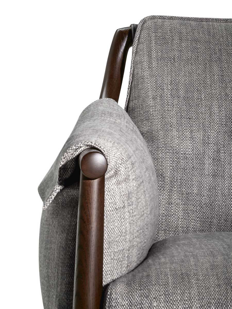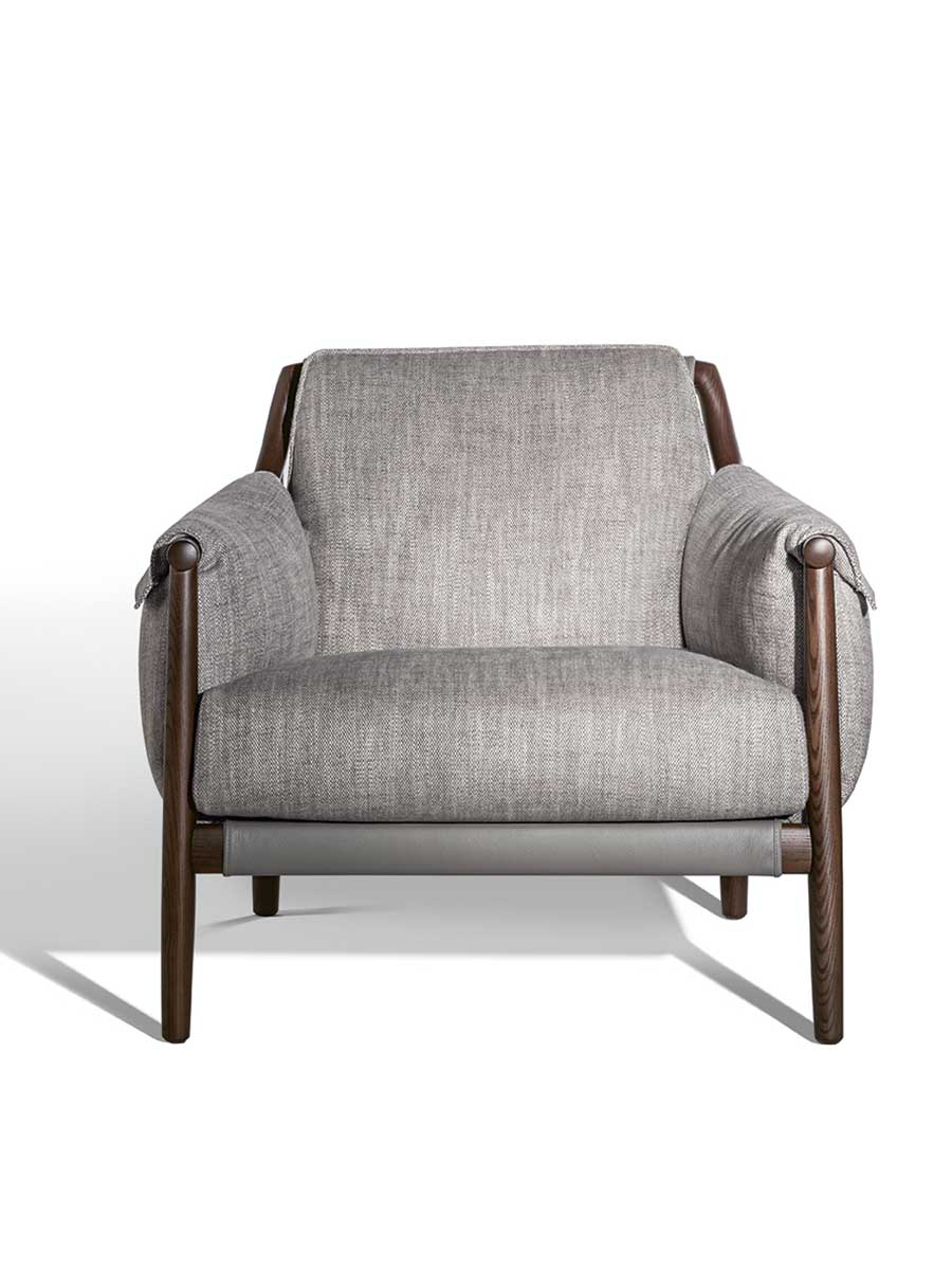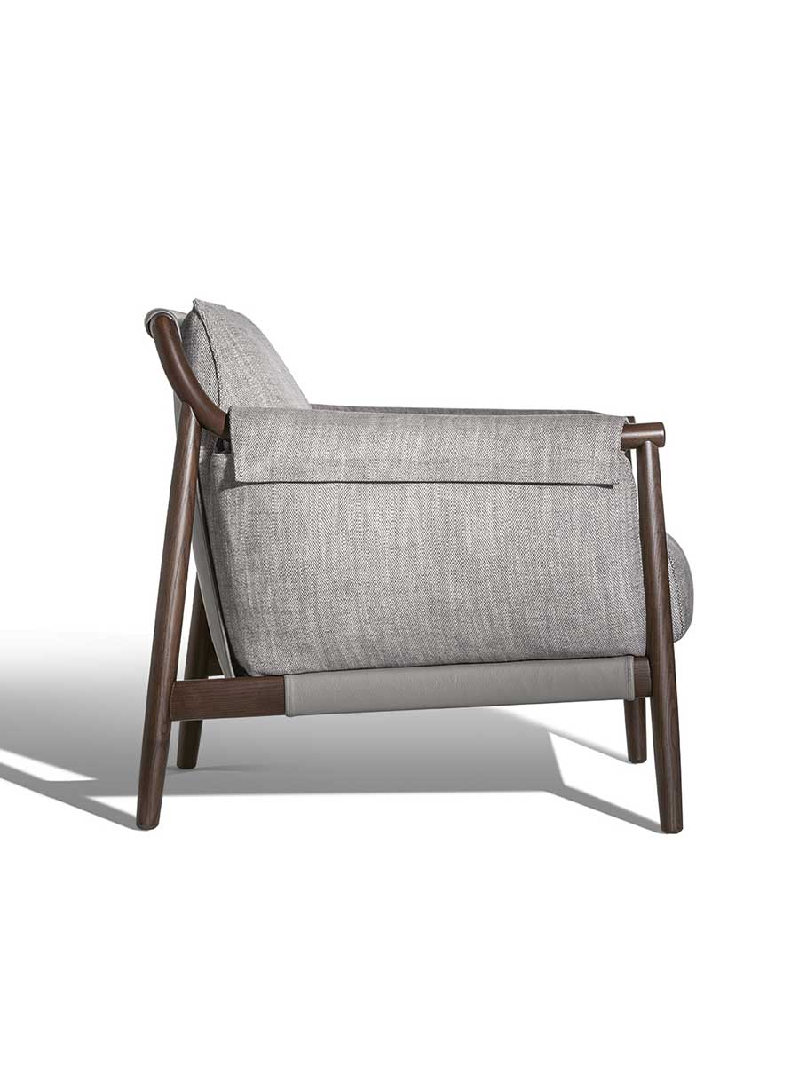 Каркас кресла Times Lounge изготовлен из массива ясеня, окрашенного в цвет мокко или венге. Древесина имеет круглое сечение и овальное сечение для нижних соединительных балок. Опора подушки кресла охватывает деревянную конструкцию и выполнена из кожи Pelle Frau®. Под сиденьем расположен поддерживающий технический текстиль, который выполняет функцию пружины. Подушки сиденья и спинки наполнены пенополиуретаном и полиэстерным ватом, а подлокотники – полиэстерным ватом. Обивка подушек спинки и подлокотников сшита как единое целое, обивка подушки сиденья – отдельная и крепится к остальной обивке. Подушки крепятся к каркасу с помощью потайных молний и кнопок. Подушки также могут быть обтянуты кожей Pelle Frau® или тканью. В обоих случаях чехол можно снять. Дополнительный чехол можно приобрести отдельно.