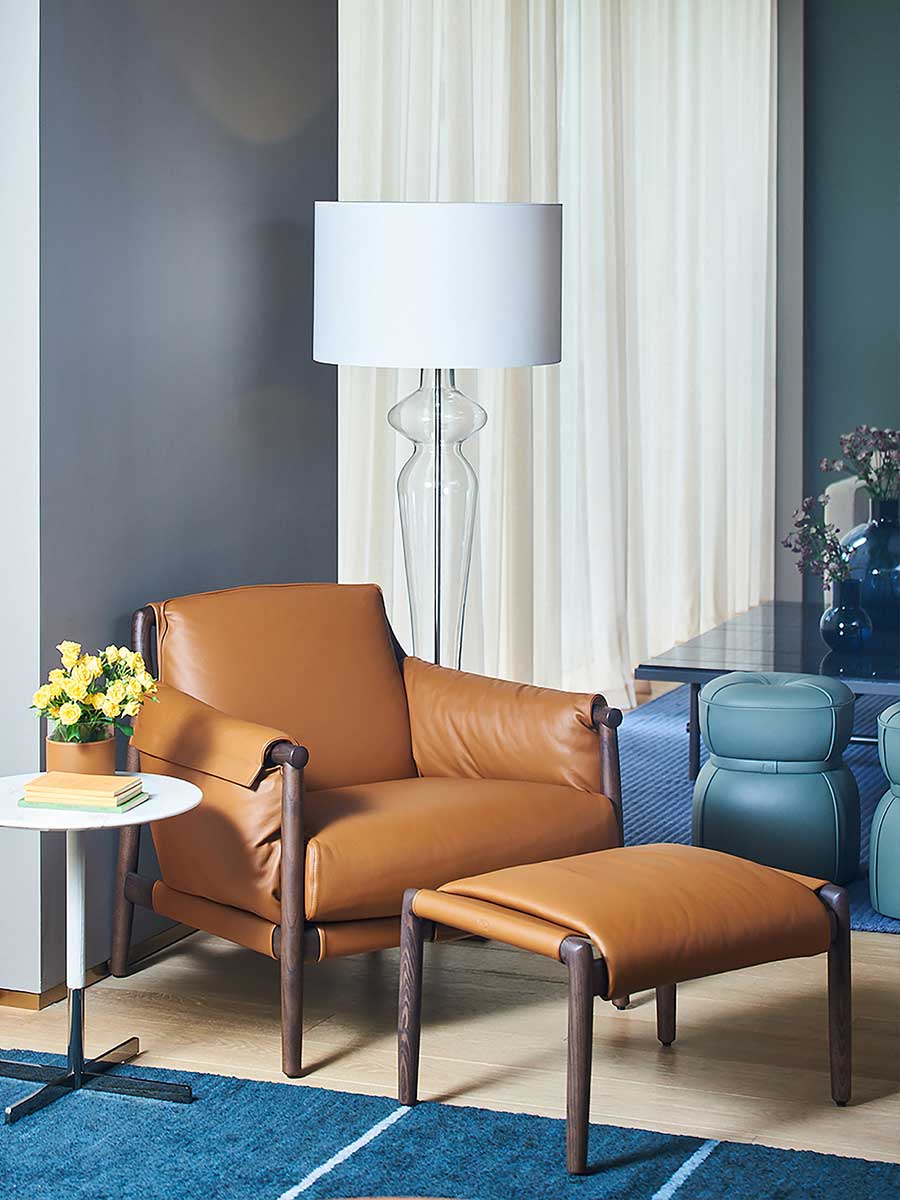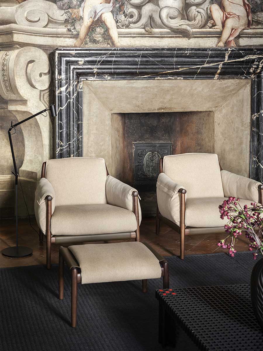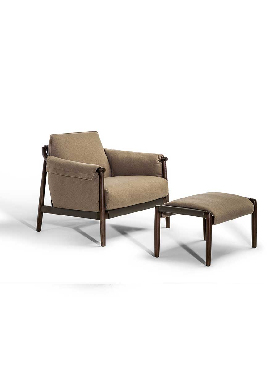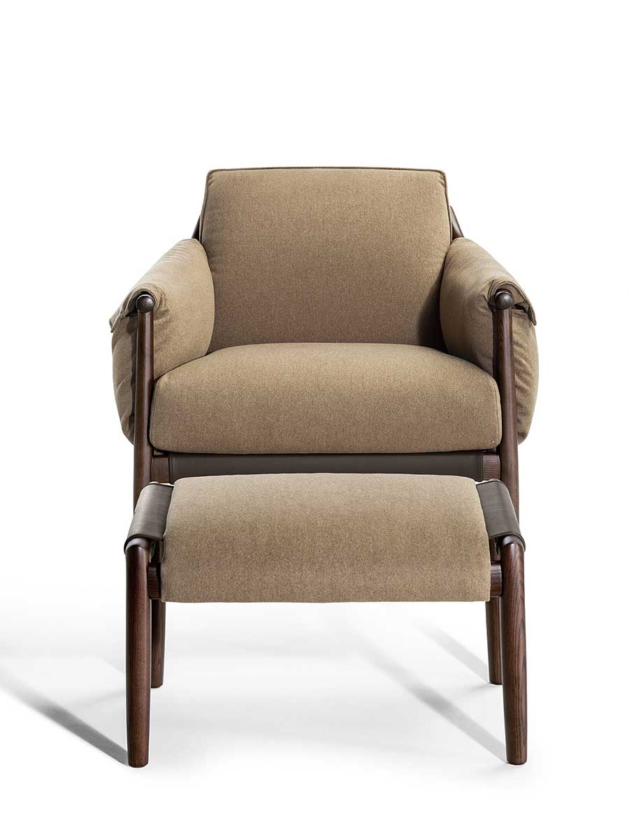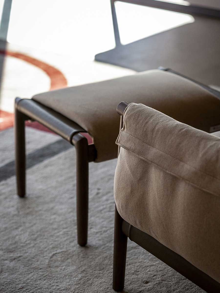 Каркас пуфа Times Lounge выполнен из массива ясеня и отличается двумя круглыми ножками по бокам, соединенными двумя овальными перекладинами, которые перекликаются с дизайном кресла. Пуф доступен в отделке цвета мокко или венге. Полоса из кожи Pelle Frau® образует упругую поверхность, на которую натянут второй мягкий чехол из пенополиуретана и полиэстеровой ваты. Обивка доступна из кожи Pelle Frau® или ткани. В обоих случаях верхний мягкий чехол можно снять.