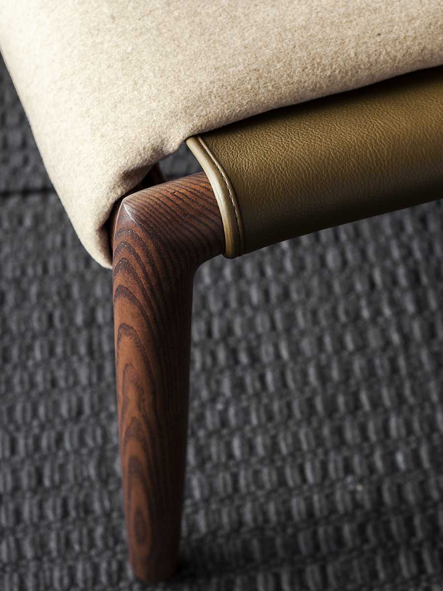 Каркас кресла Times Lounge изготовлен из массива ясеня, окрашенного в цвет мокко или венге. Древесина имеет круглое сечение и овальное сечение для нижних соединительных балок. Опора подушки кресла охватывает деревянную конструкцию и выполнена из кожи Pelle Frau®. Под сиденьем расположен поддерживающий технический текстиль, который выполняет функцию пружины. Подушки сиденья и спинки наполнены пенополиуретаном и полиэстерным ватом, а подлокотники – полиэстерным ватом. Обивка подушек спинки и подлокотников сшита как единое целое, обивка подушки сиденья – отдельная и крепится к остальной обивке. Подушки крепятся к каркасу с помощью потайных молний и кнопок. Подушки также могут быть обтянуты кожей Pelle Frau® или тканью. В обоих случаях чехол можно снять. Дополнительный чехол можно приобрести отдельно.