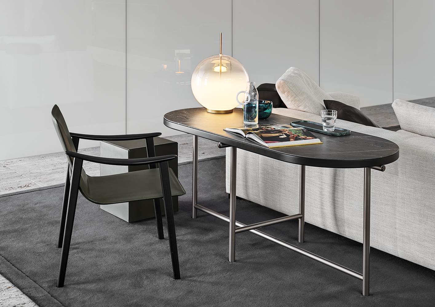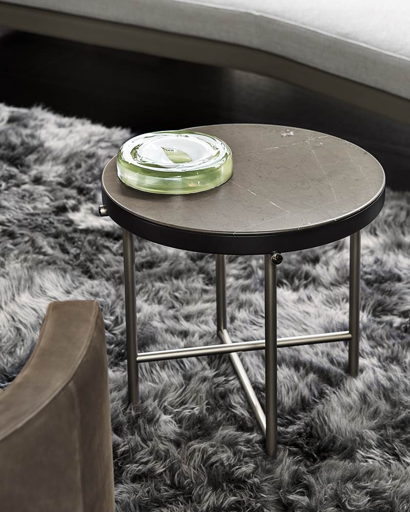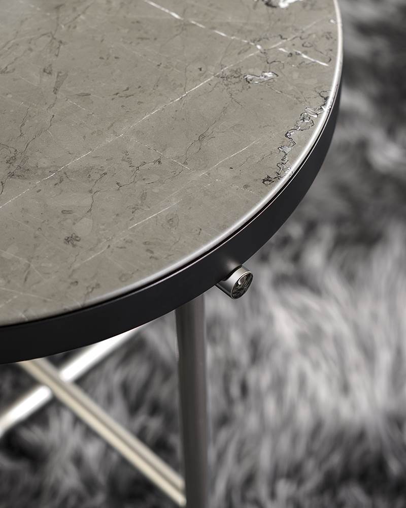 Материалы: столешница — мрамор, шпон или стекло; основание — металл в отделке Black-Nickel или матовый лак