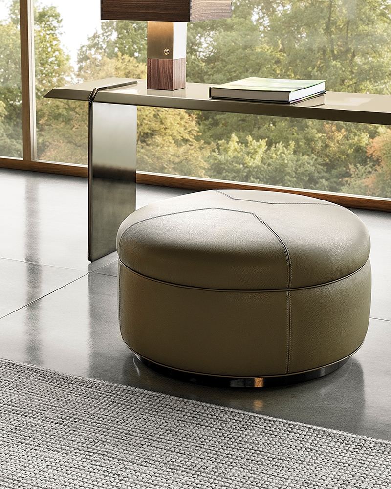 Tuffet — современное прочтение марокканского пуфа с мягкими линиями и округлой формой. Обивка, доступная в ткани или коже, полностью съемная и украшена декоративной прострочкой, подчёркивающей силуэт. Модель снабжена пятью скрытыми поворотными колесиками, обеспечивающими лёгкость передвижения.