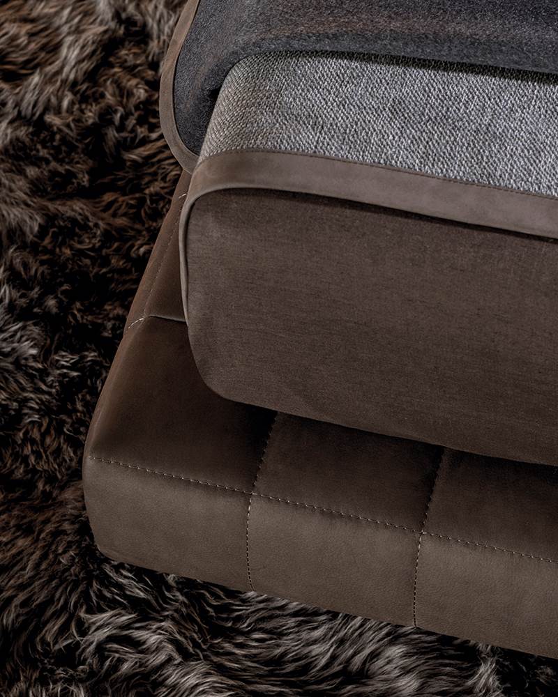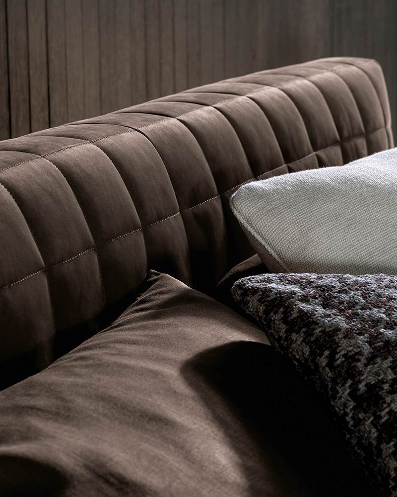 Twiggy Bed — изысканная кровать с характерным дизайном: мягкое изголовье в виде двух широких подушек с отстрочкой создаёт уютное ощущение, а низкое основание с утопленными ножками обеспечивает визуальную лёгкость. Доступна в отделке тканью или кожей. Каркас — из фанеры и металла.