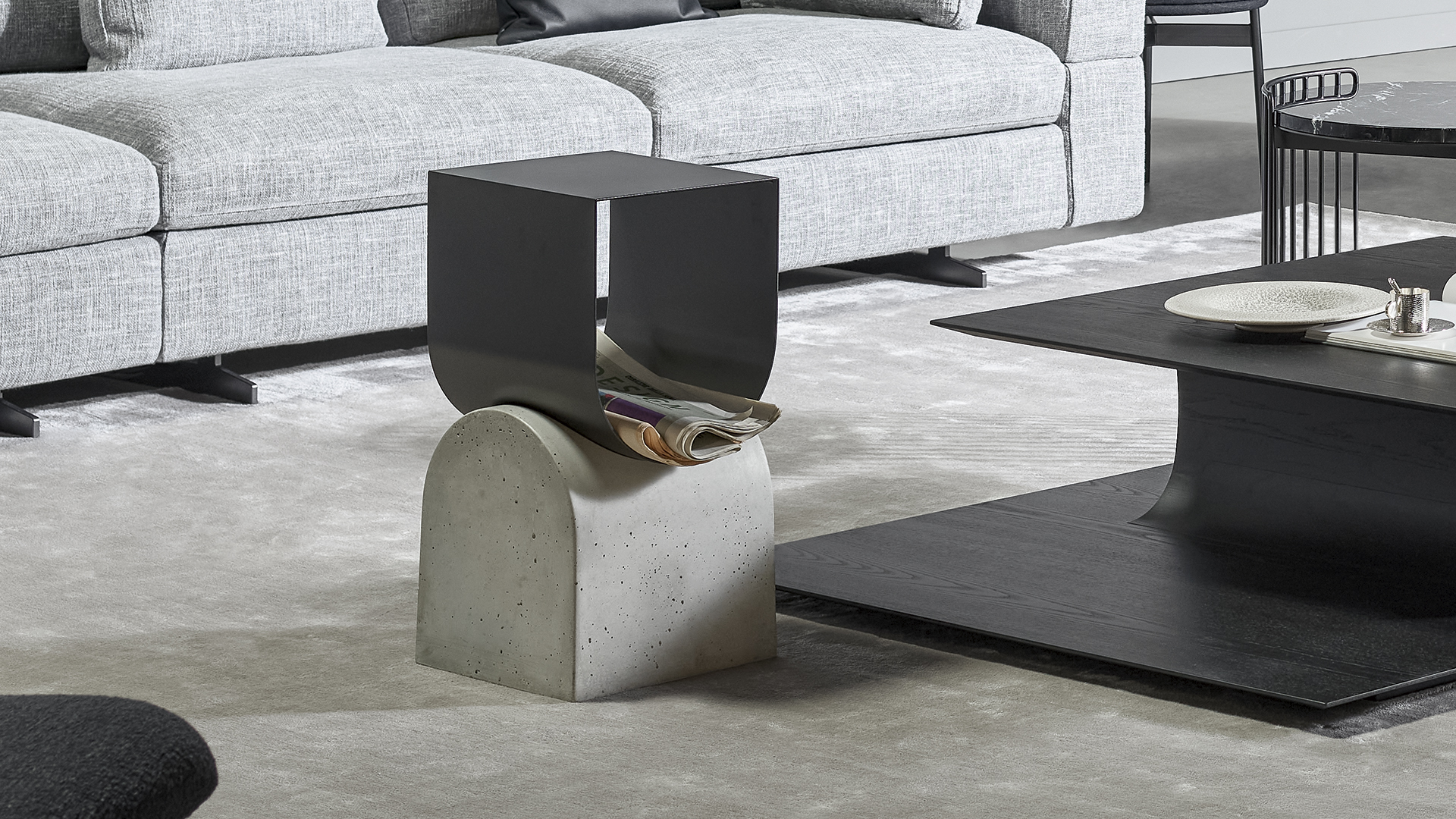 Журнальная подставка Vague сочетает в себе массивность и лёгкость — бетонное основание придаёт устойчивость, а изогнутая металлическая верхняя часть добавляет воздушности.