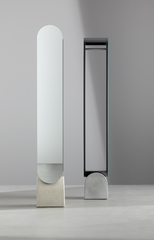 Они соединены металлической рамой с перекладиной, на которую можно повесить одежду. Таким образом, Vague сочетает эстетику зеркала с удобством и функциональностью напольной вешалки.