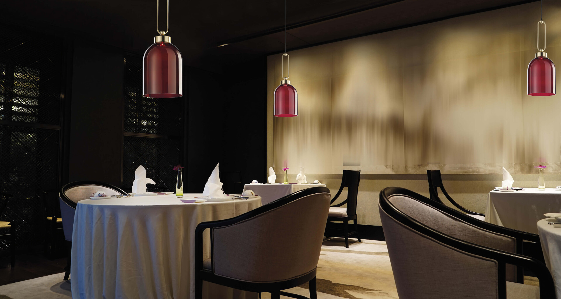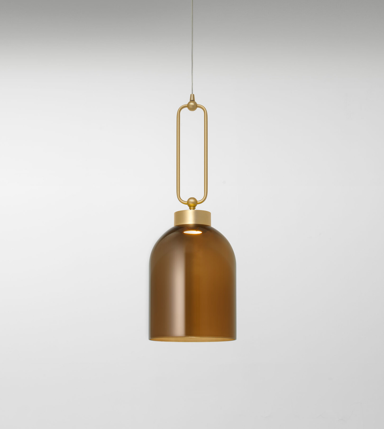 Подвесной светильник из металла с отделкой из матового золота или серого железа и рассеивателем из красного, дымчатого или агатового стекла.