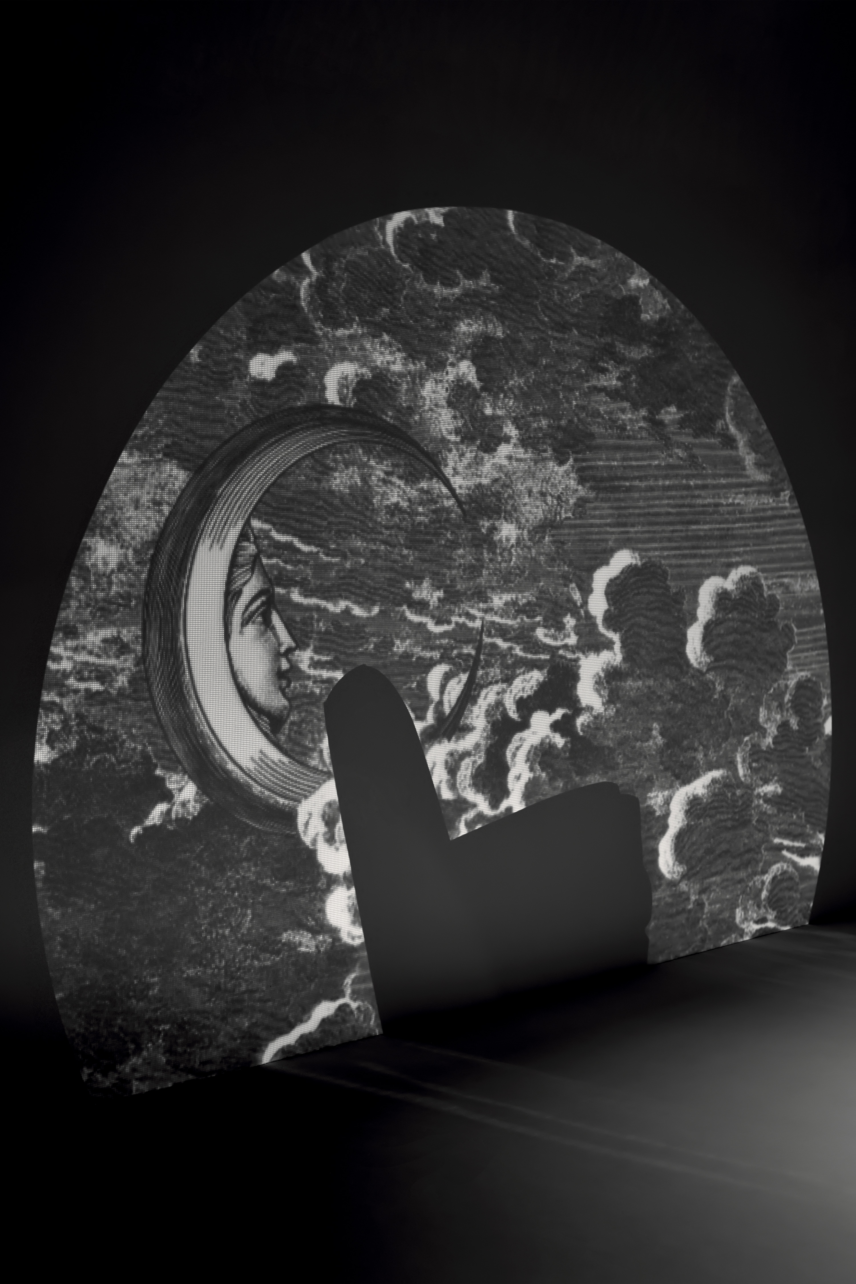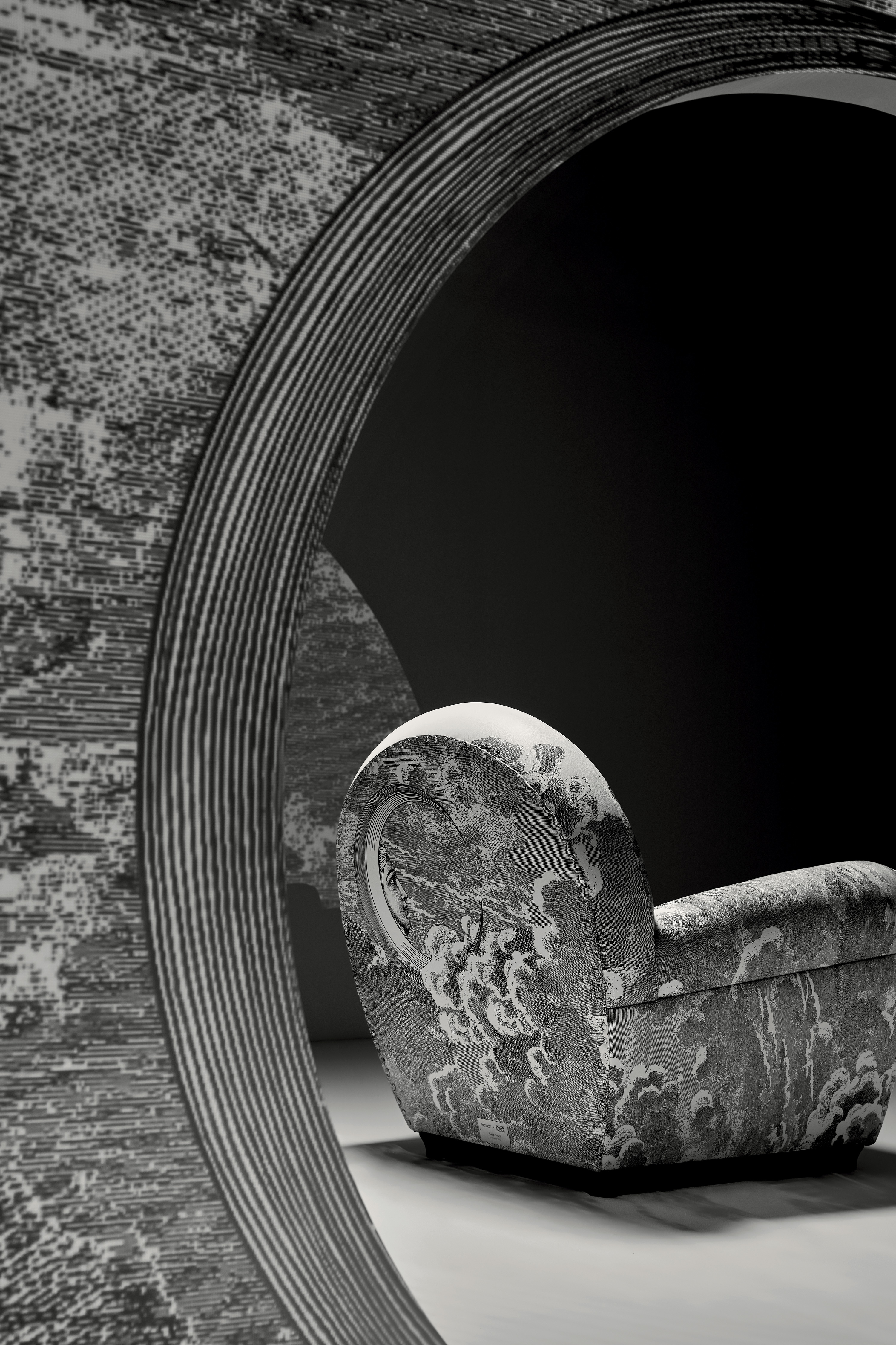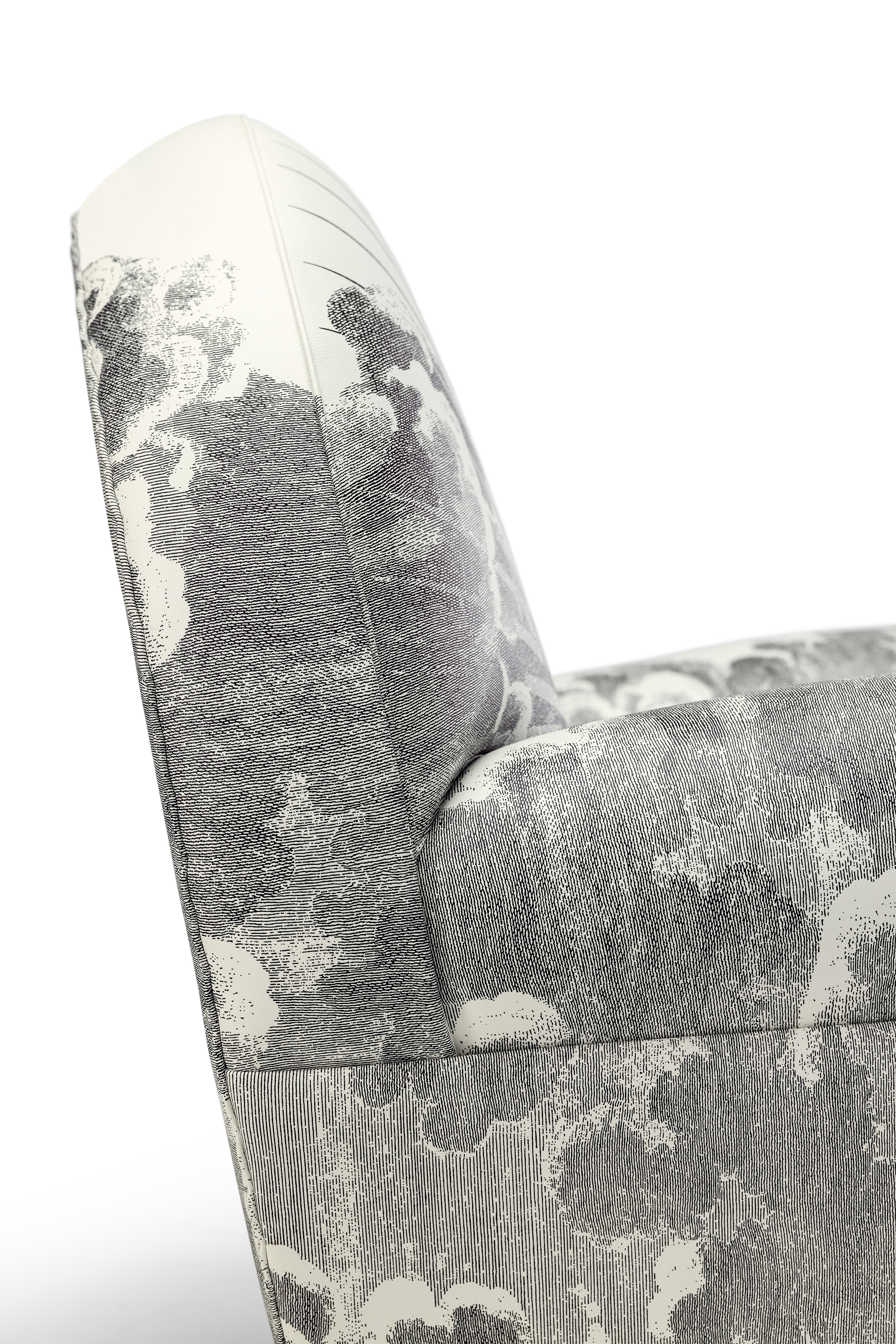 Задняя и боковые части кресла украшены рядом обтянутых кожей гвоздей. Подкладка выполнена из кожи Pelle Frau® Impact Less с лёгким цифровым принтом и рельефным эффектом. На задней стороне спинки расположена пластина с серым покрытием, имитирующим ствол оружия, с логотипом Fornasetti x Poltrona Frau® и серийным номером.