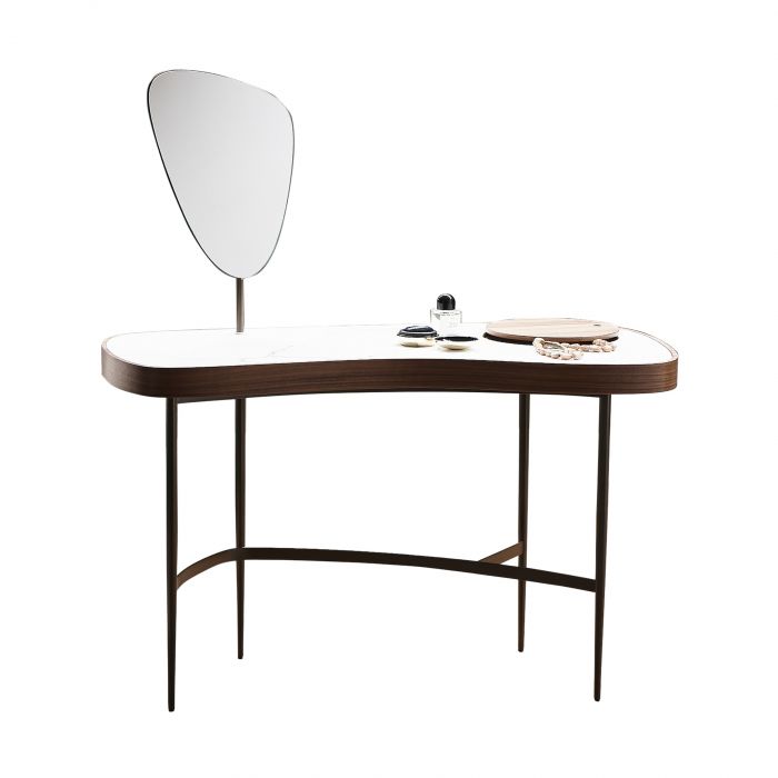 Функциональность трюмо расширяется за счёт продуманных деталей: поворотное зеркало для макияжа и удобный ящик с крышкой из орехового дерева, идеально подходящий для хранения украшений и мелочей повседневного обихода. Особенность конструкции — изогнутый элемент основания, уходящий вглубь, придающий всей форме динамику и лёгкость.