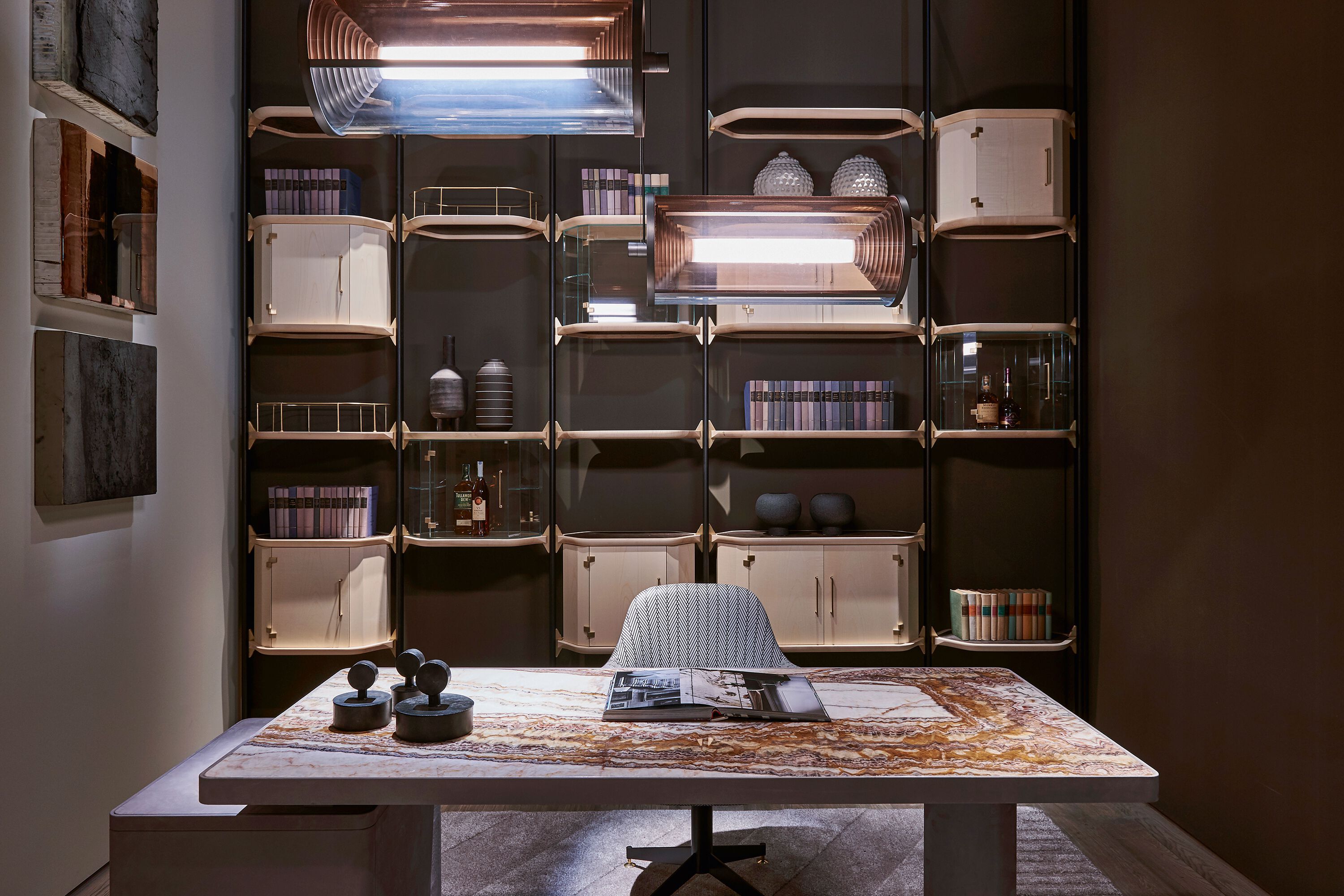 Verba Volant Slim — это прямоугольный стол для руководителей с полками. Структура из фанеры с розовым деревом. Столешница с рамкой из твердой древесины тюлипиера, покрытая кожей. Внутренняя часть столешницы из MDF, покрытая кожей или камнем с водоотталкивающей защитной пропиткой. Ножка, покрытая кожей, или выполненная из сатинированной латуни, ручной отделки потемненного металла или сатинированного никелированного металла с матовой восковой отделкой.