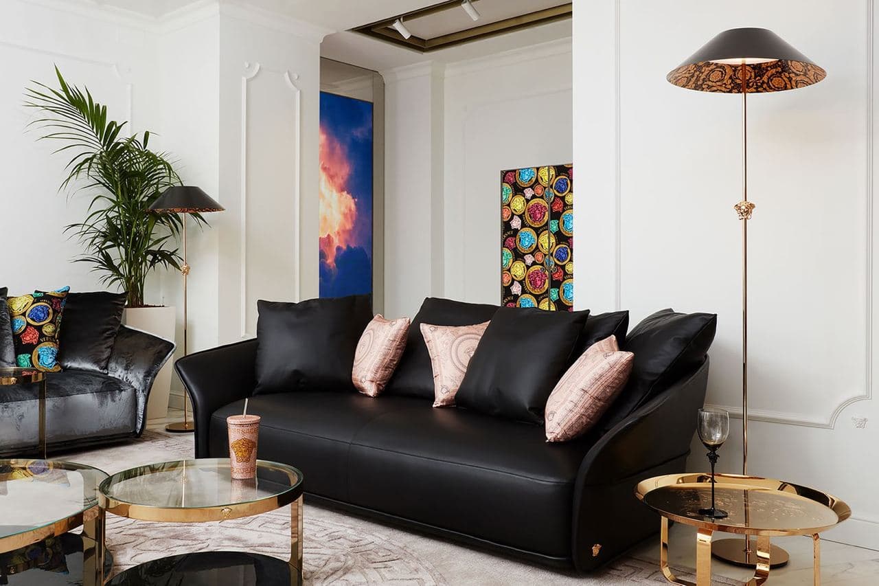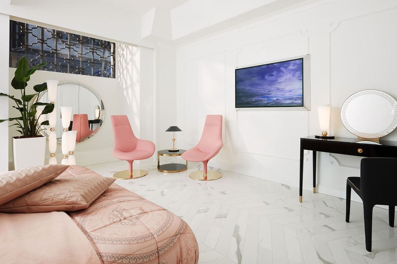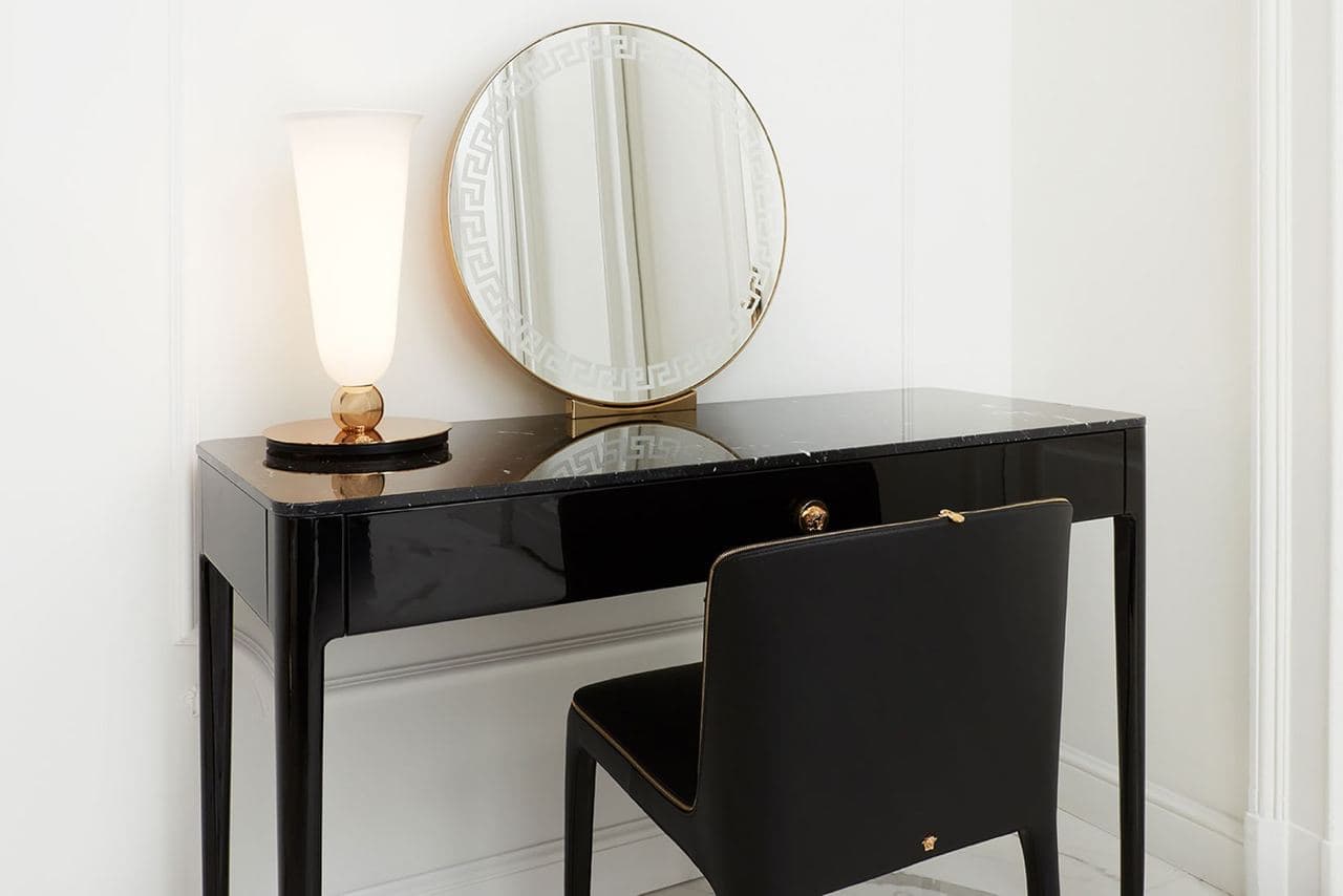 Интерьер выстроен на контрастах — классические элементы сочетаются с ультрасовременными формами и материалами. Мрамор и золото, мягкие ткани и металл, зеркальные поверхности и глубокие матовые оттенки — всё работает на создание узнаваемого стиля Versace. Знаковый греческий меандр проходит через стены, дверные проёмы и мебельные элементы, напоминая о наследии бренда и его неизменной связи с античной культурой.