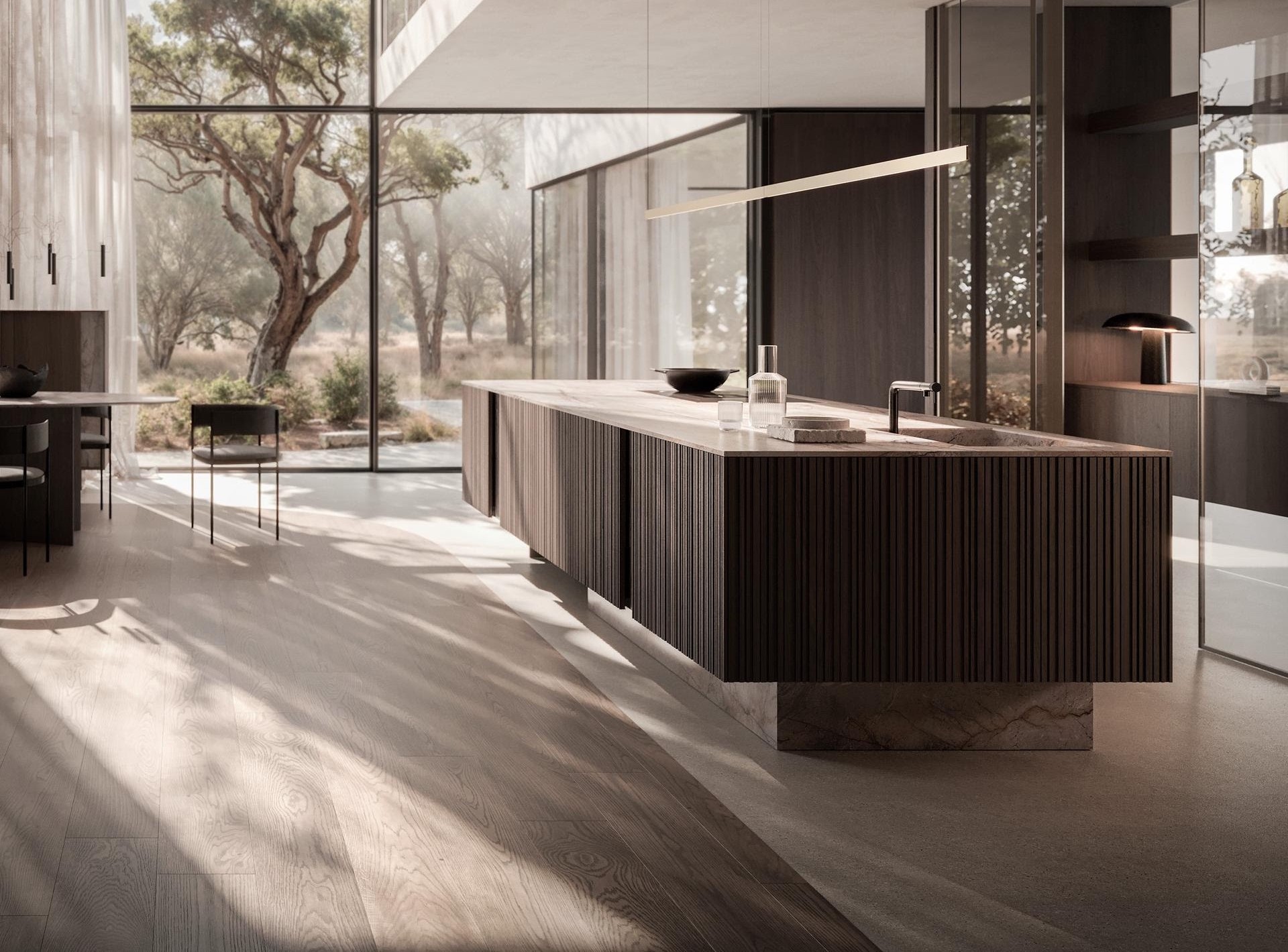 Дерево и камень изящно обрамляют конструкцию острова, которая словно парит над основанием из камня, опираясь на прочную двойную металлическую пластину — элегантное решение, подчеркивающее изысканность дизайна.