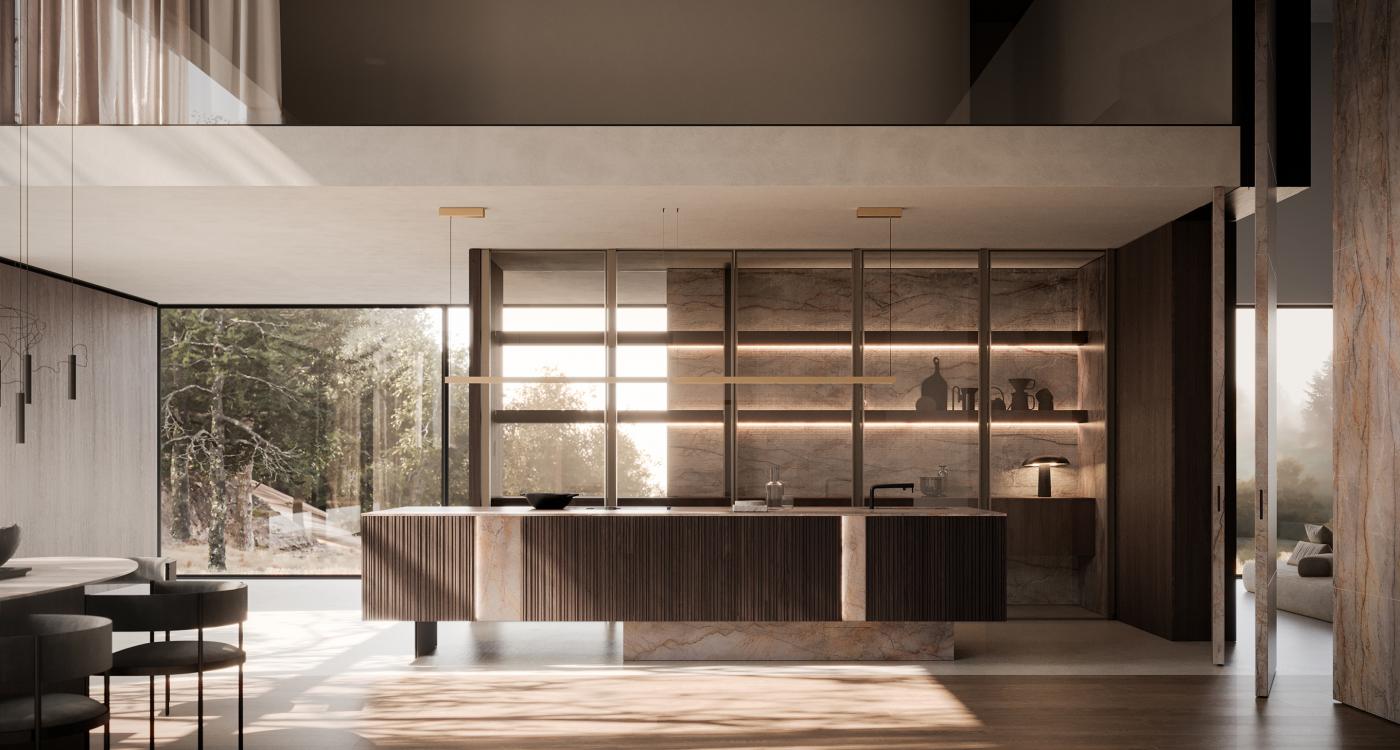 Элегантный подвесной остров в центре композиции воплощает собой олицетворение природной силы и утончённой эстетики. Внимание притягивает гармоничное сочетание выразительных материалов: благородный орех с новой отделкой Moka, излучающий теплые шоколадные оттенки, и завораживающий мрамор Silver Roots, чьи причудливые прожилки, словно древние корни, раскидываются по ореховой поверхности, создавая мощный визуальный контраст и напоминая живописные картины природы, выточенные временем.