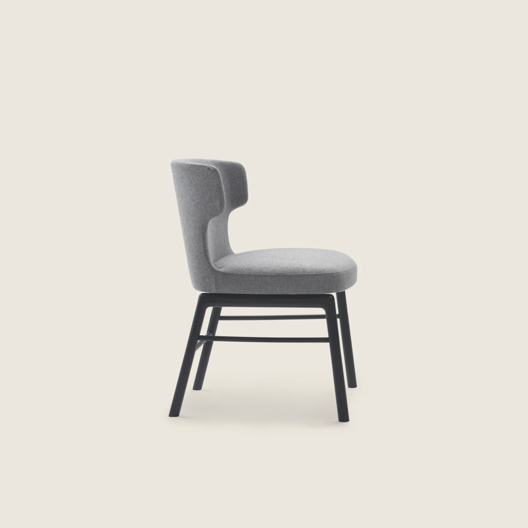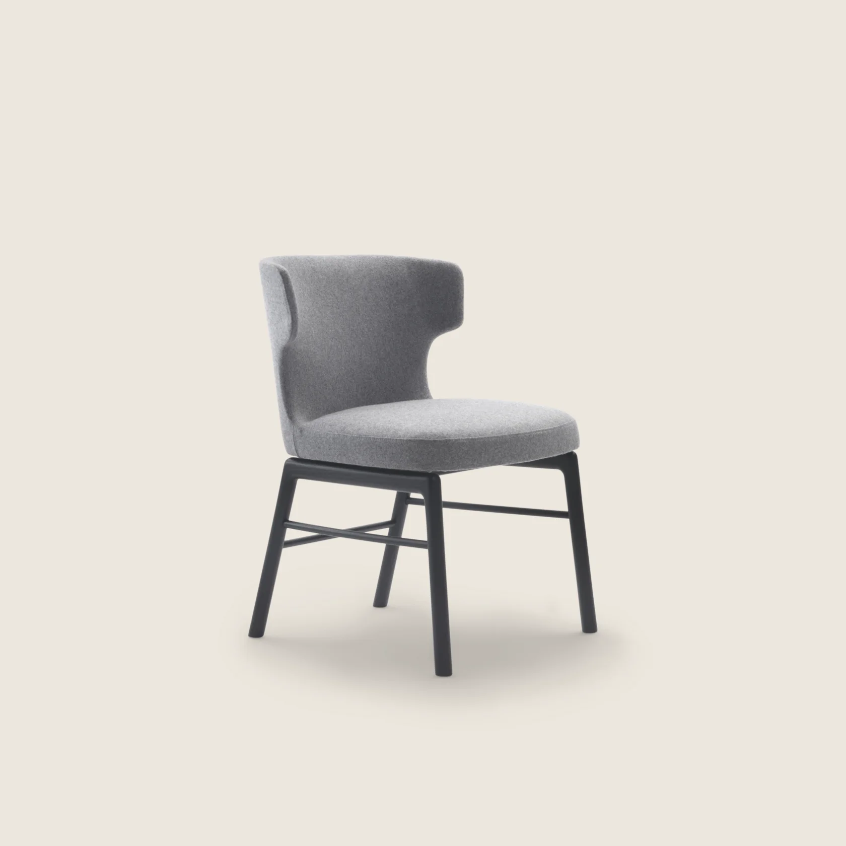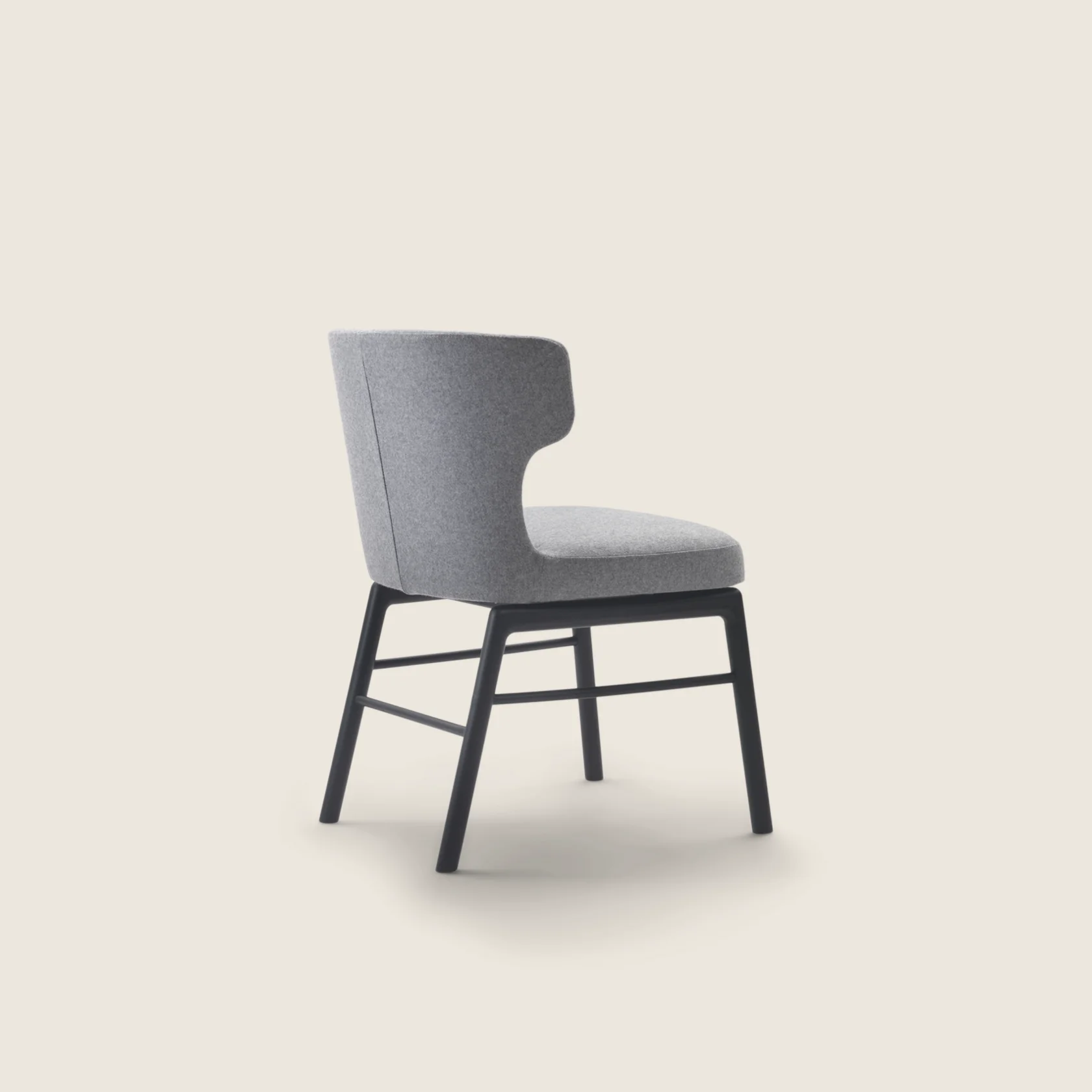 Особенности: Стул с обтекаемыми линиями и сбалансированными пропорциями, обеспечивающий высокий уровень комфорта. Обивка доступна в различных тканях и кожах, что позволяет адаптировать стул под различные стили интерьера.
