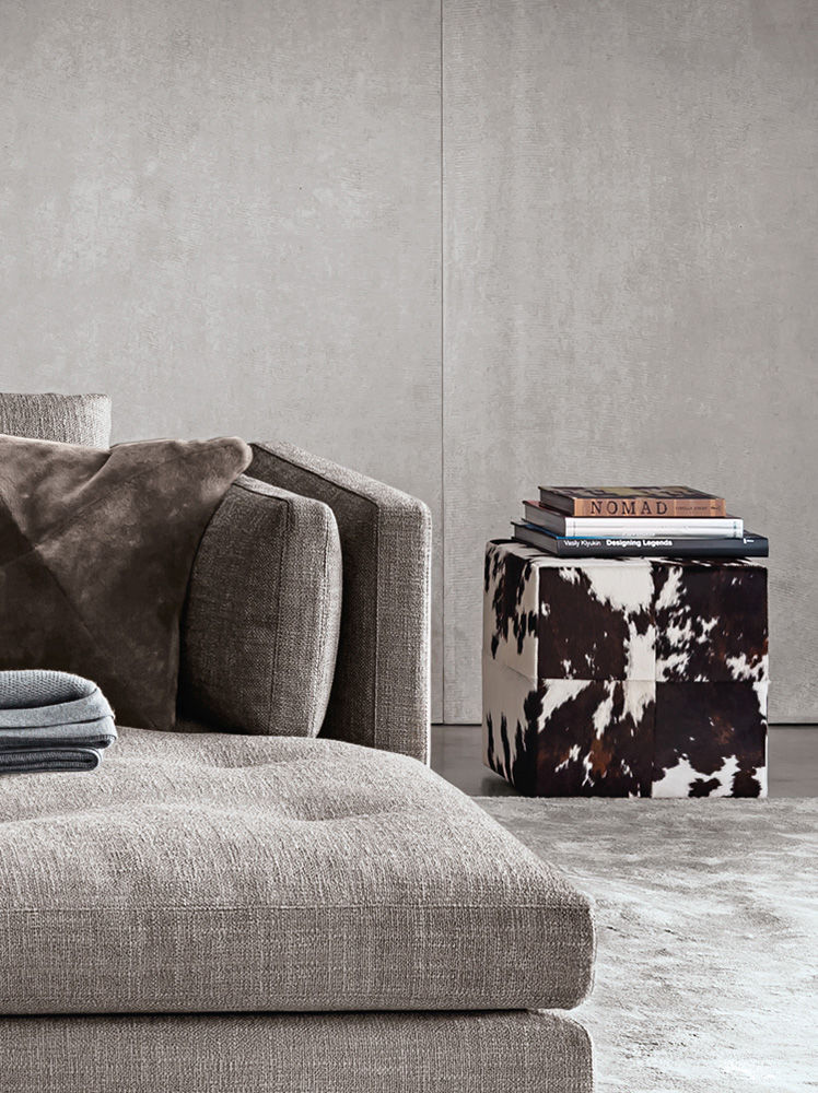 Villon Pouf представляет собой изысканный куб, покрытый кожей с тиснением под крокодила или имитирующей пони, что придает ему яркую индивидуальность.