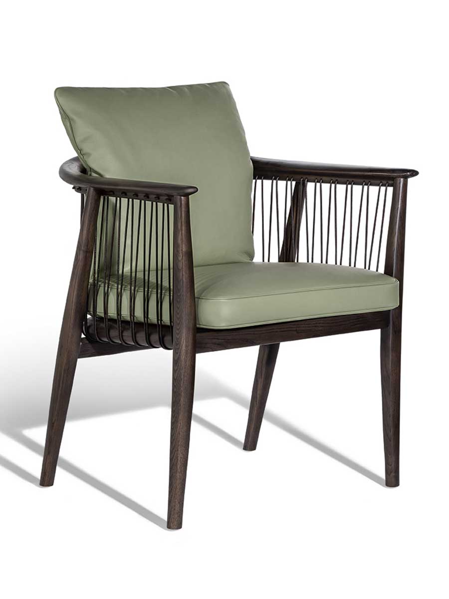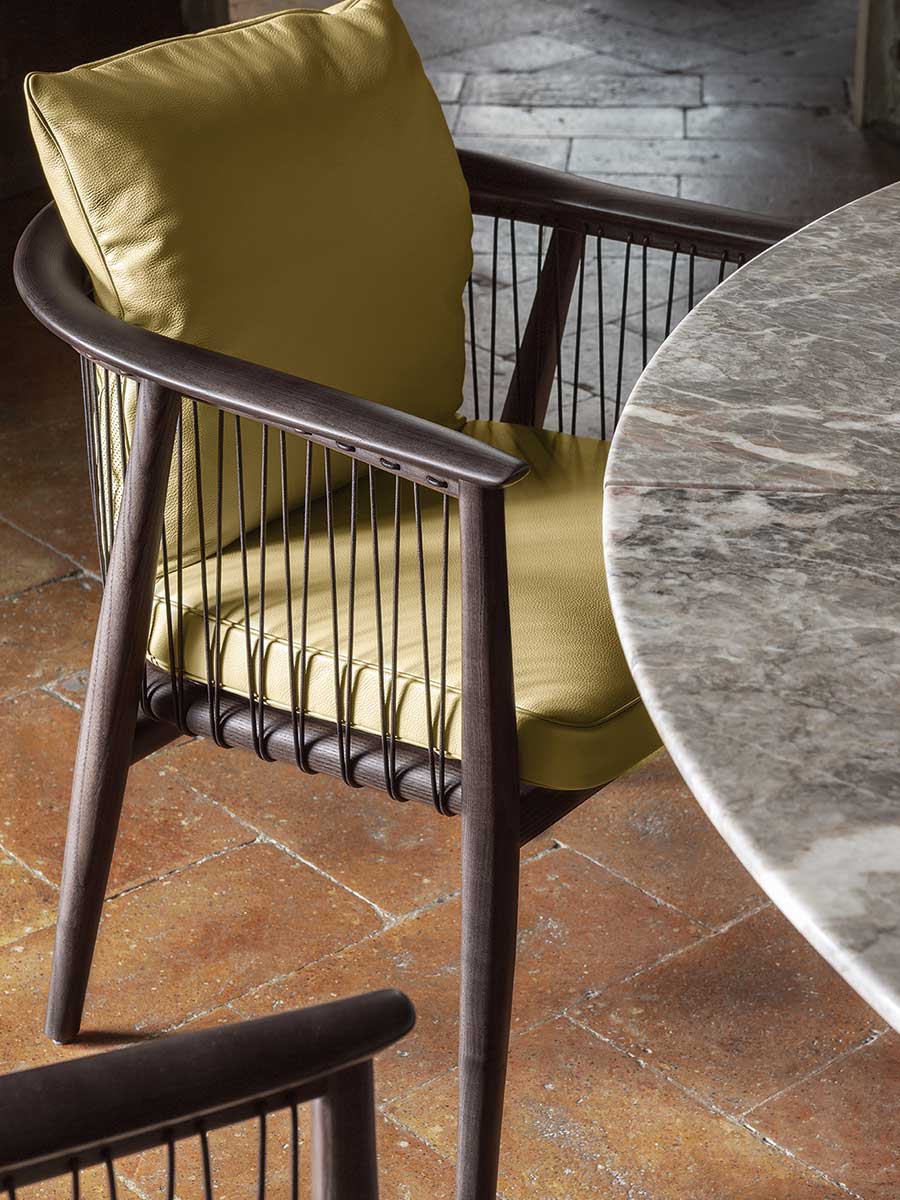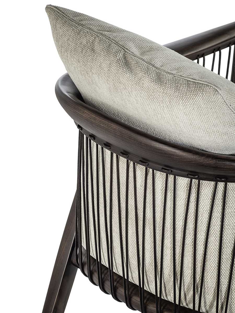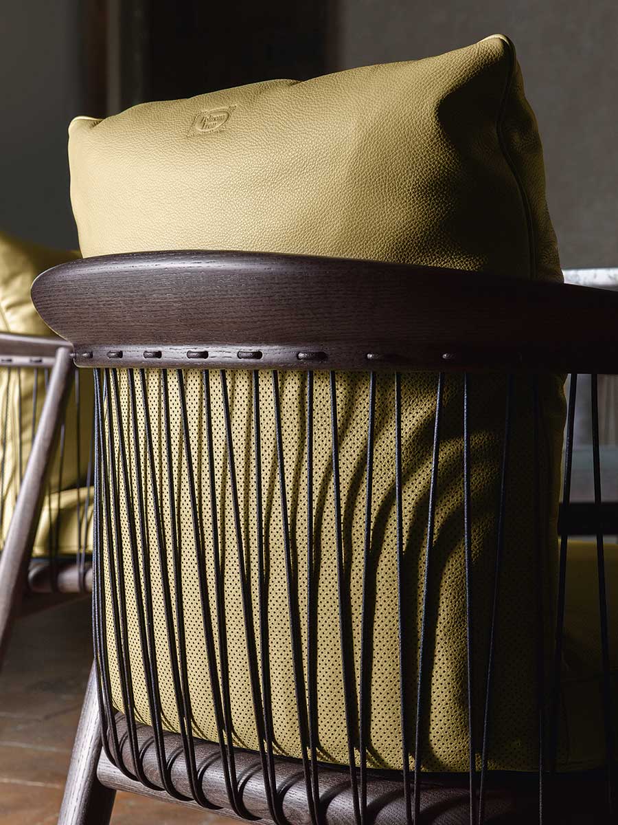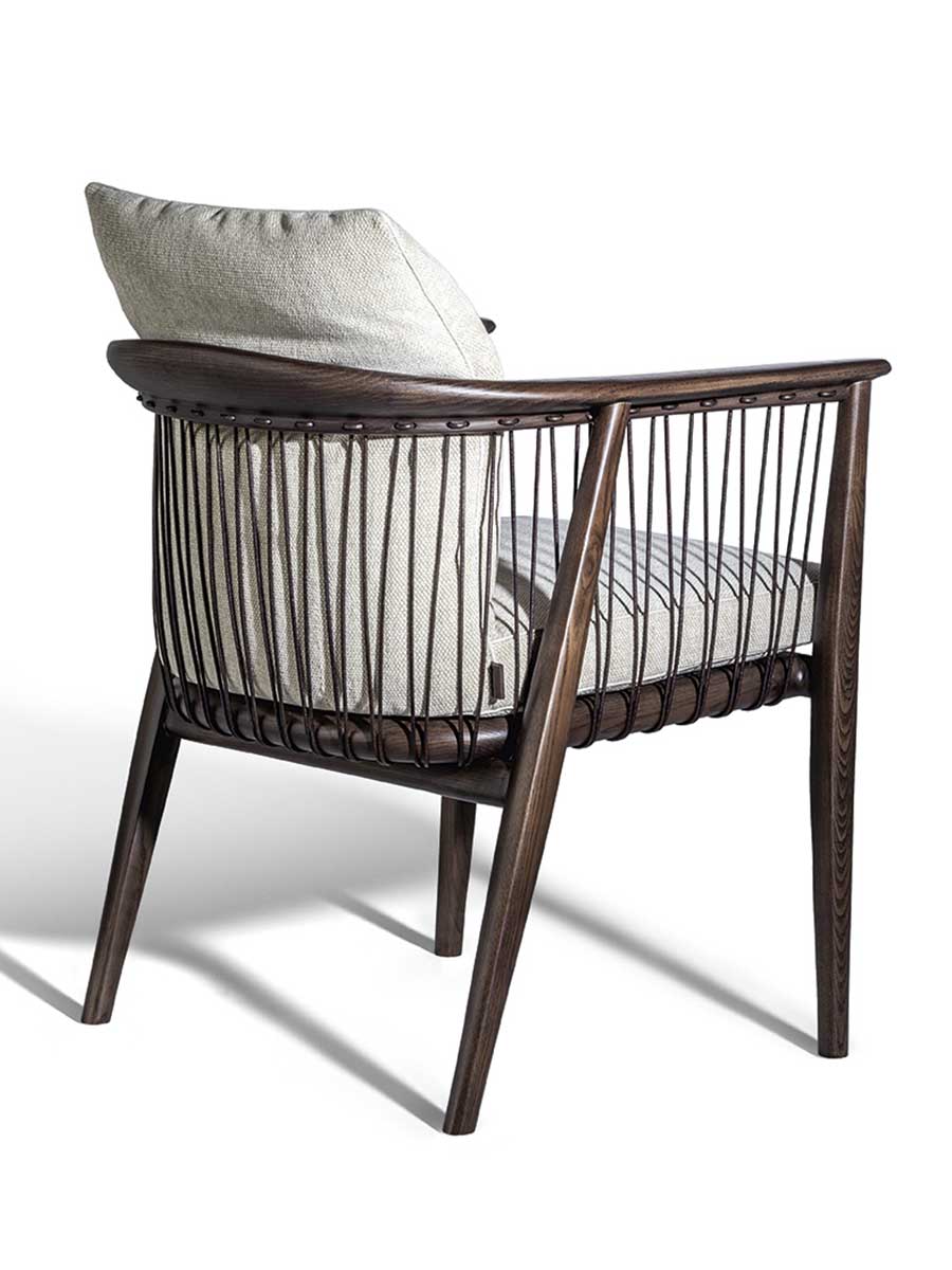 Каркас кресла Viola изготовлен из массива ясеня цвета мокко или венге и украшен переплетением шнурков из тёмно-коричневой или натуральной кожи. Пружинная система сиденья состоит из эластичных ремней. Сиденье и спинка оснащены мягкими подушками. Подушка сиденья наполнена пенополиуретаном и синтепоном, а спинка — пухом и имеет вставку из пенополиуретана. Две подушки образуют единое целое и крепятся к каркасу двумя кнопками. Съемная обивка кресла Viola выполнена из кожи Pelle Frau® или ткани.