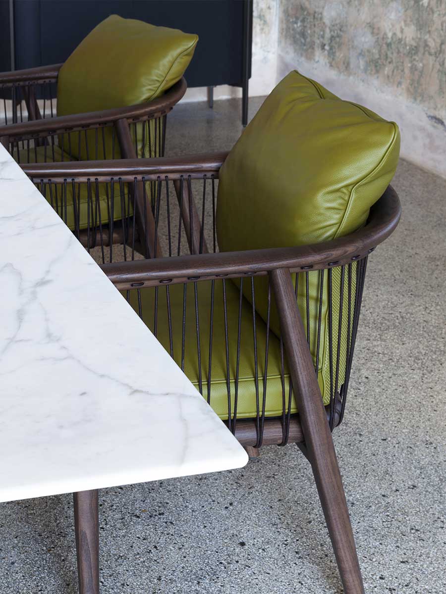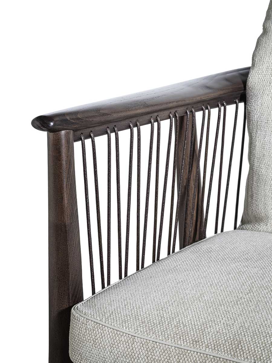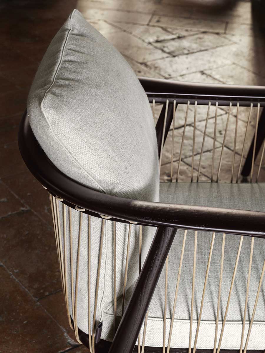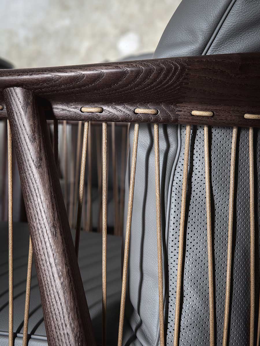Каркас кресла Viola изготовлен из массива ясеня цвета мокко или венге и украшен переплетением шнурков из тёмно-коричневой или натуральной кожи. Пружинная система сиденья состоит из эластичных ремней. Сиденье и спинка оснащены мягкими подушками. Подушка сиденья наполнена пенополиуретаном и синтепоном, а спинка — пухом и имеет вставку из пенополиуретана. Две подушки образуют единое целое и крепятся к каркасу двумя кнопками. Съемная обивка кресла Viola выполнена из кожи Pelle Frau® или ткани.