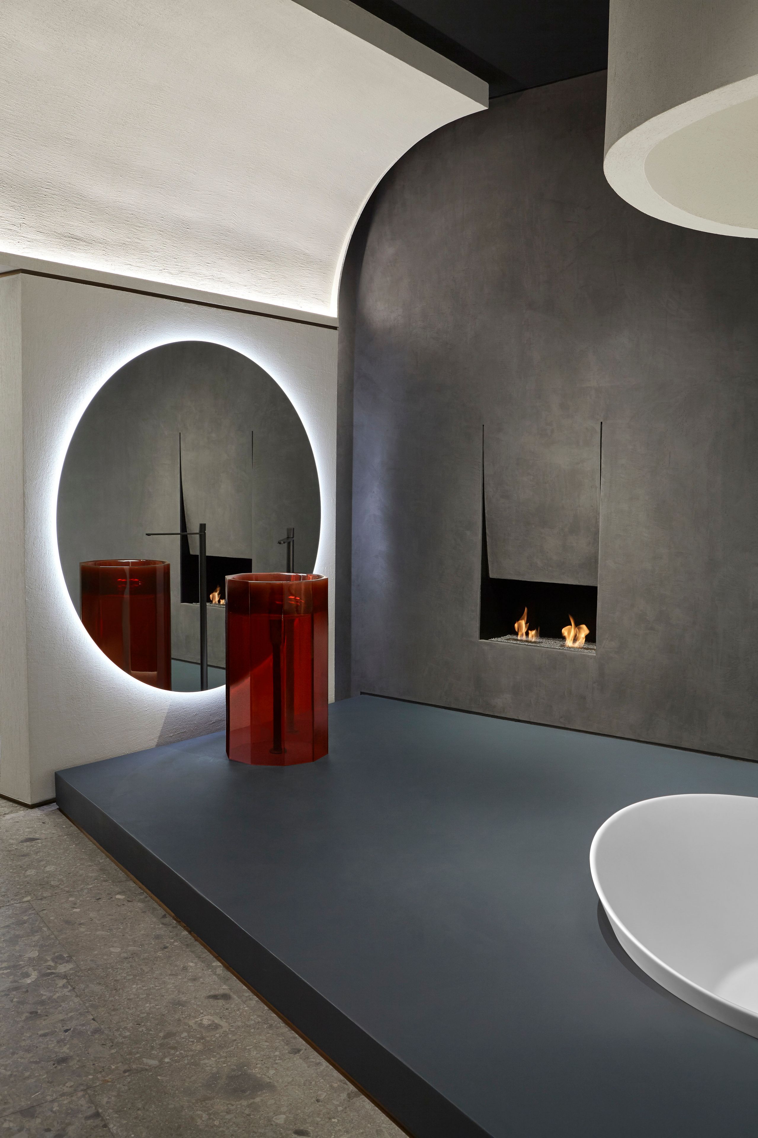 Vitreo становится центральным элементом в интерьере, словно светящийся камень, пробуждающий внимание и подчёркивающий современную философию antoniolupi — баланс между чистотой формы и технологичной выразительностью.