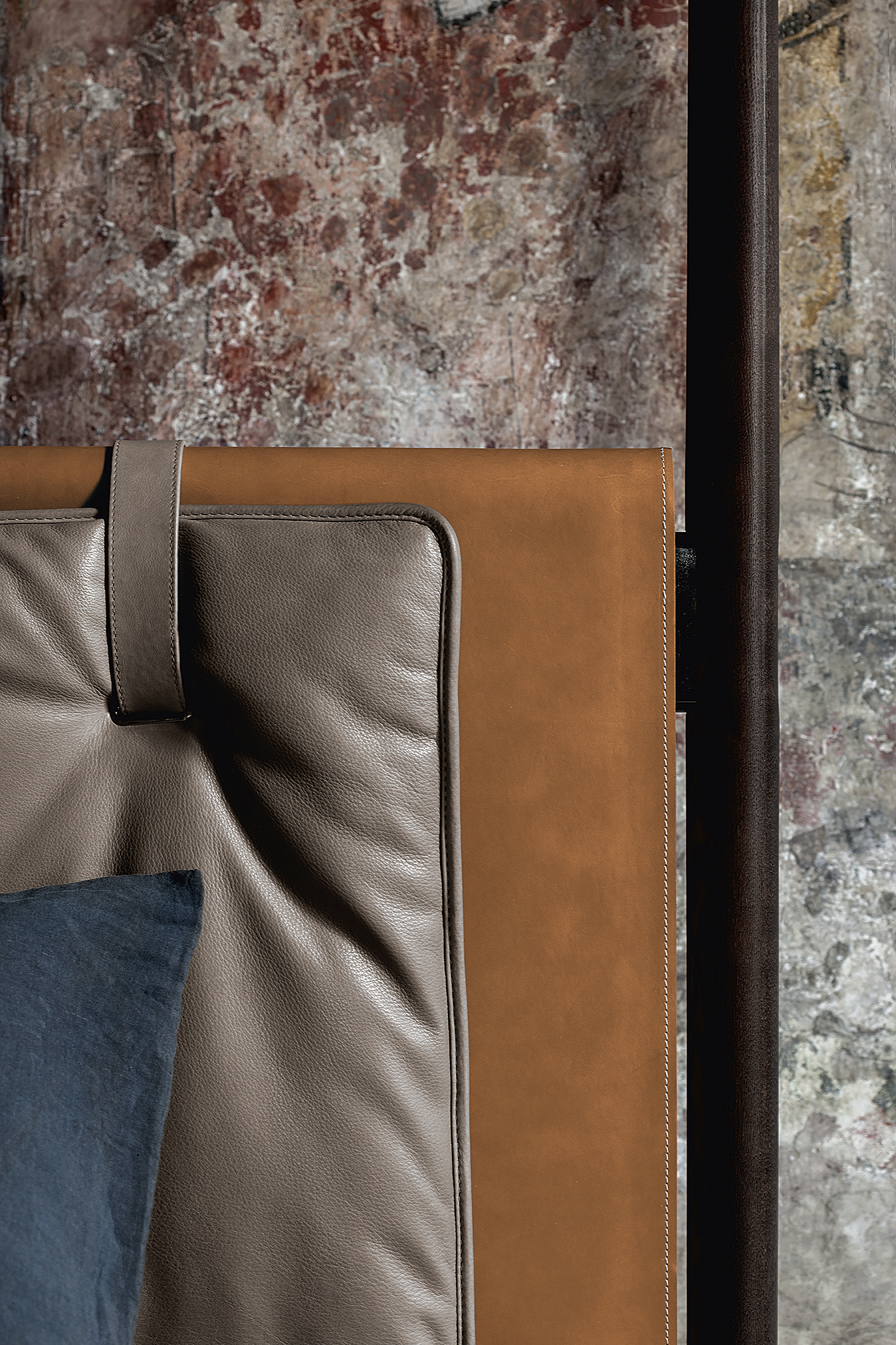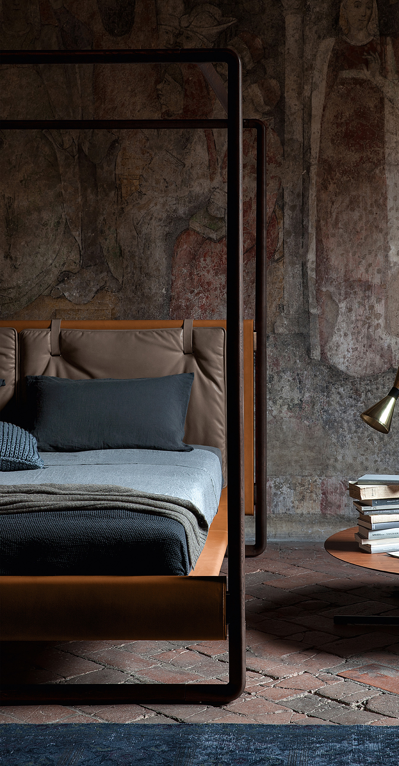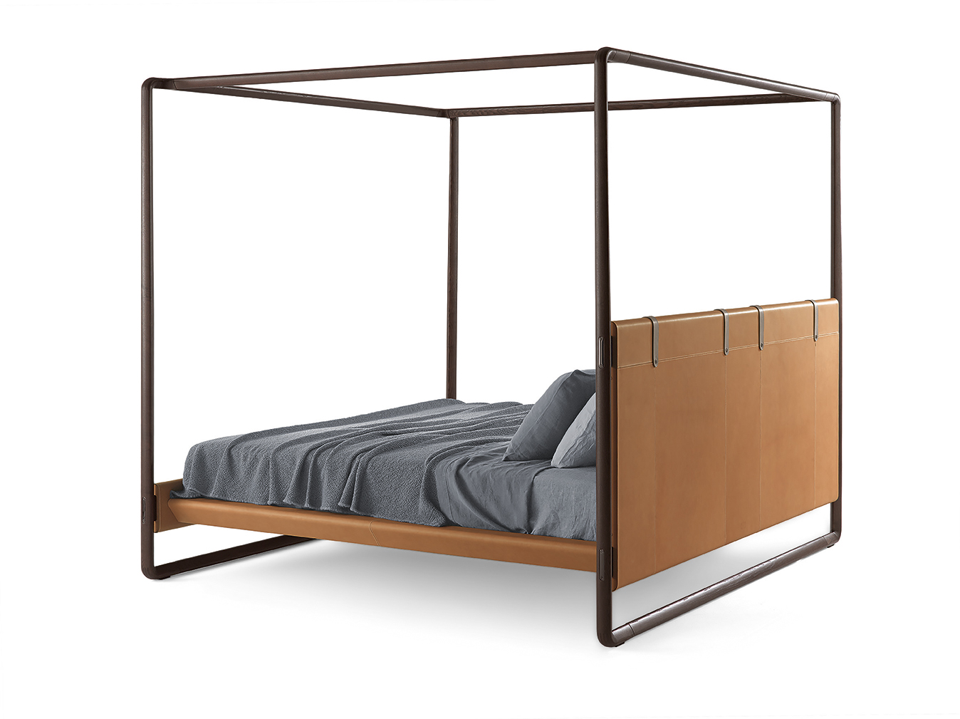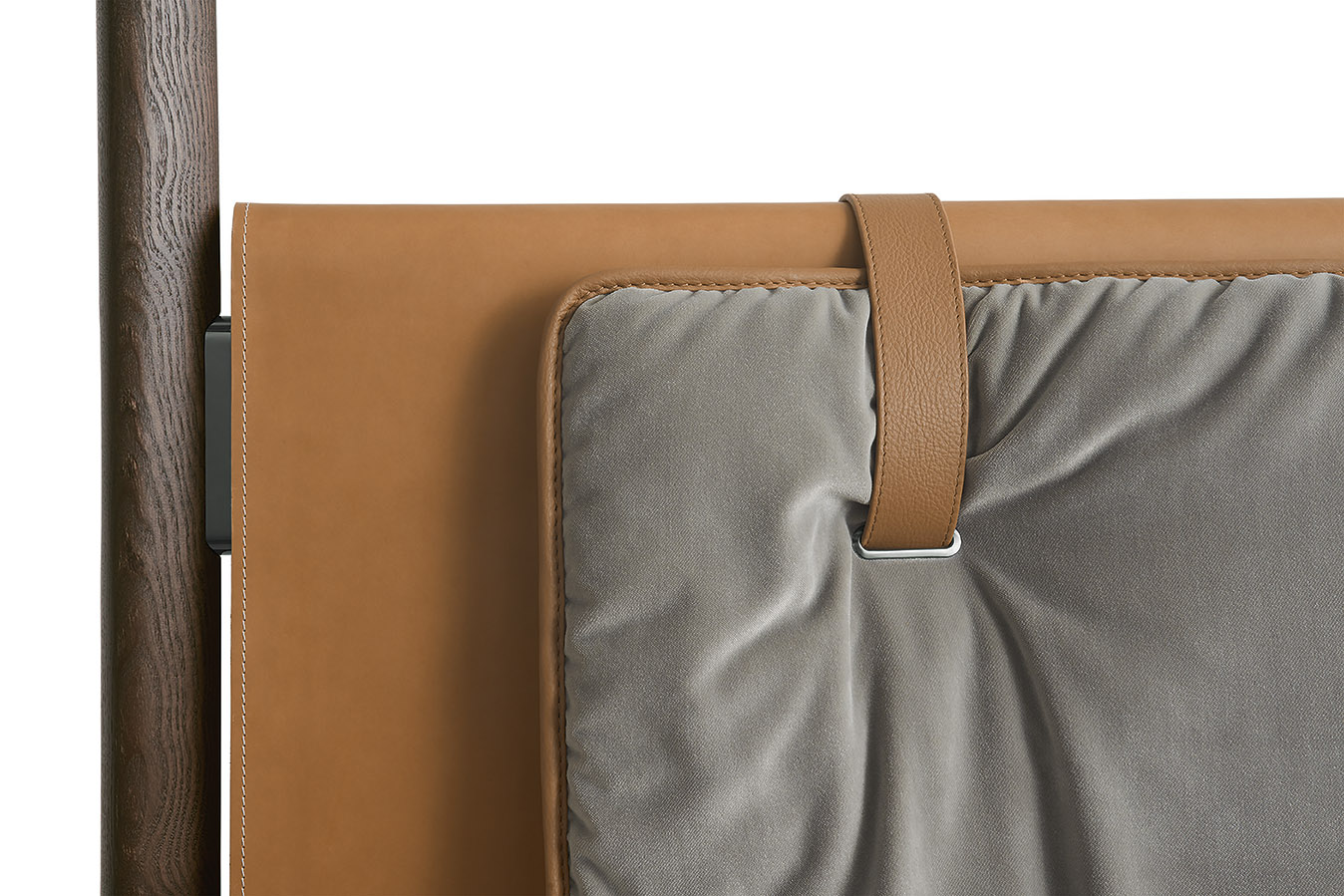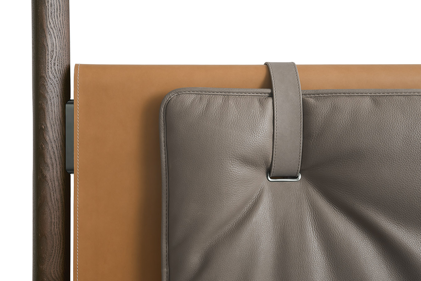 Кровать Volare с четырьмя балдахинами, выполненная из массива ясеня с треугольным сечением и отделкой цвета мокко, сужается к верху, постепенно становясь тоньше и легче. Изножье и каркас кровати изготовлены из тюльпанового дерева и полностью обтянуты кожей Cuoio Saddle Extra или Pelle Frau®, как и изголовье, изготовленное из массива бука с внутренними перекладинами из березовой фанеры и заполненное панелями из ДВП. Две мягкие и роскошные подушки, набитые полиэстеровой ватой, крепятся к изголовью двумя ремнями из кожи или кожи. На передней стороне изголовья ремни проходят через металлический люверс с отделкой цвета оружейной стали и фиксируются на спинке пуговицами, также с отделкой цвета оружейной стали и логотипом Poltrona Frau. Обивка выполнена из кожи Pelle Frau®, в том числе двухцветной, или из ткани с каймой из кожи или кожи.