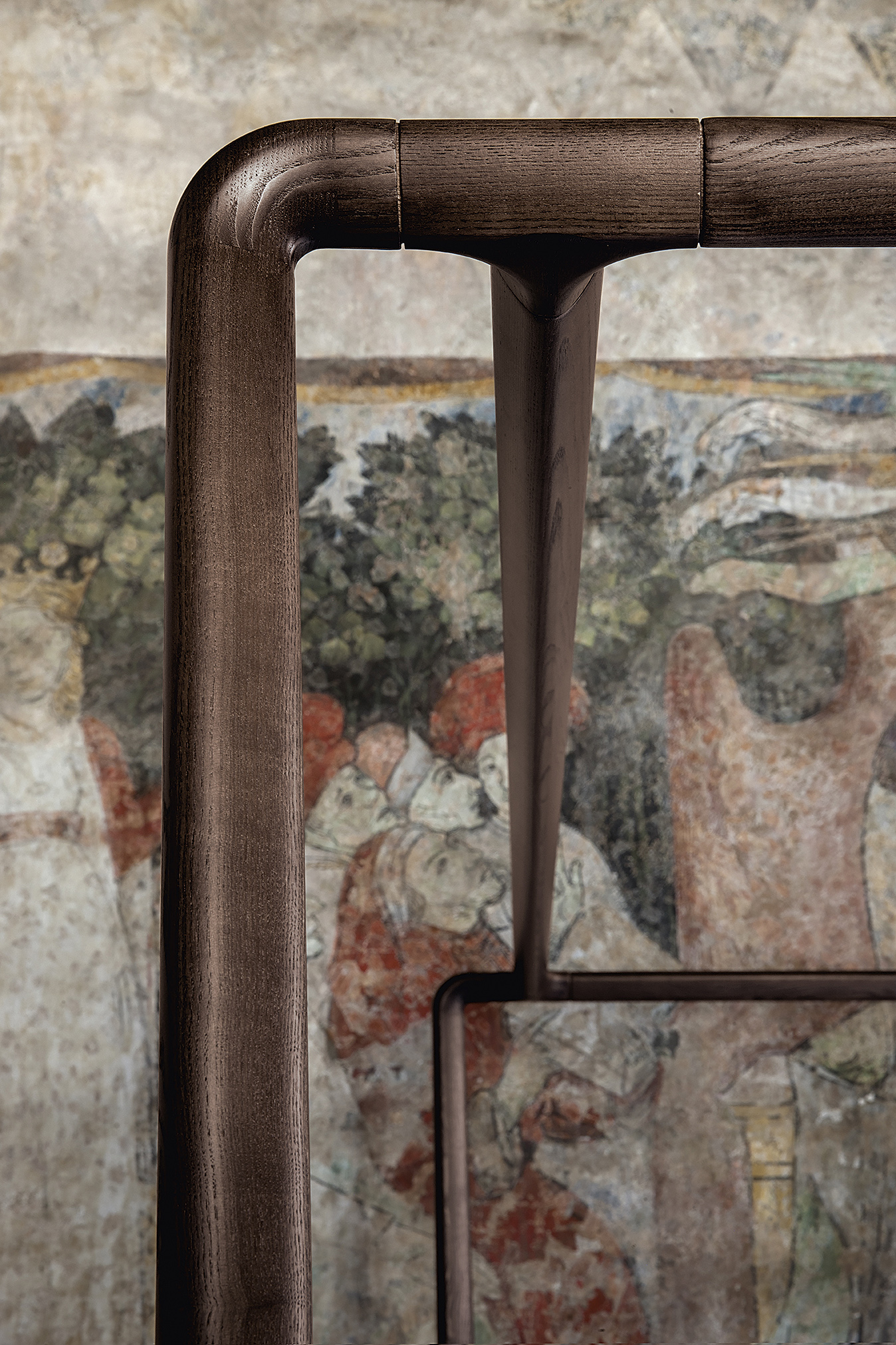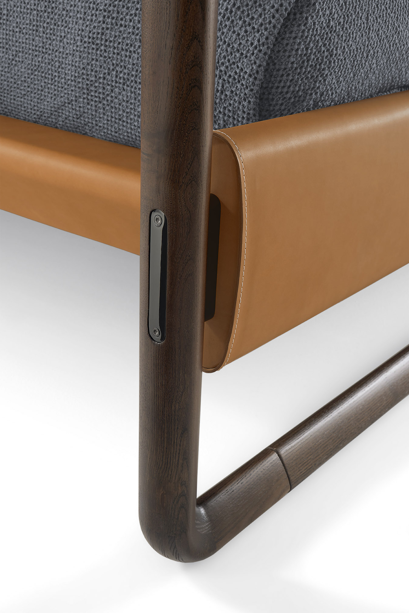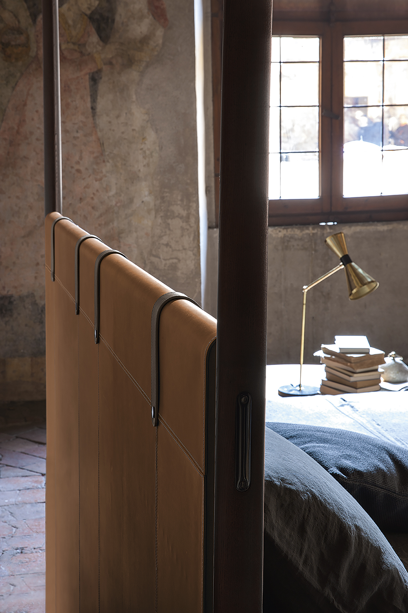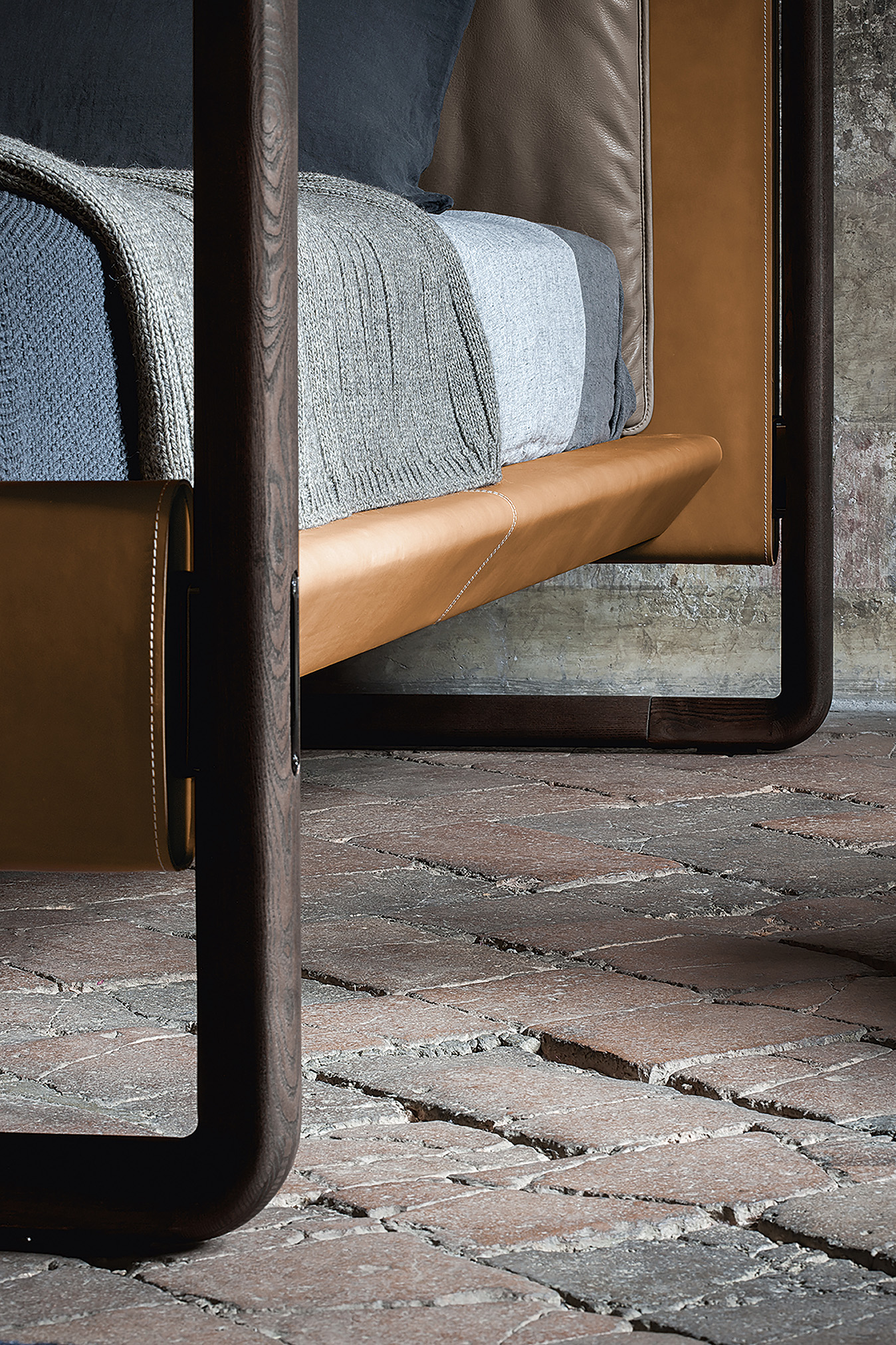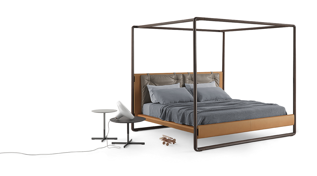 Кровать Volare с четырьмя балдахинами, выполненная из массива ясеня с треугольным сечением и отделкой цвета мокко, сужается к верху, постепенно становясь тоньше и легче. Изножье и каркас кровати изготовлены из тюльпанового дерева и полностью обтянуты кожей Cuoio Saddle Extra или Pelle Frau®, как и изголовье, изготовленное из массива бука с внутренними перекладинами из березовой фанеры и заполненное панелями из ДВП. Две мягкие и роскошные подушки, набитые полиэстеровой ватой, крепятся к изголовью двумя ремнями из кожи или кожи. На передней стороне изголовья ремни проходят через металлический люверс с отделкой цвета оружейной стали и фиксируются на спинке пуговицами, также с отделкой цвета оружейной стали и логотипом Poltrona Frau. Обивка выполнена из кожи Pelle Frau®, в том числе двухцветной, или из ткани с каймой из кожи или кожи.