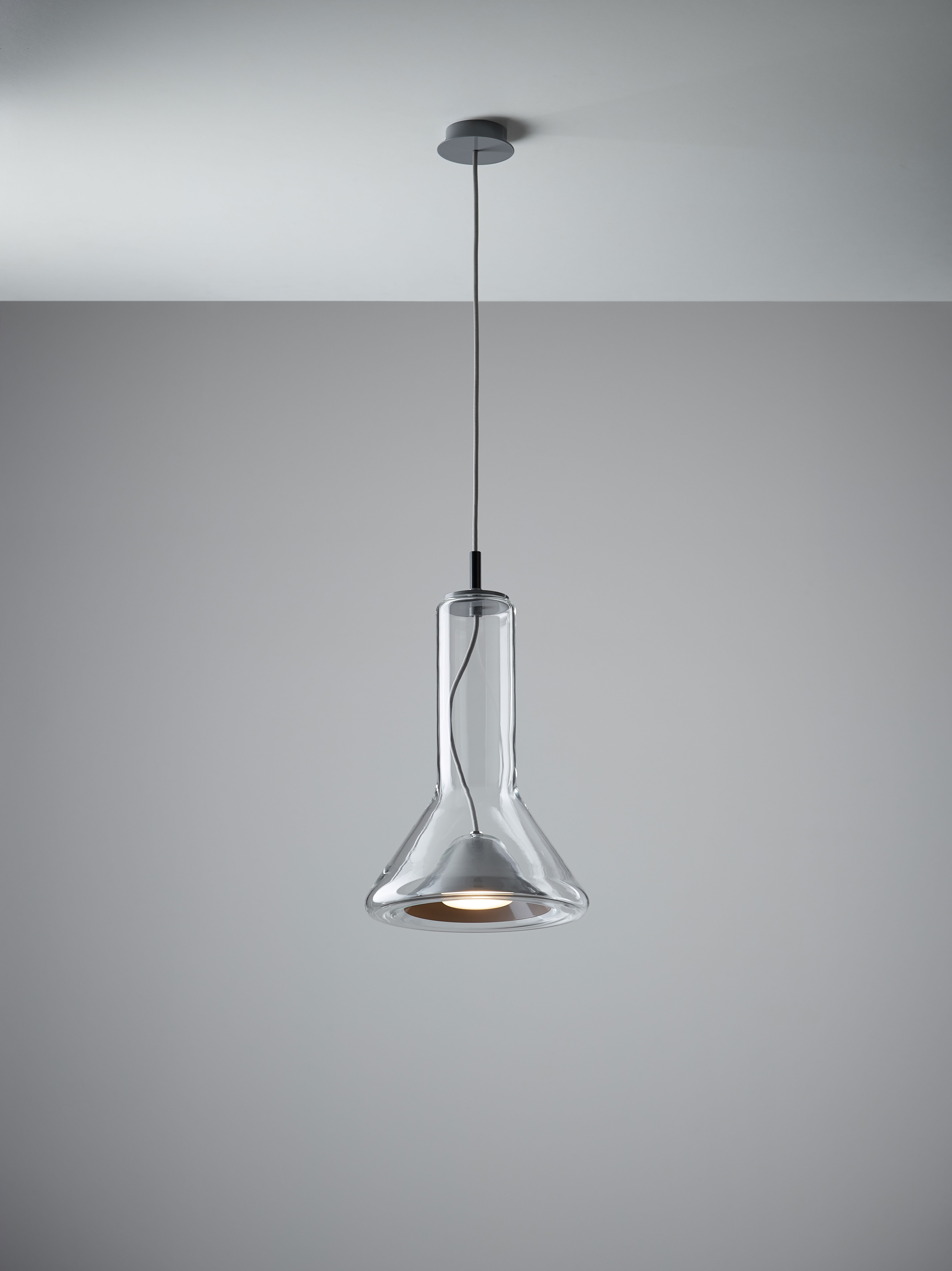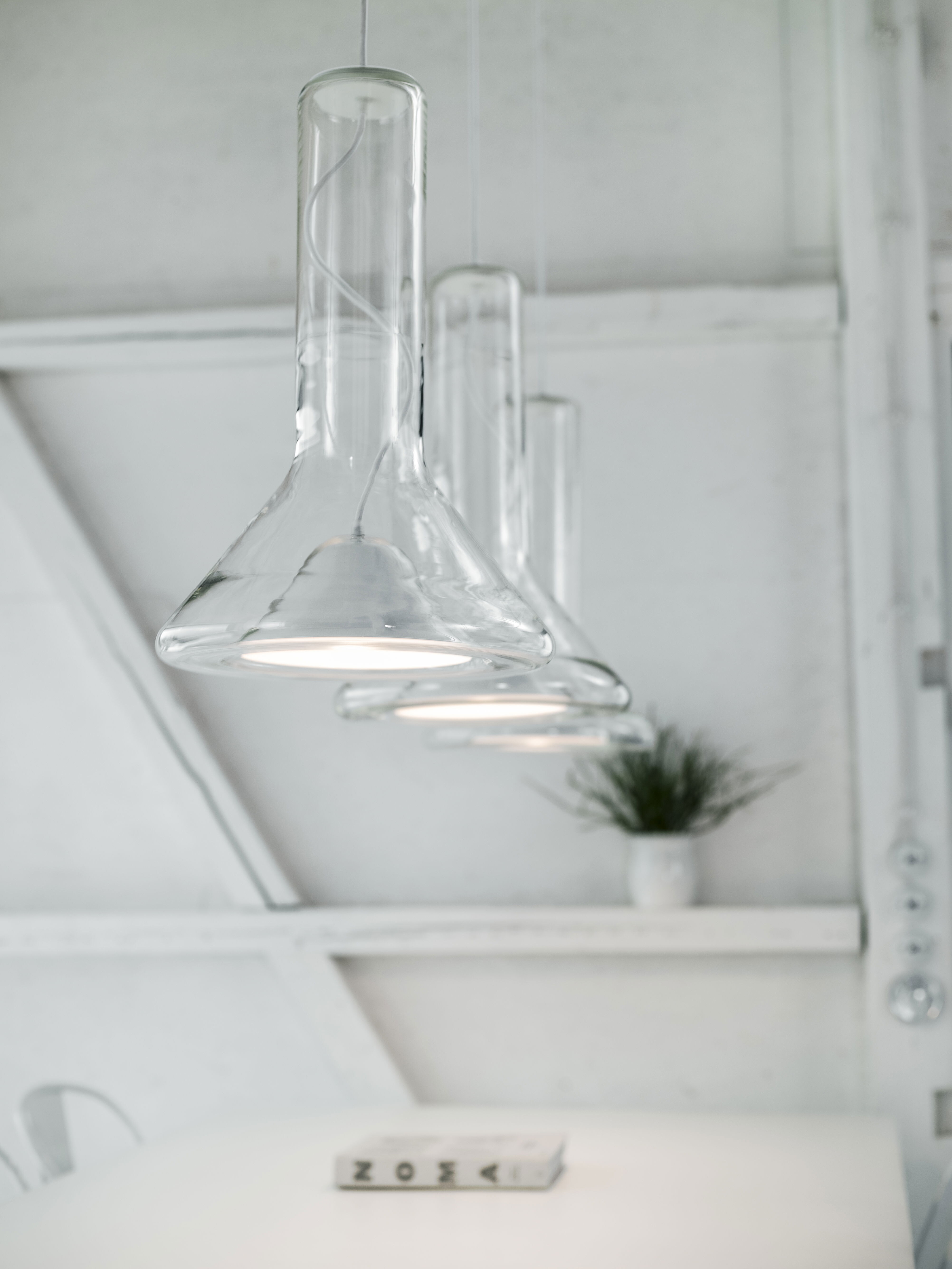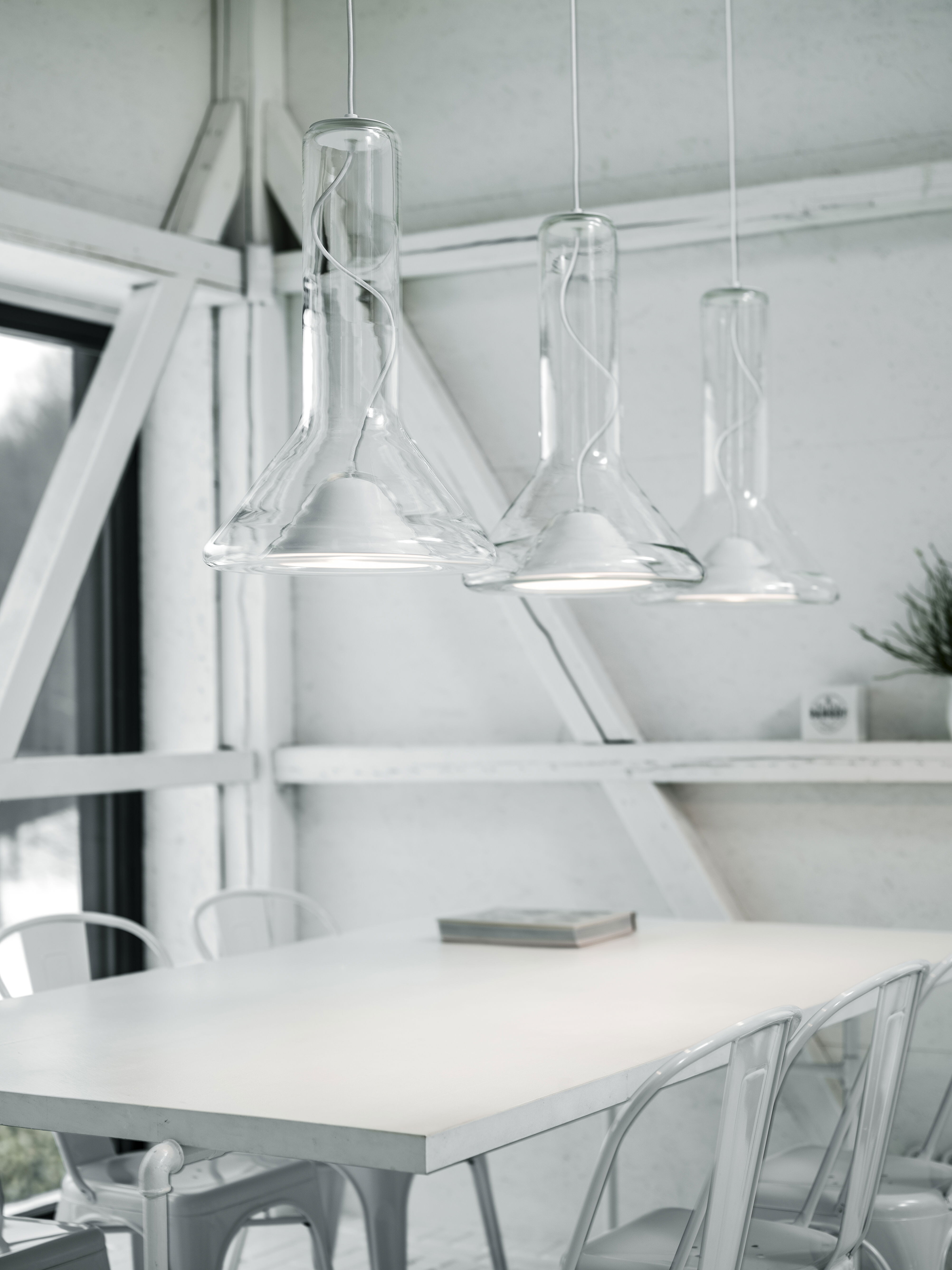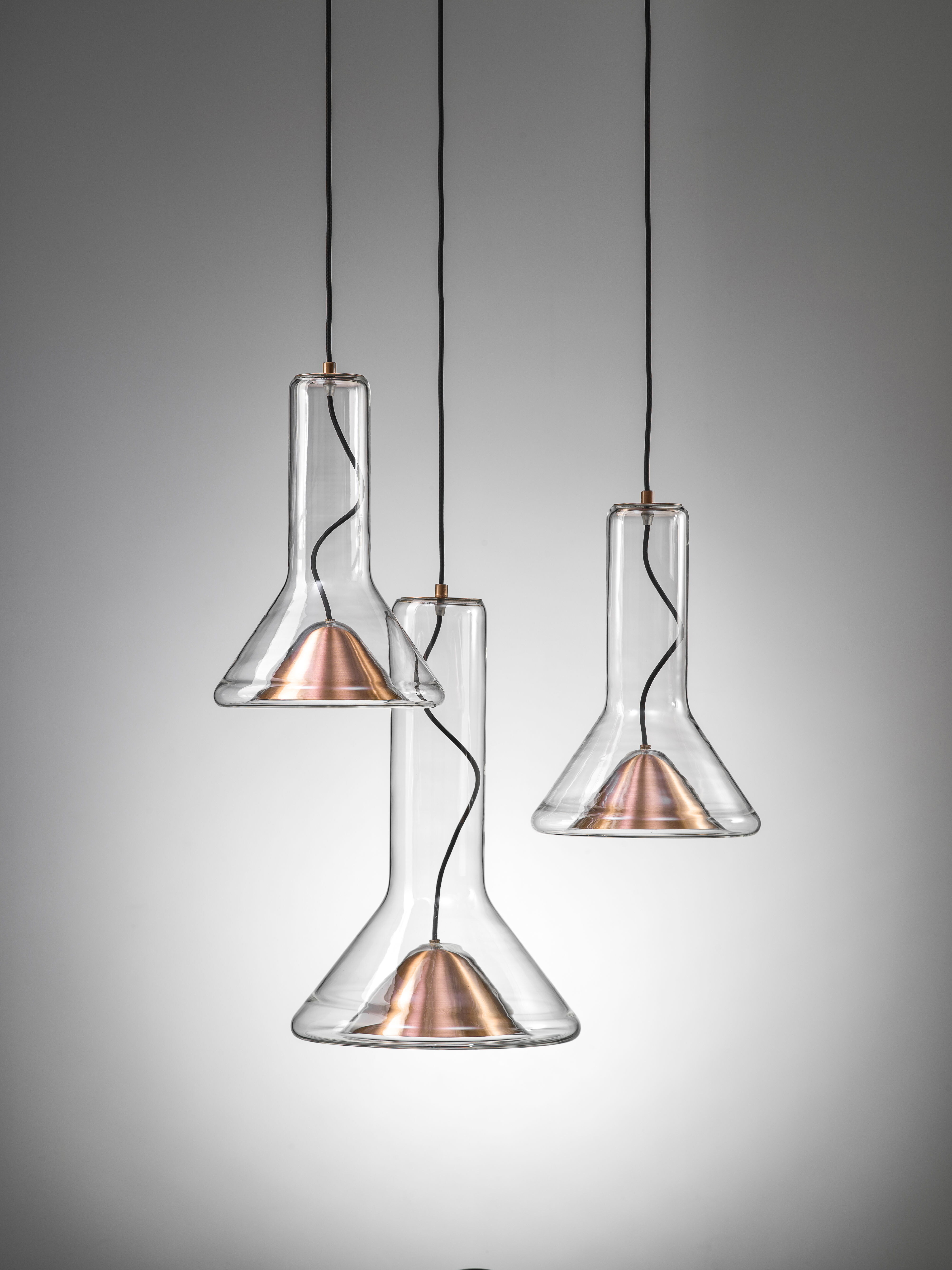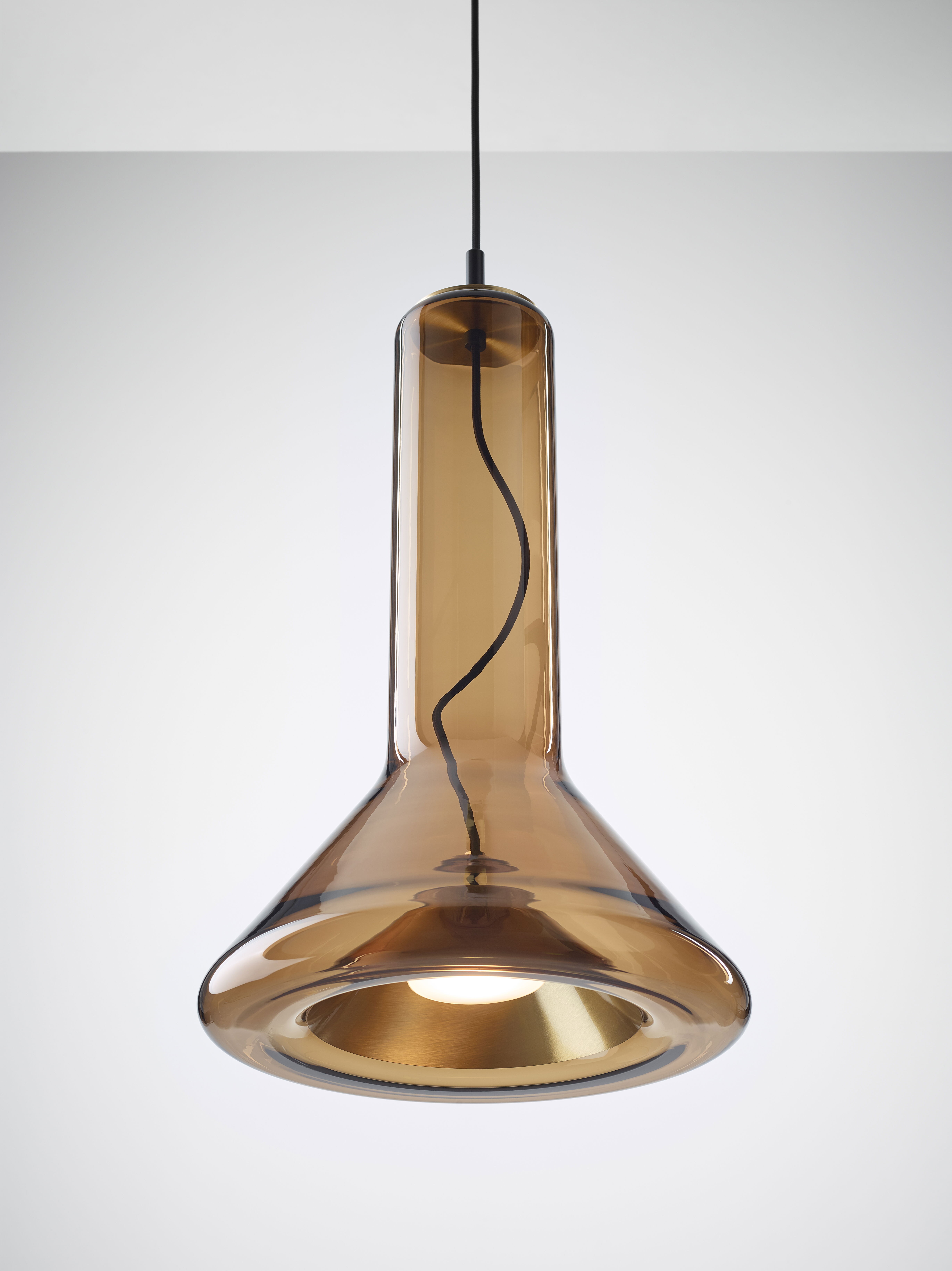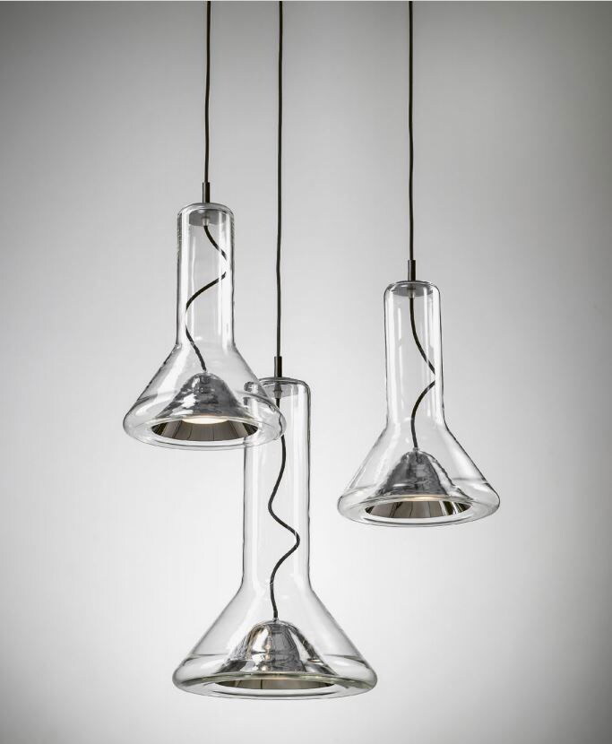Прозрачный корпус светильника повторяет силуэт конуса света, а выразительный точечный источник освещения с металлическим экраном, изготовленным методом ручной прессовки, образует его условное «сердце». Общая форма и открытый кабель, проходящий вверх через корпус светильника, подчеркивают характер лаконичной и технически чистой конструкции.