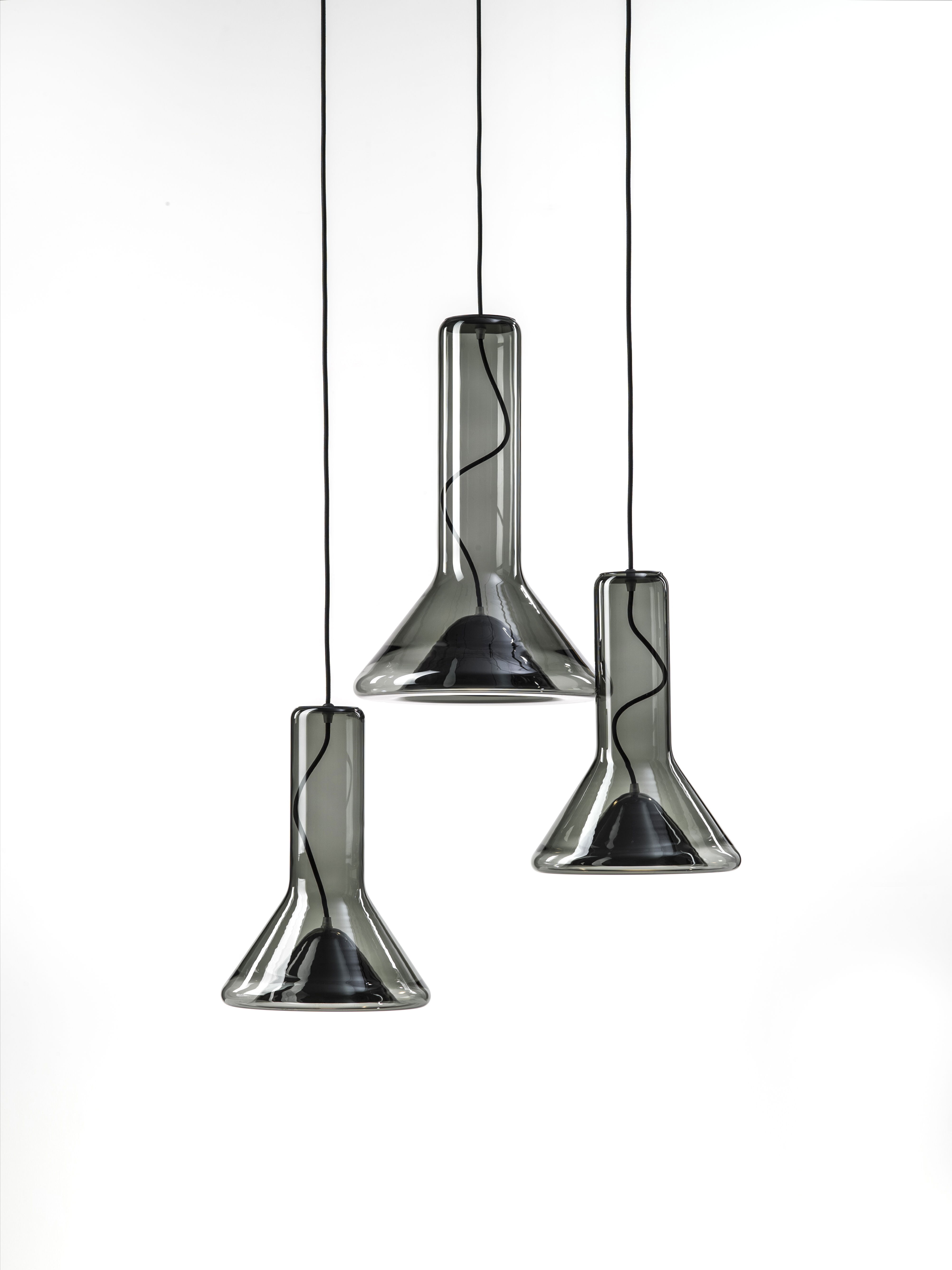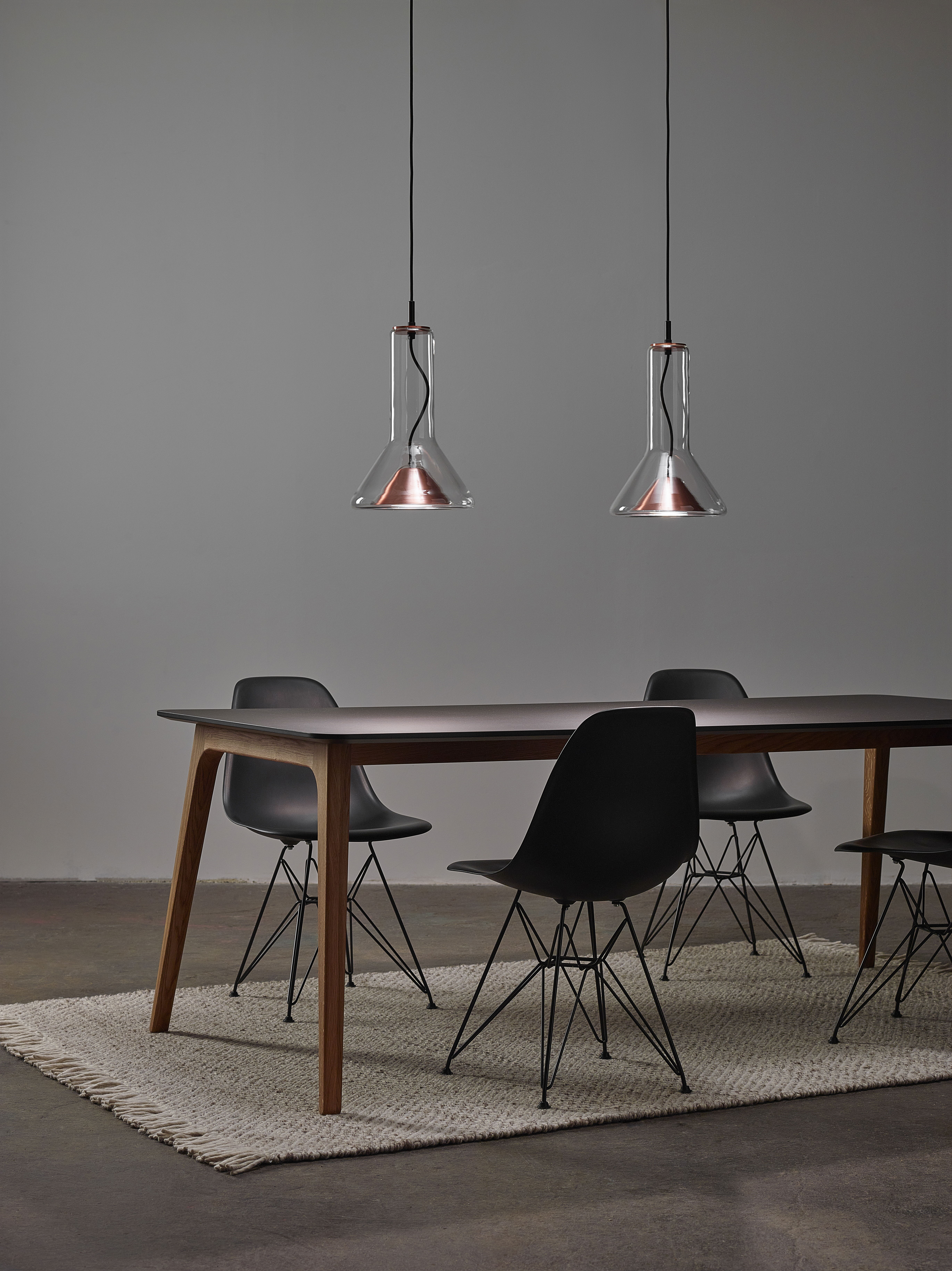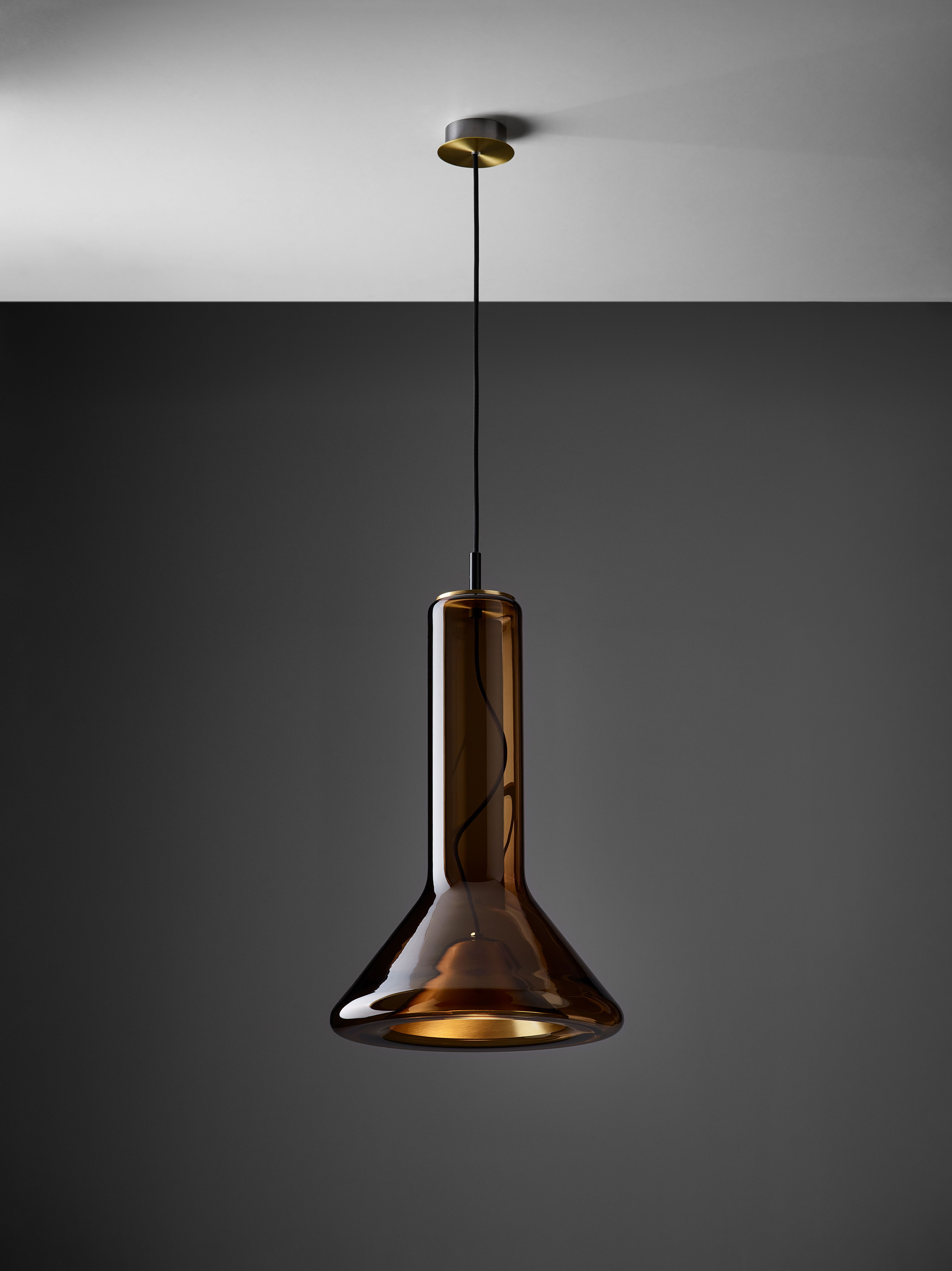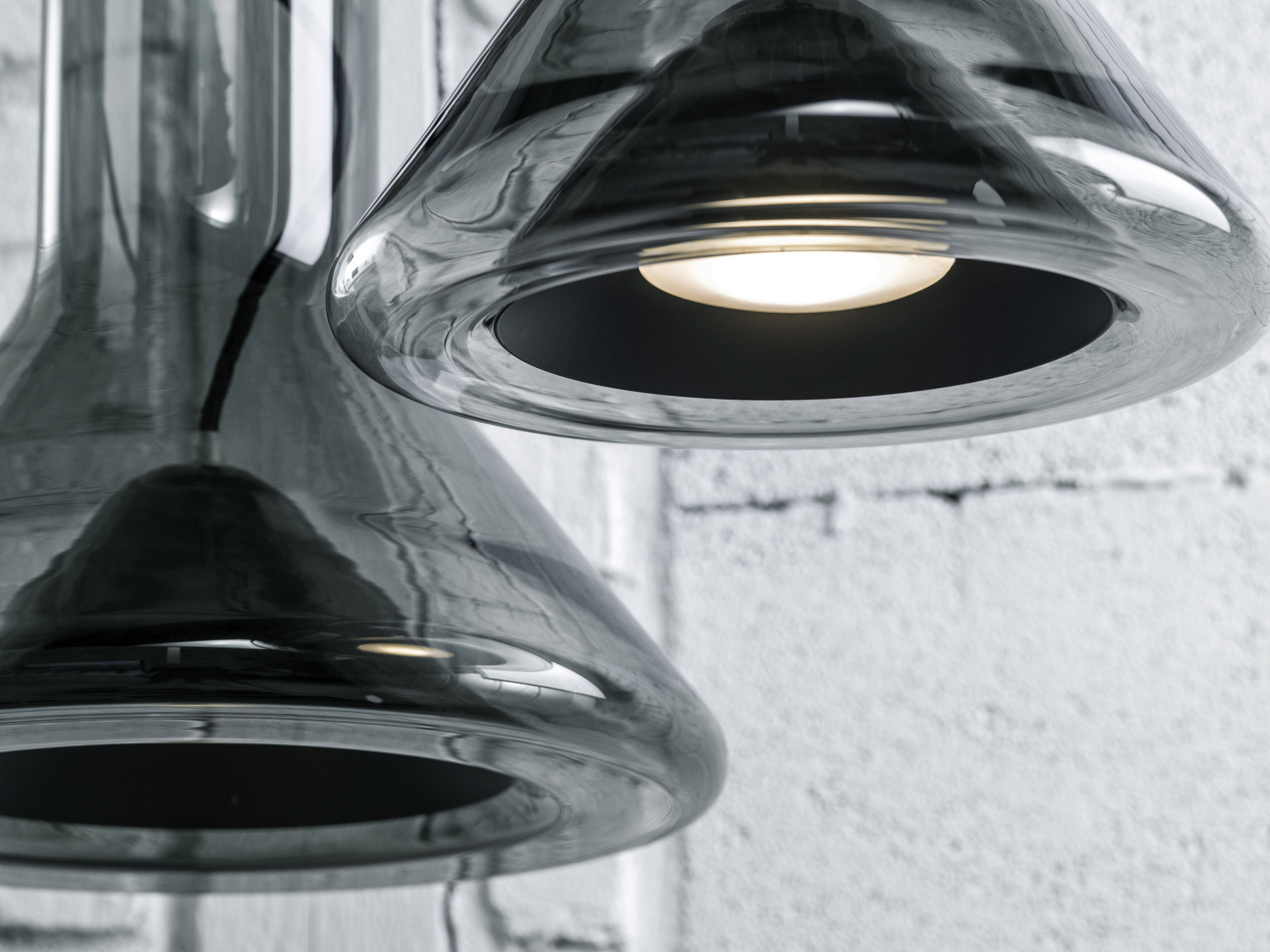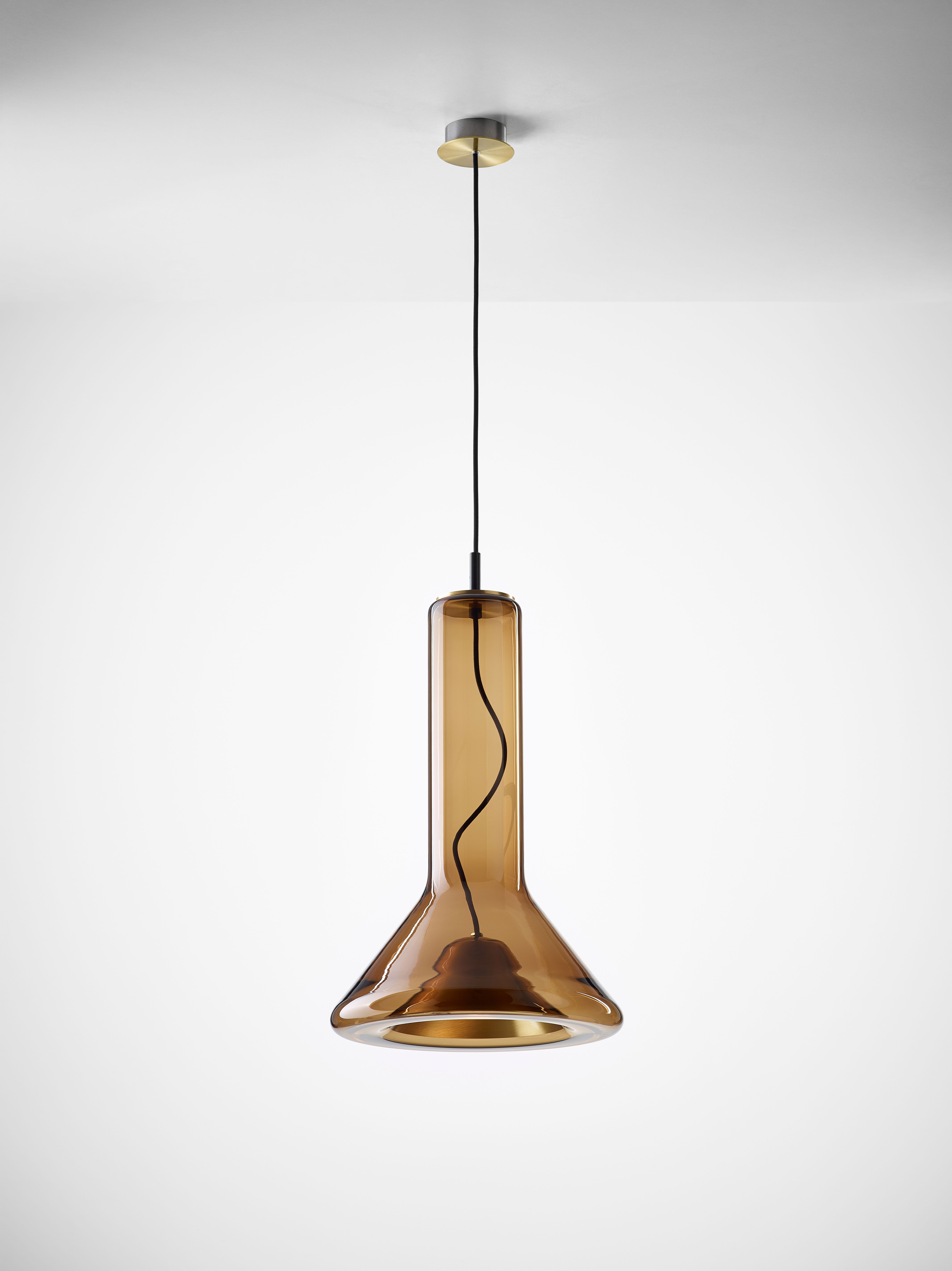 Прозрачный корпус светильника повторяет силуэт конуса света, а выразительный точечный источник освещения с металлическим экраном, изготовленным методом ручной прессовки, образует его условное «сердце». Общая форма и открытый кабель, проходящий вверх через корпус светильника, подчеркивают характер лаконичной и технически чистой конструкции.