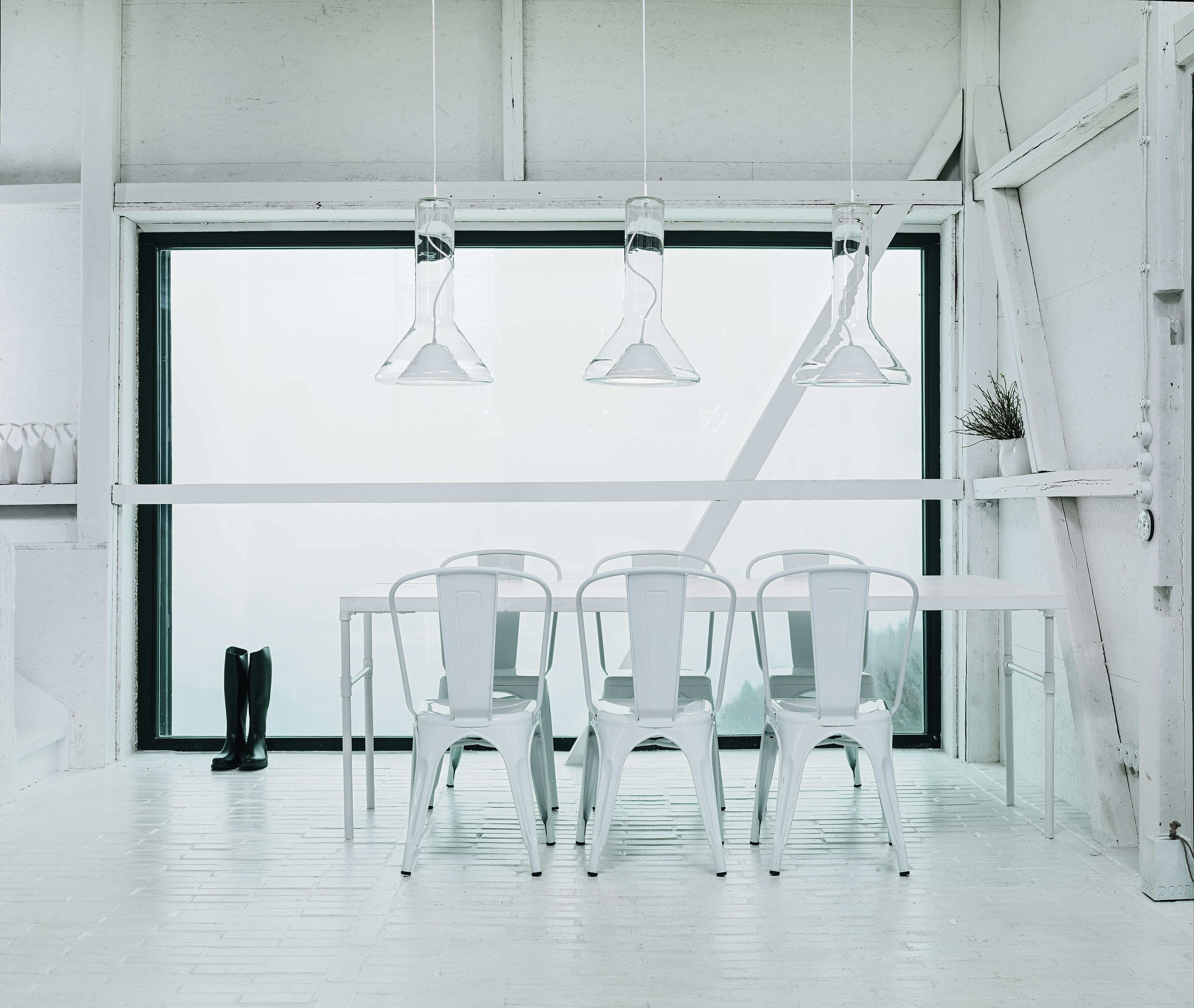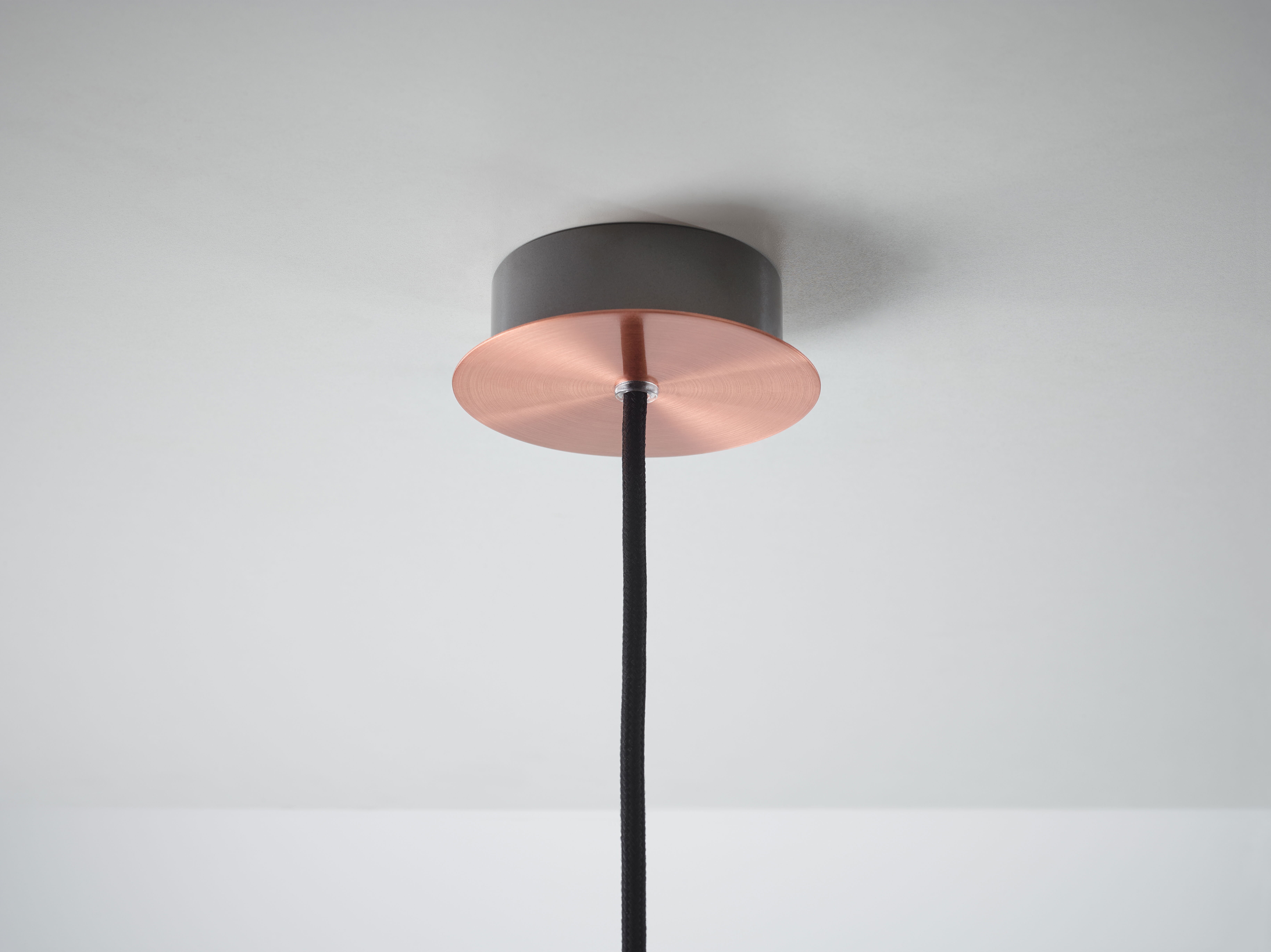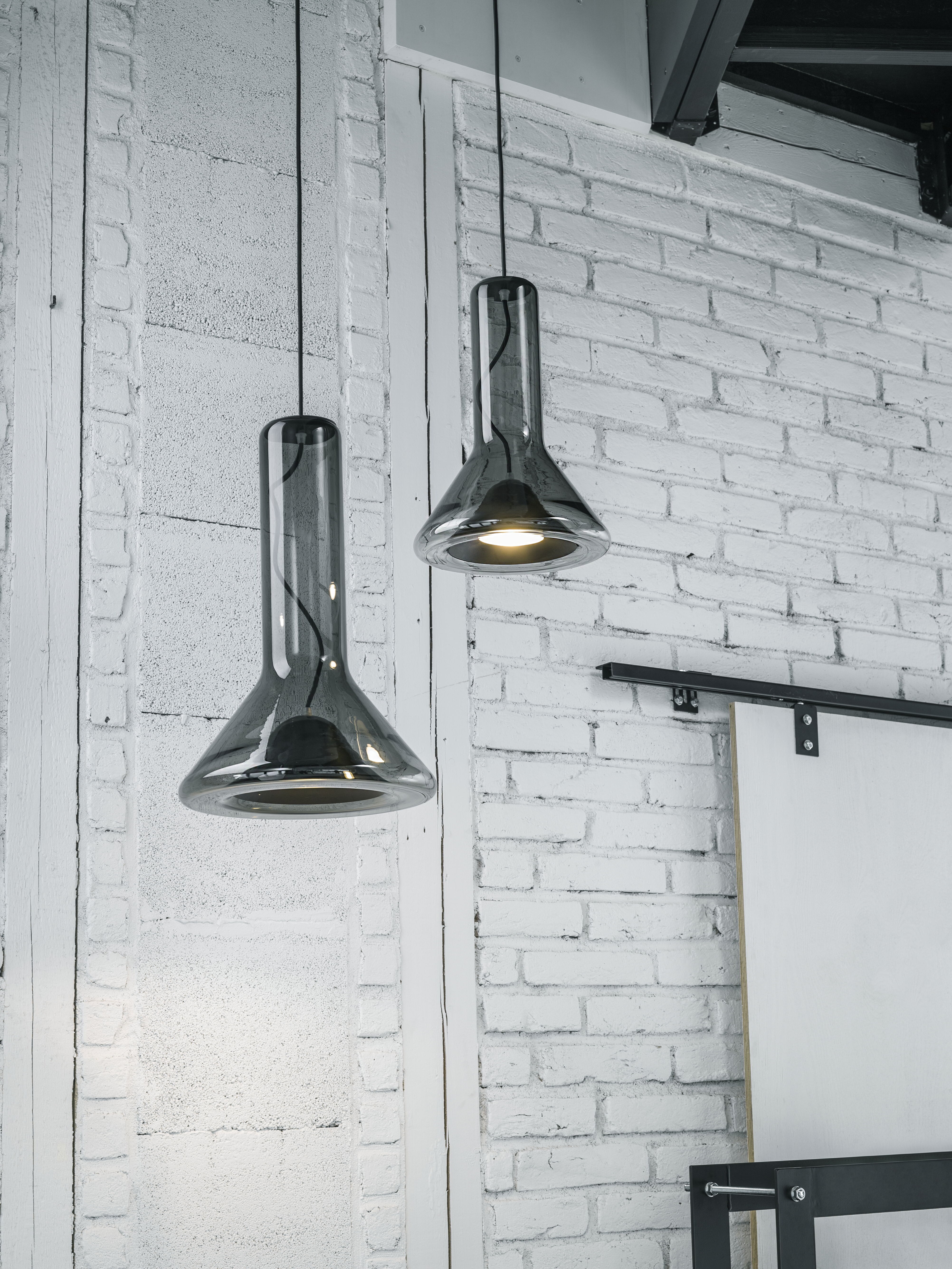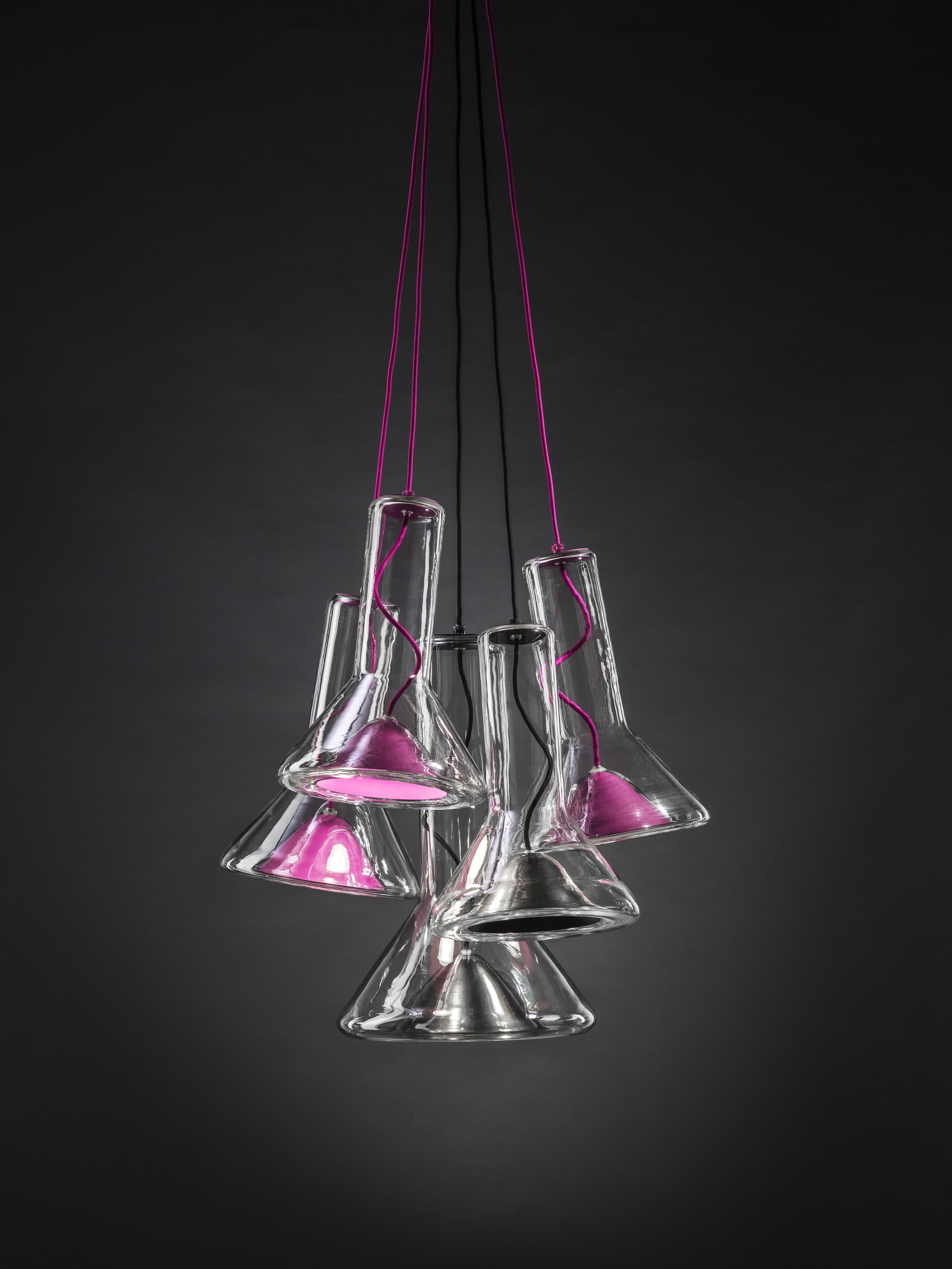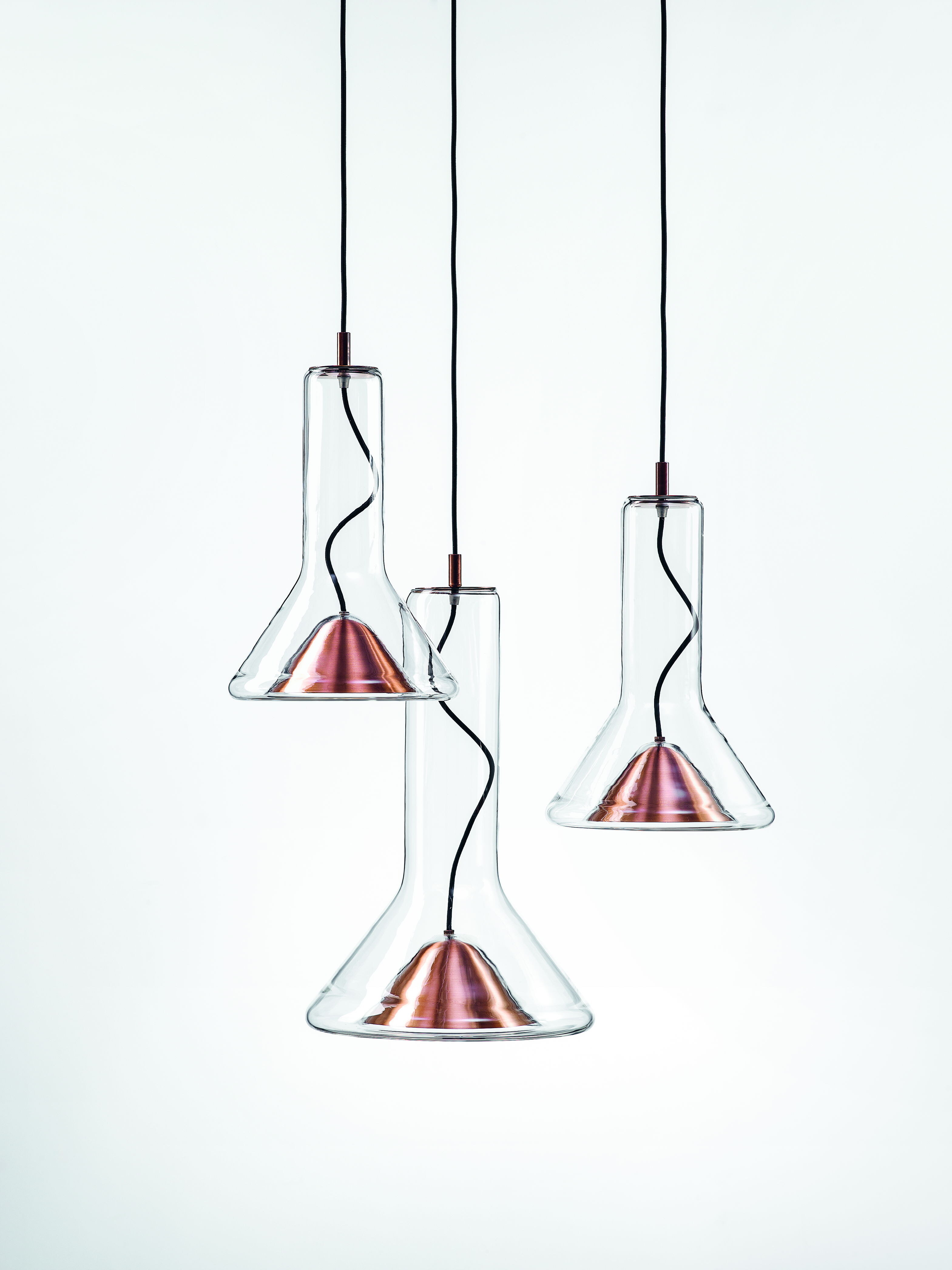 Прозрачный корпус светильника повторяет силуэт конуса света, а выразительный точечный источник освещения с металлическим экраном, изготовленным методом ручной прессовки, образует его условное «сердце». Общая форма и открытый кабель, проходящий вверх через корпус светильника, подчеркивают характер лаконичной и технически чистой конструкции.