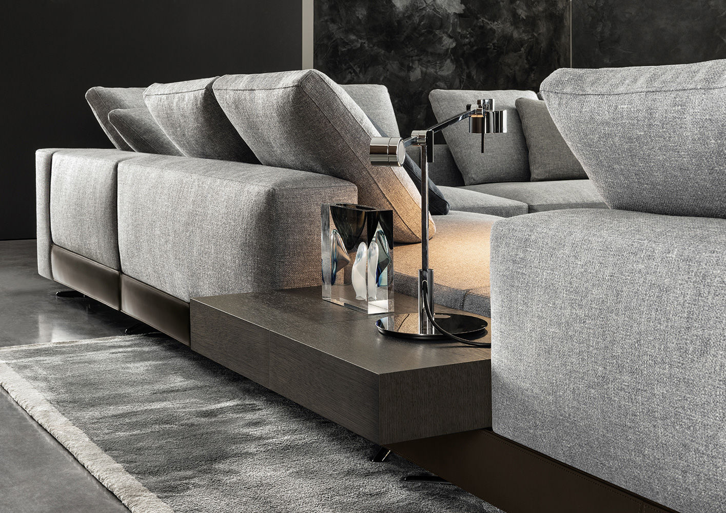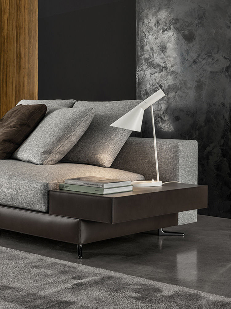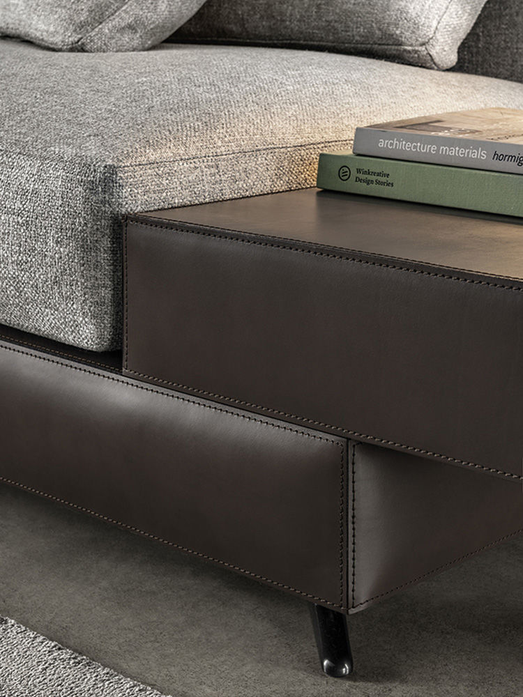 Особенности: эргономичная форма позволяет удобно размещать столик рядом с подлокотником дивана; обтянут натуральной кожей Saddle-Hide, что подчёркивает премиальный характер модели.