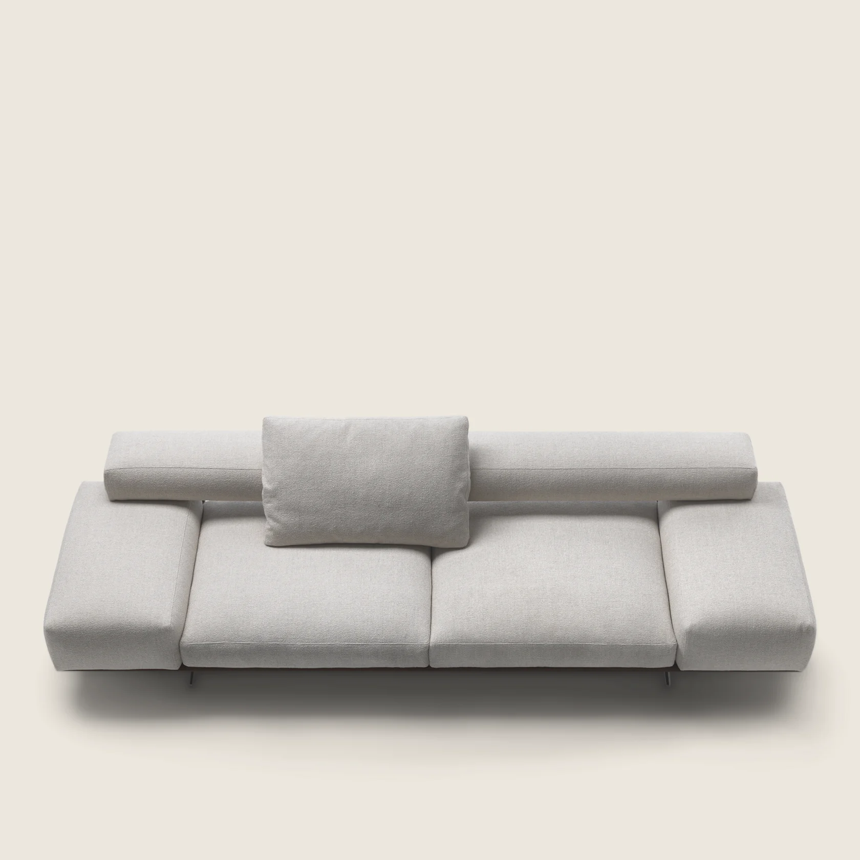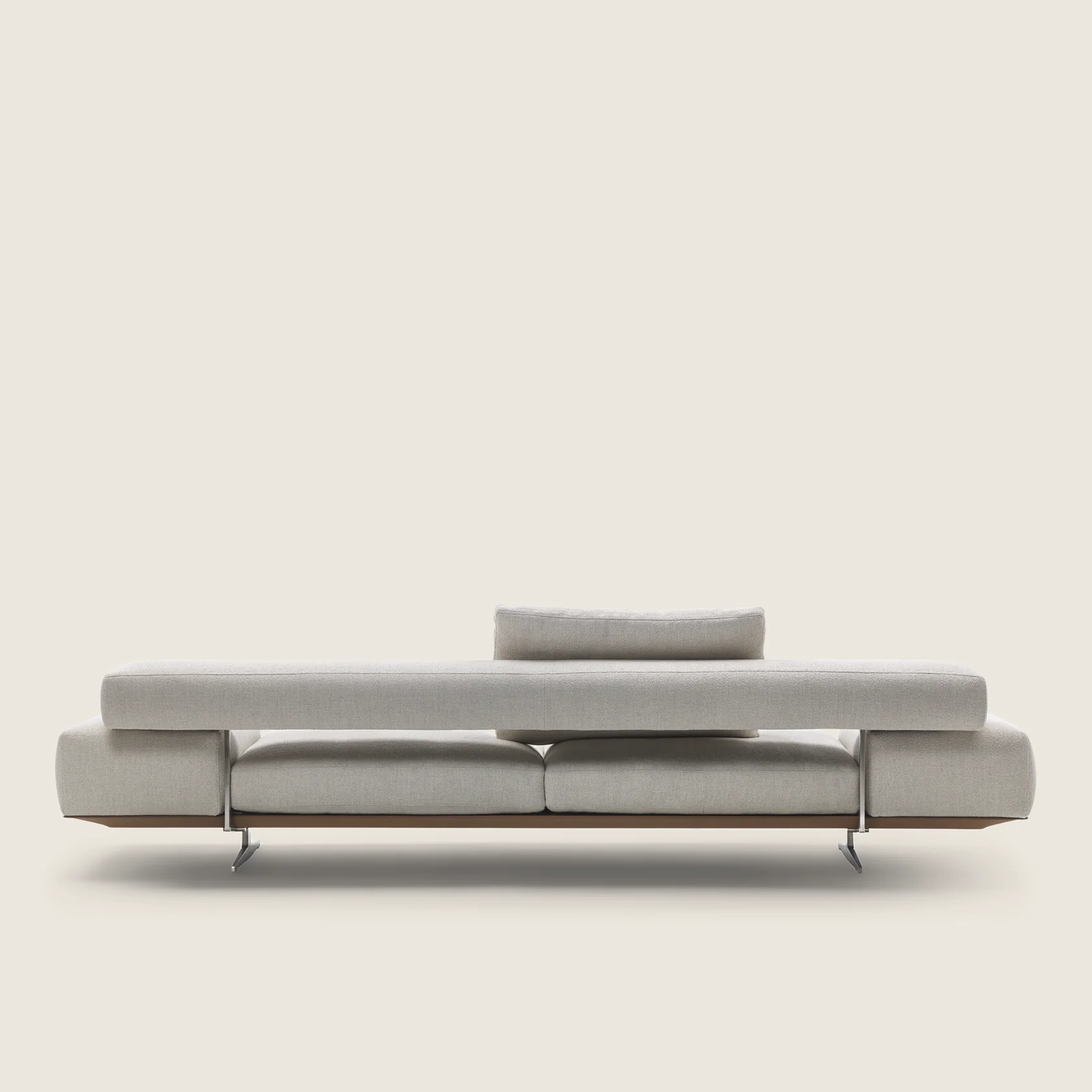 Каркас из металла, покрытого кожей, с опорами и спинкой из алюминия. Подушки наполнены пухом. Обивка съемная, доступна в ткани или коже.
