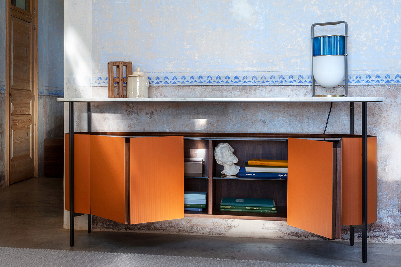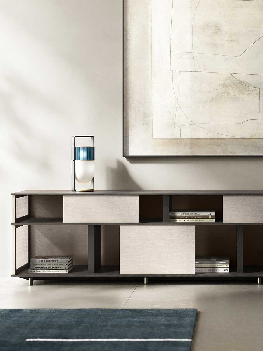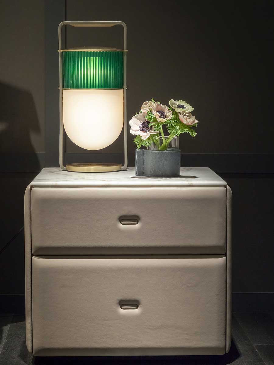 Лампы Xi из выдувного стекла и кожи, словно фонари, словно колышутся в пространстве. Светильник состоит из двух элементов из выдувного стекла. Внешний слой стекла с характерной ребристой поверхностью прозрачен и доступен в янтарном, изумрудном, сапфировом или лунном цвете. Внутренний слой, белый с перламутровым отливом, делает свет тёплым и рассеянным.