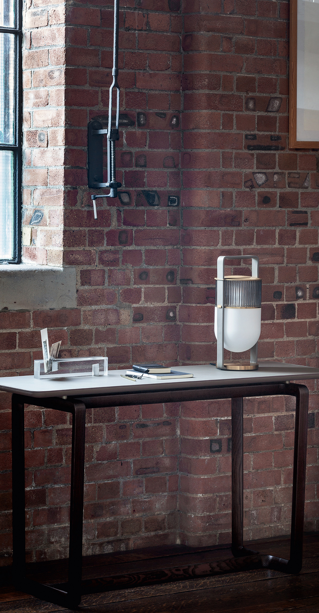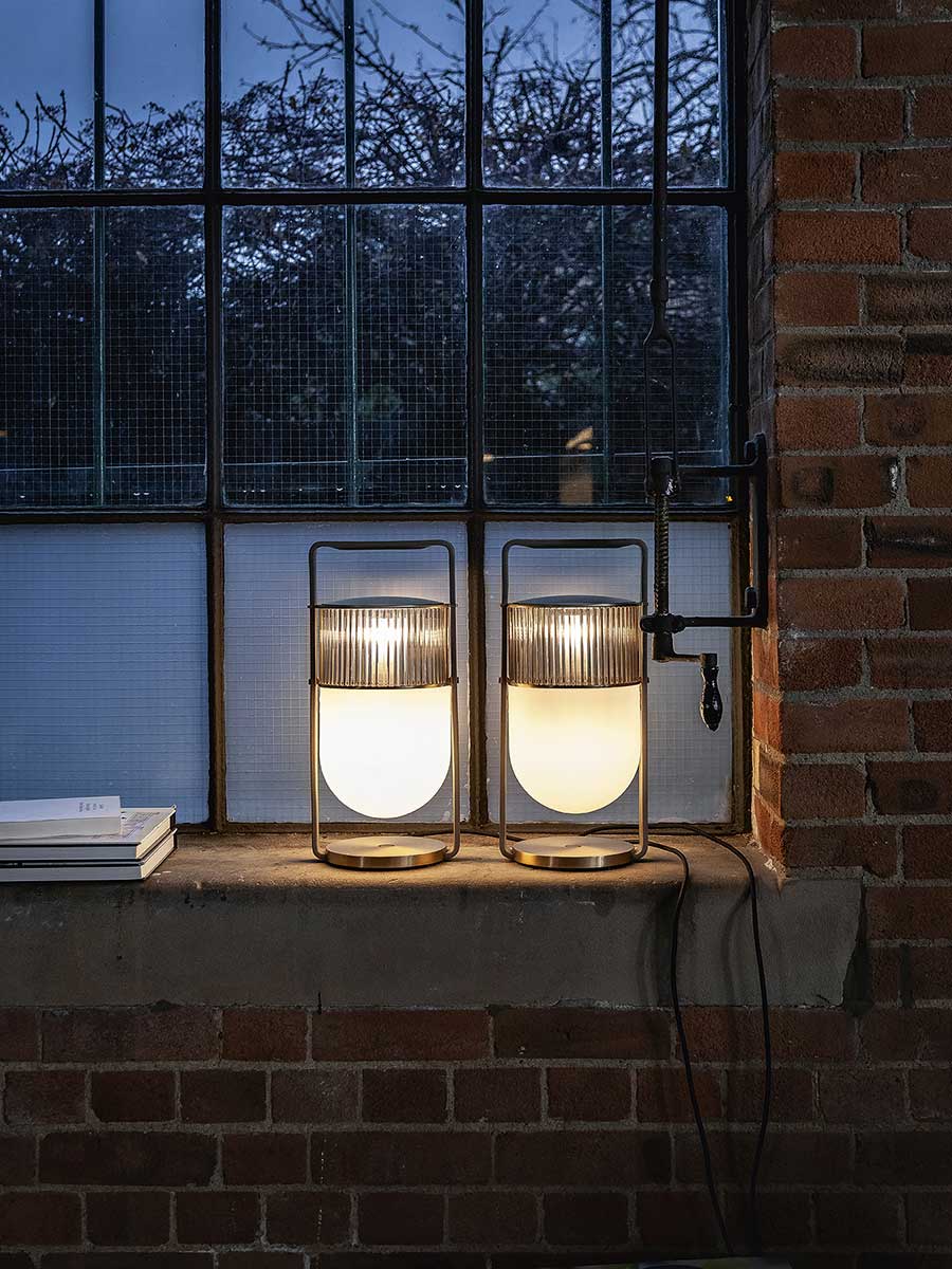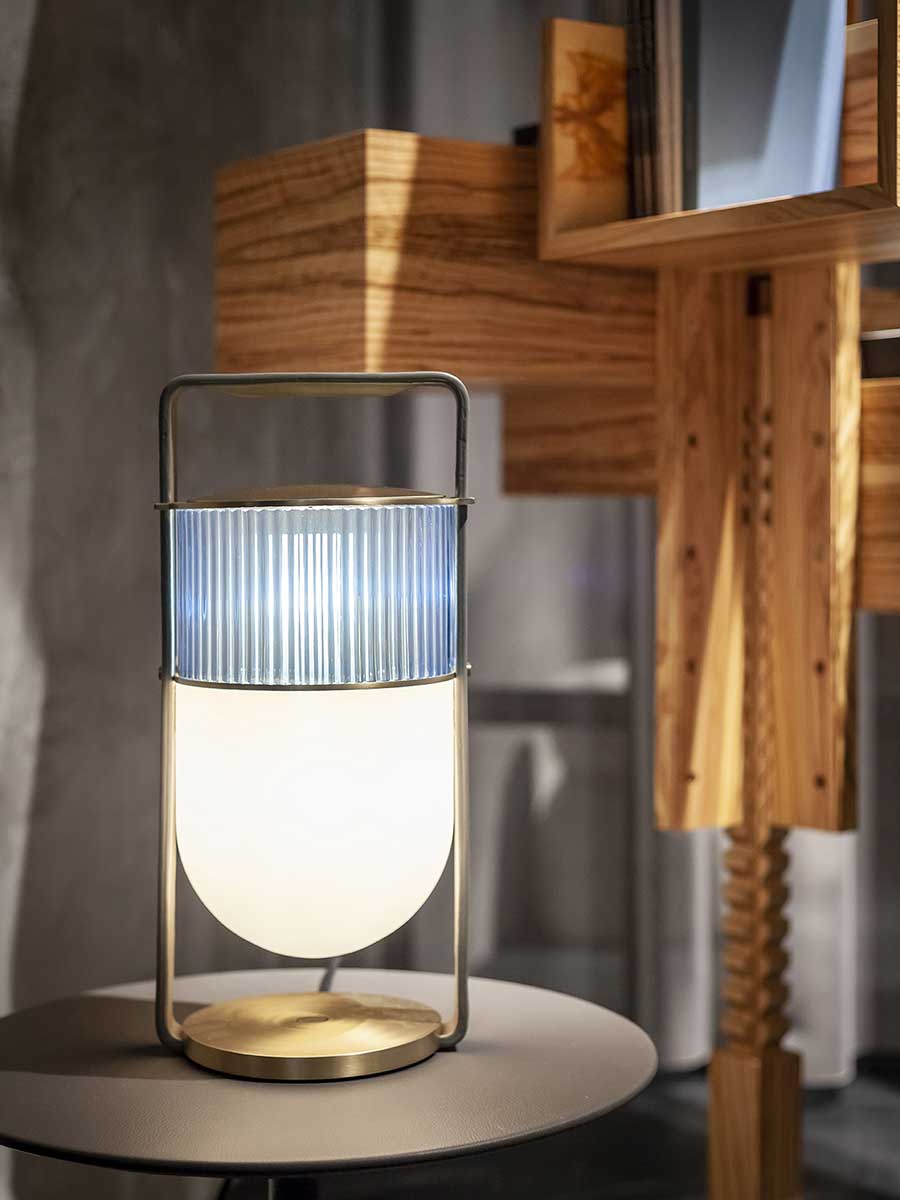 В версии настольной лампы светильник представляет собой большой фонарь на металлическом основании с отделкой из натуральной латуни. Кожаный ремешок Cuoio Saddle Extra служит для крепления лампы и может использоваться в качестве ручки при её перемещении. Яркость света регулируется с помощью сенсорной системы включения/выключения.