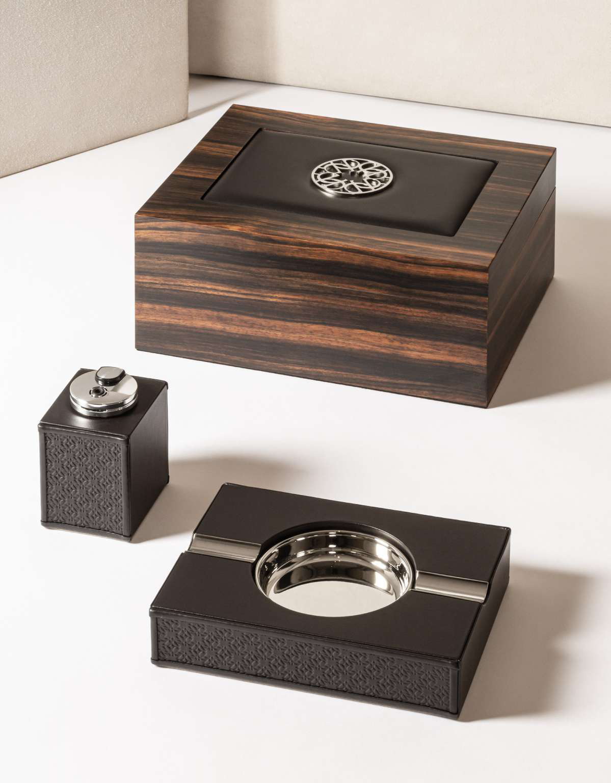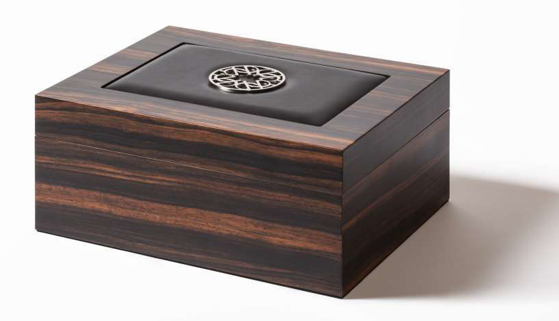 Гумидор для сигар из эбенового дерева Macassar с мягкой кожаной вставкой, украшенной тиснением ELIE SAAB Monogram в полированном палладии. Внутренняя часть облицована кедровым деревом, обеспечивая оптимальные условия для хранения сигар.