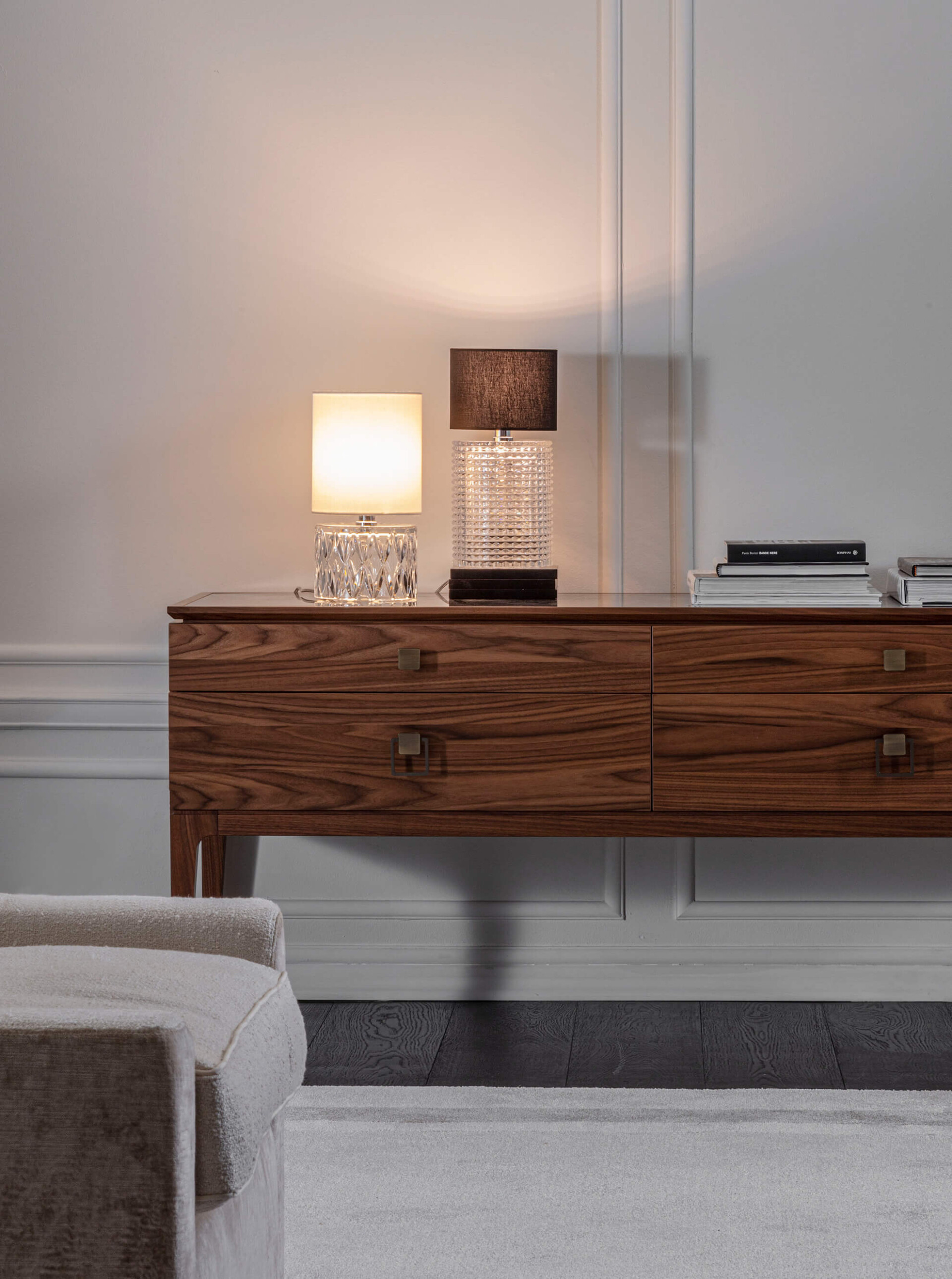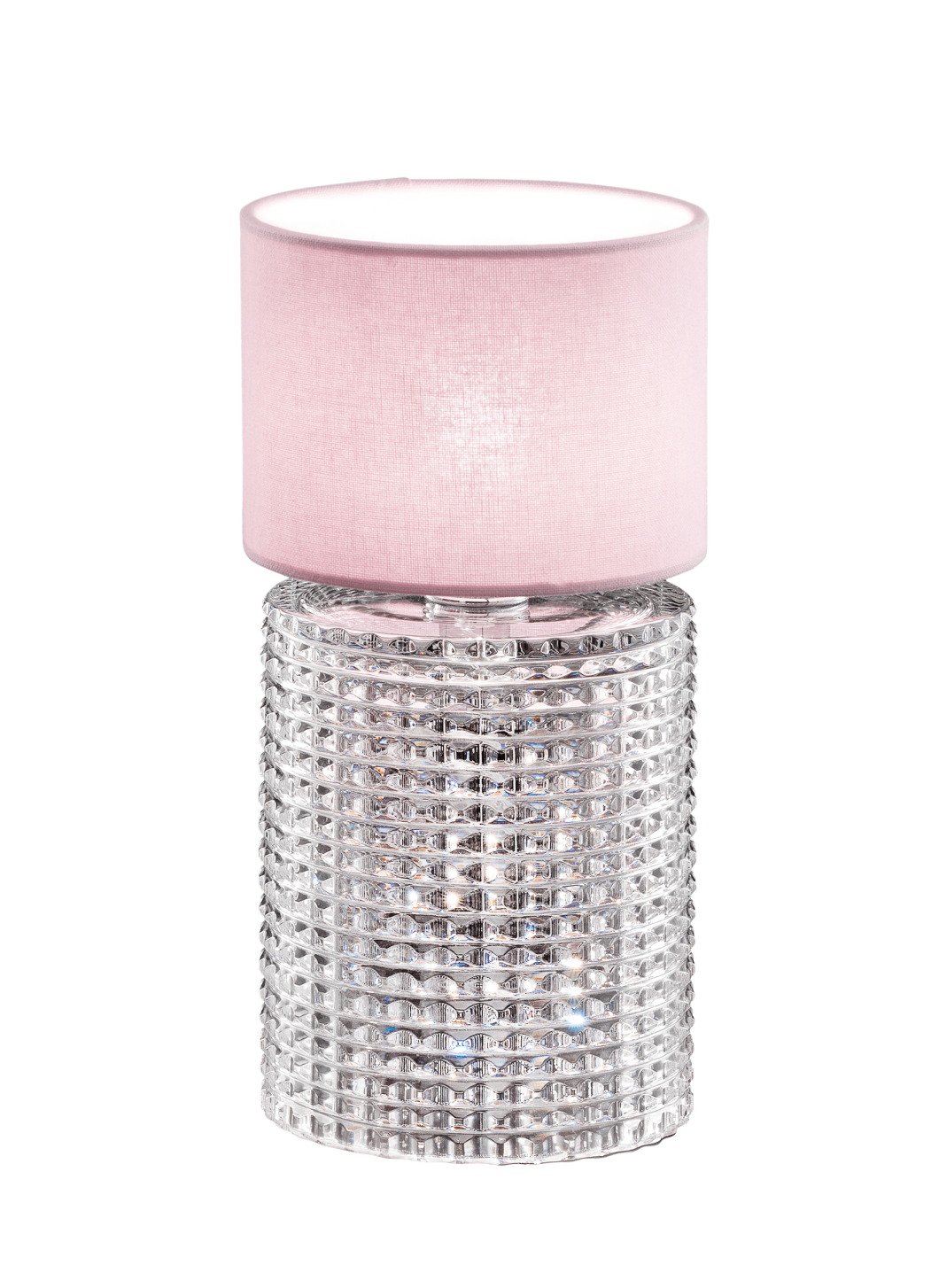 Настольная лампа из хрусталя с хромированной металлической отделкой и тканевым абажуром розового или бордового цвета.